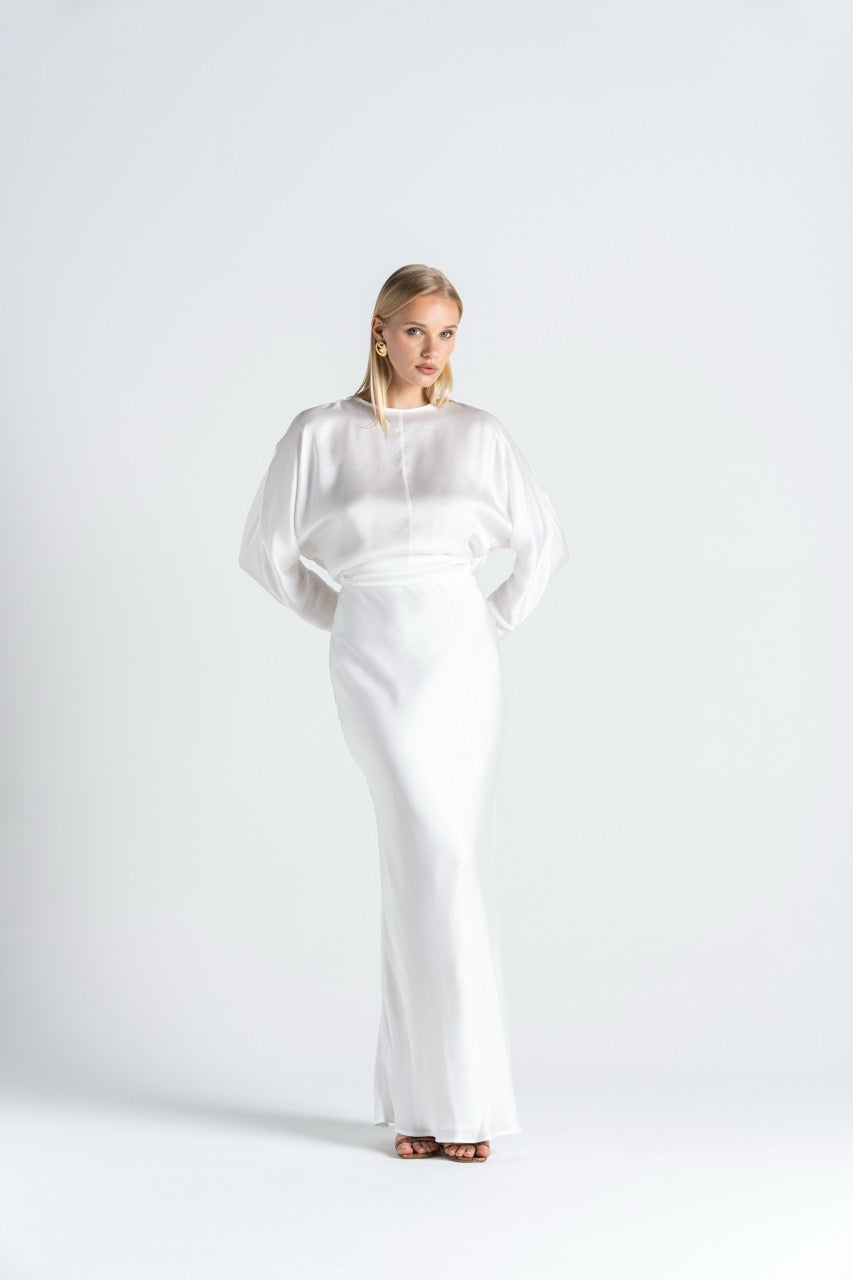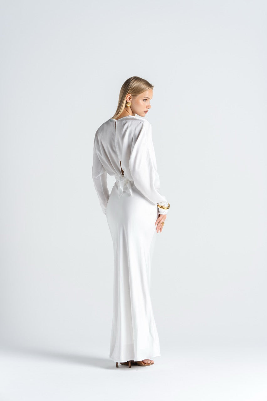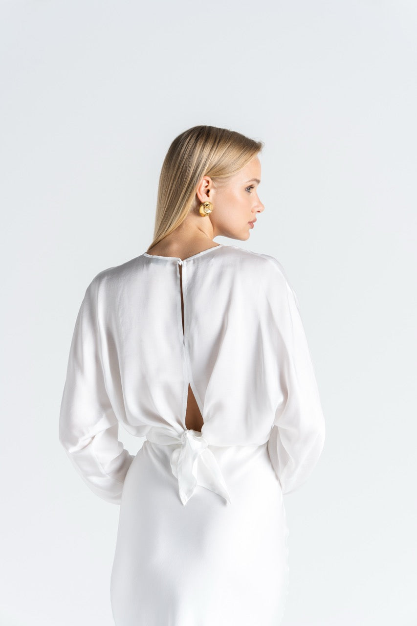 Cut in a smooth satin-like fabric, it features a clean front silhouette with long, gently draped sleeves, but the back is where the story shifts.