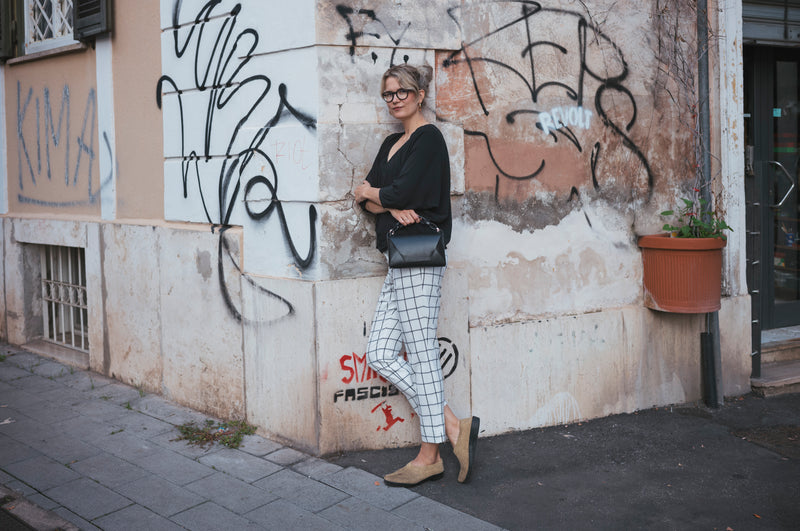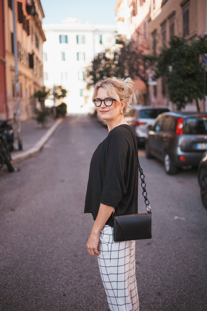 Suave like Sunday at the Ritz, this handbag also works on a weekday. Available in nickel details, it snaps shut magnetically, has two compartments, a card pocket, and a long, carabined strap.