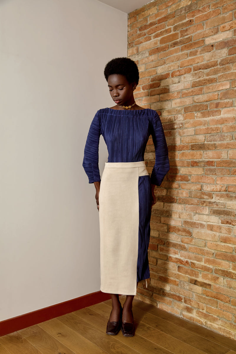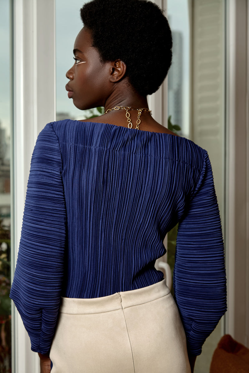 This blue pleated top combines balloon sleeves with a boat neckline for a unique, modern silhouette. Also available in white.