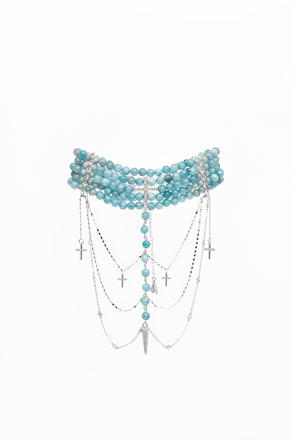 Necklace made from blue quartz. Fittings from brass with golden or silver plate, pendants with zircons.