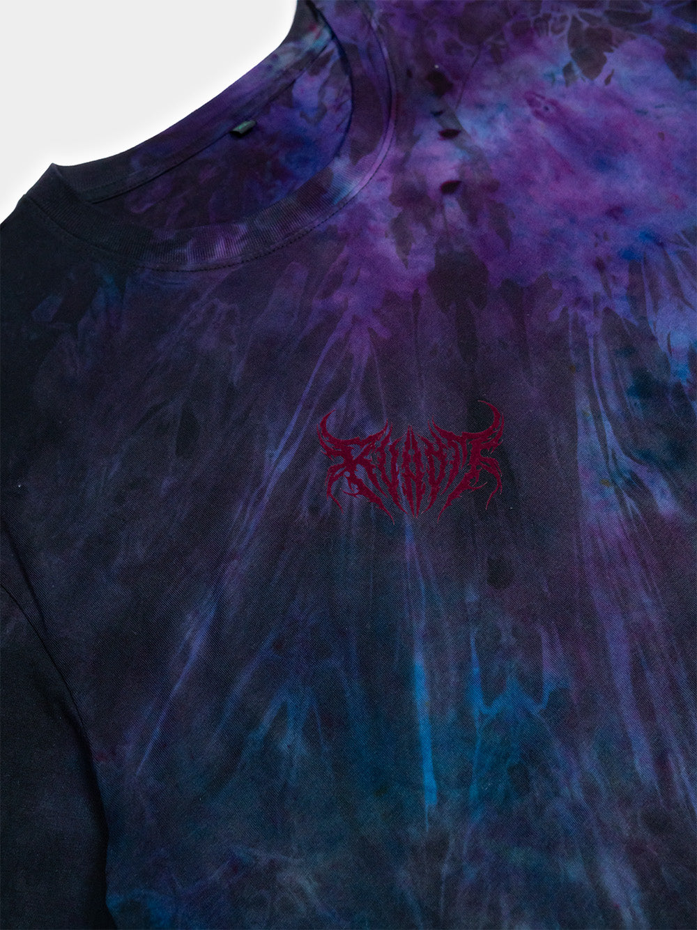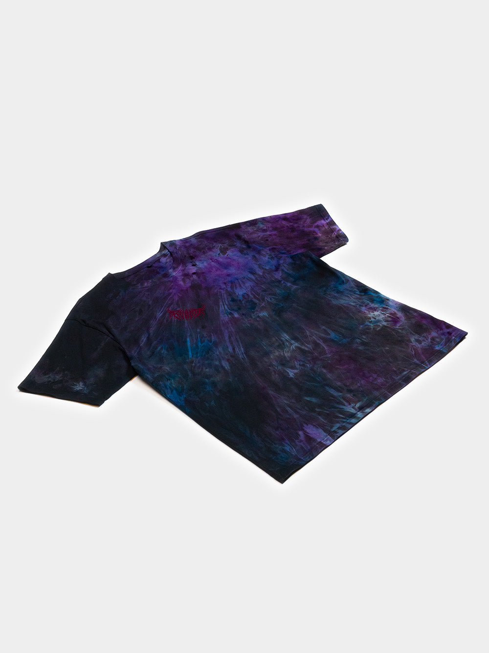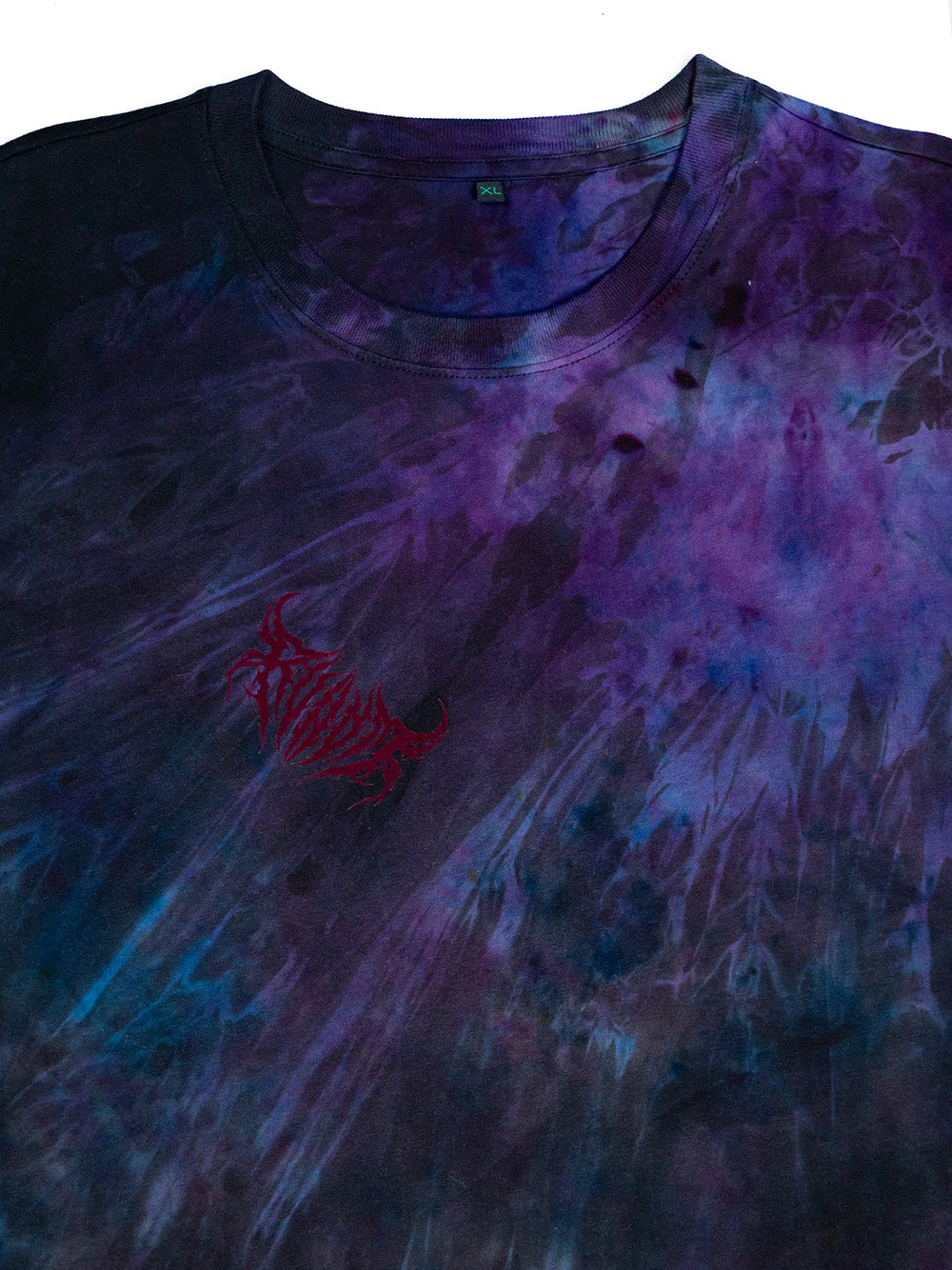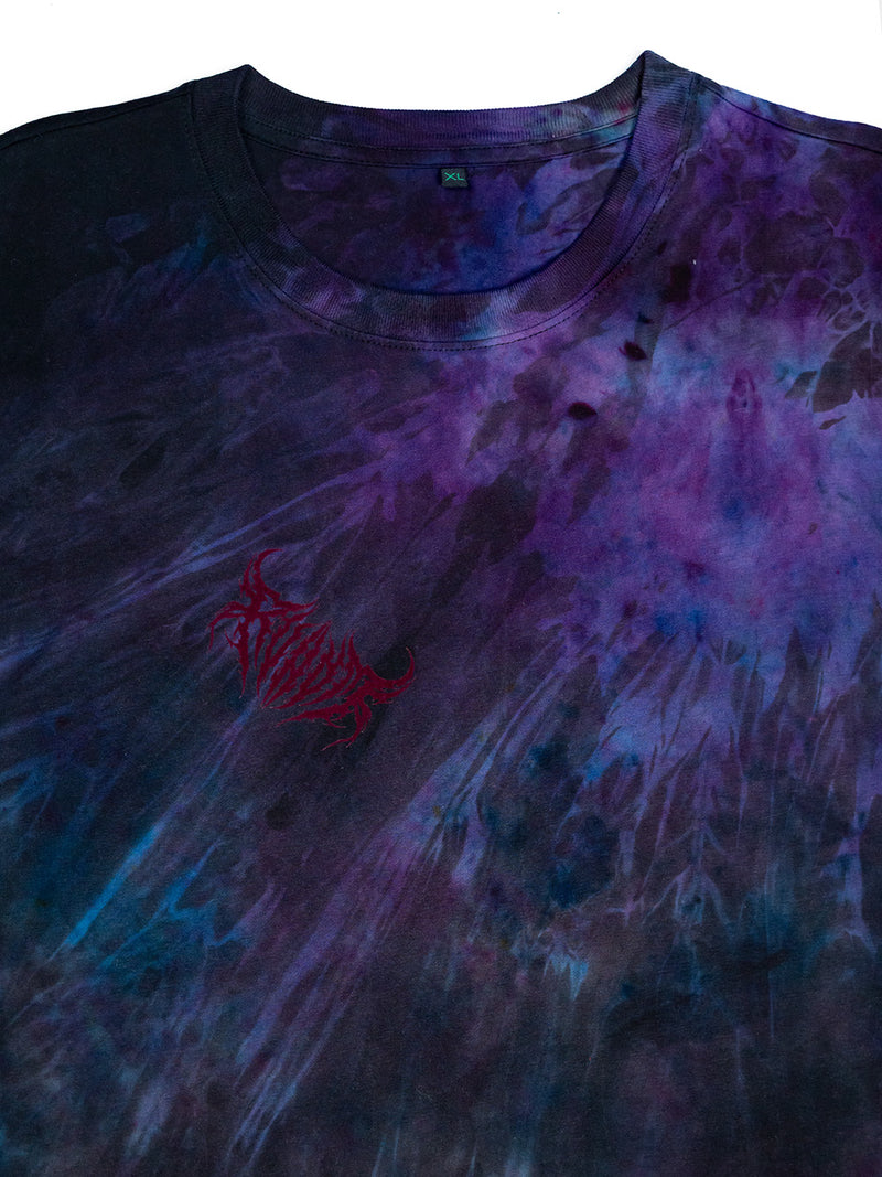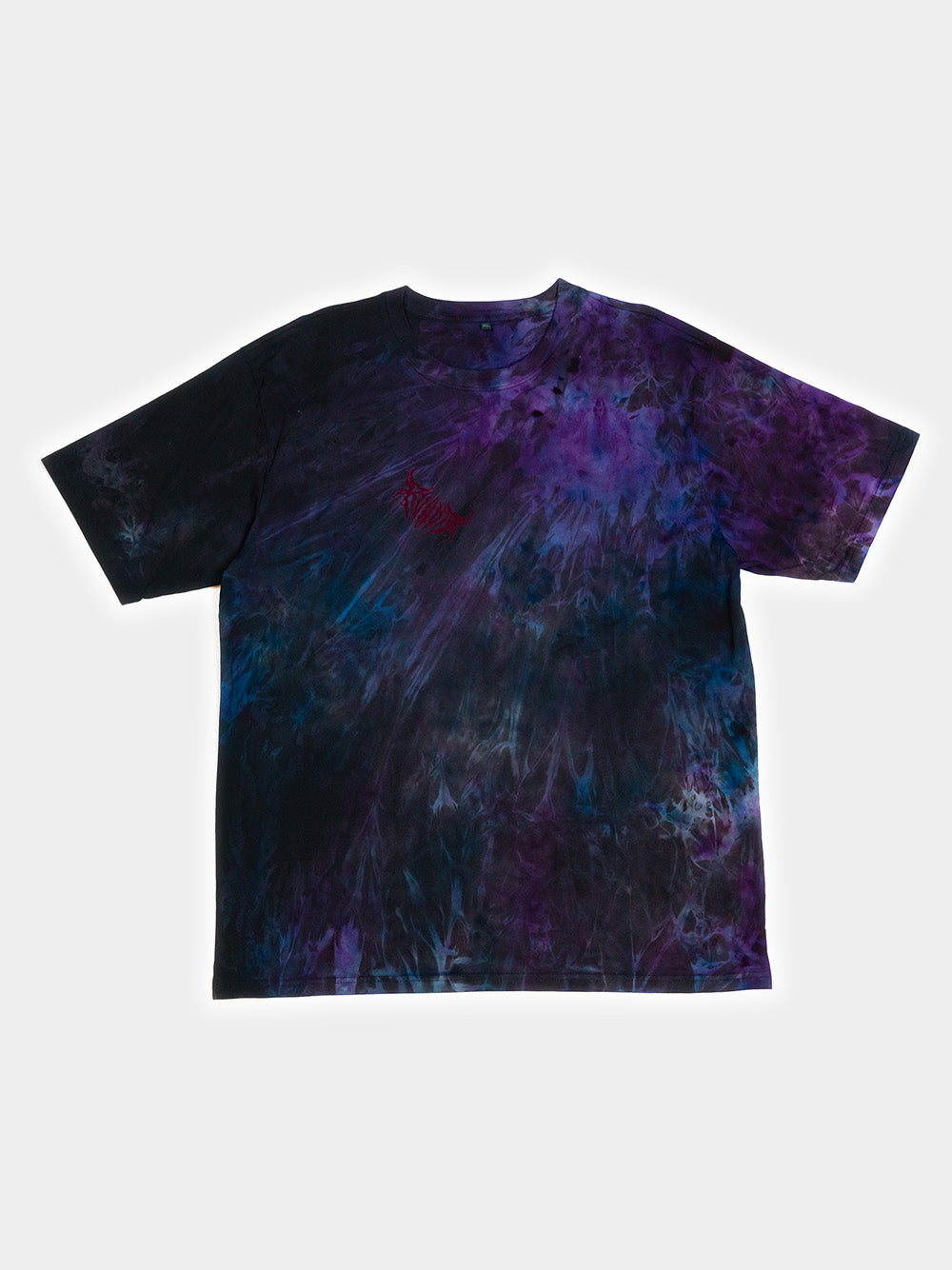 Randomly dyed T-Shirt with a red screenprint on the front and back.