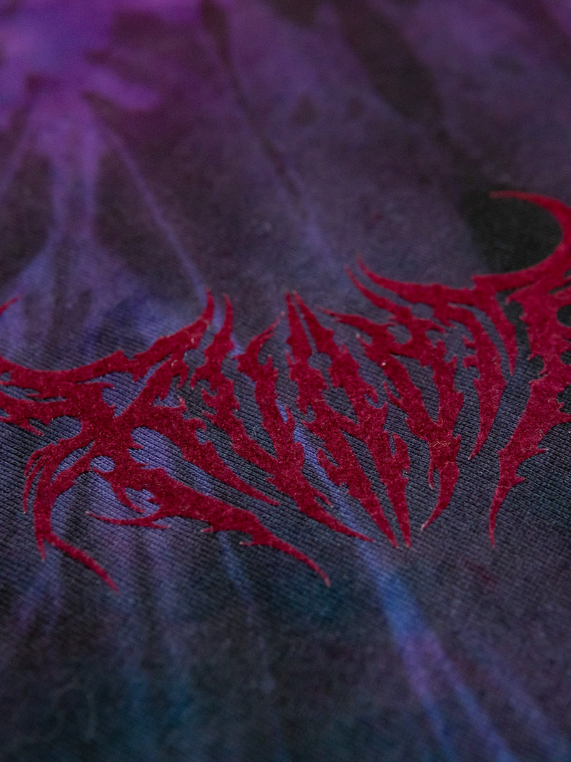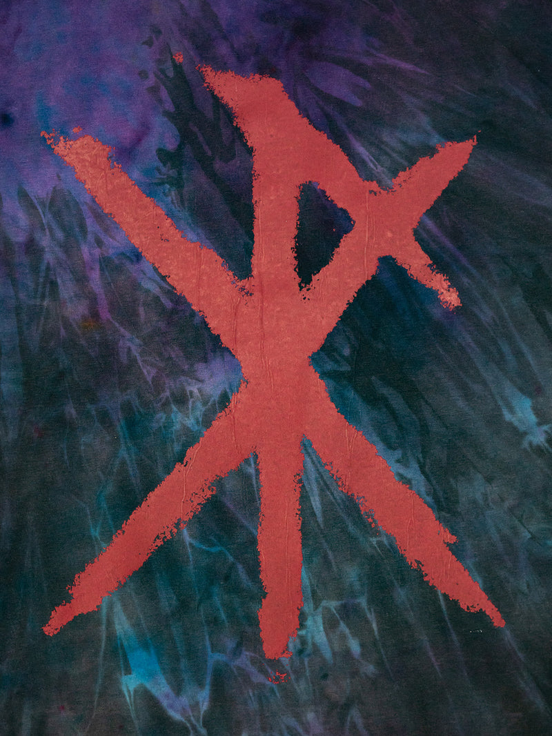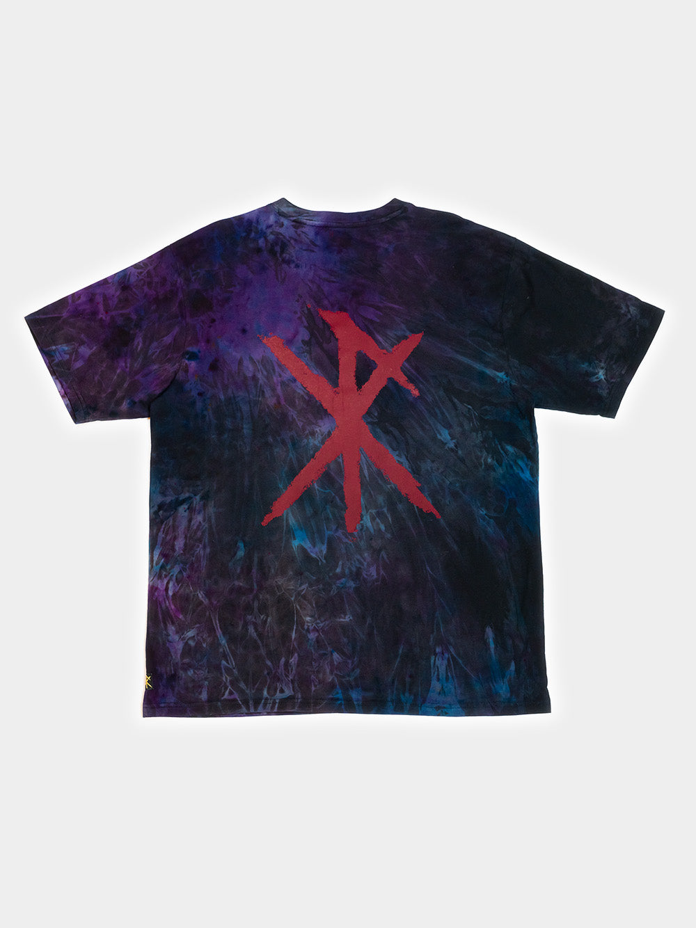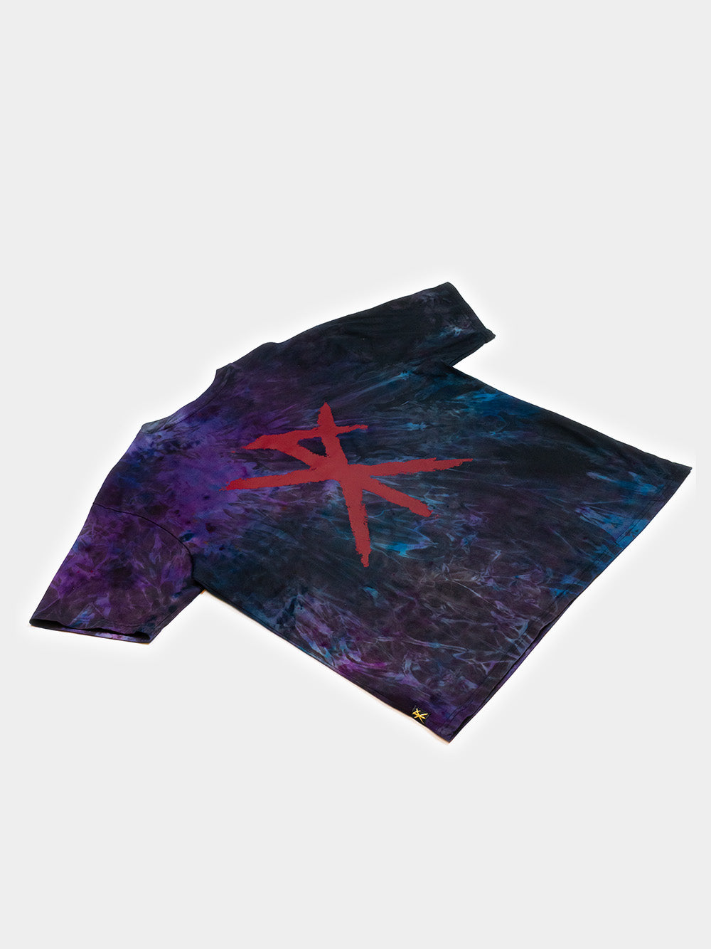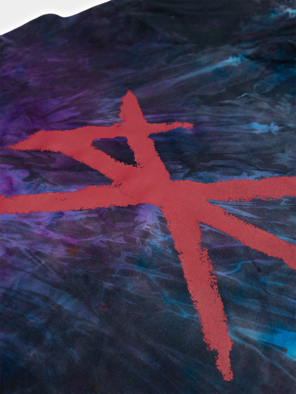 Randomly dyed T-Shirt with a red screenprint on the front and back.