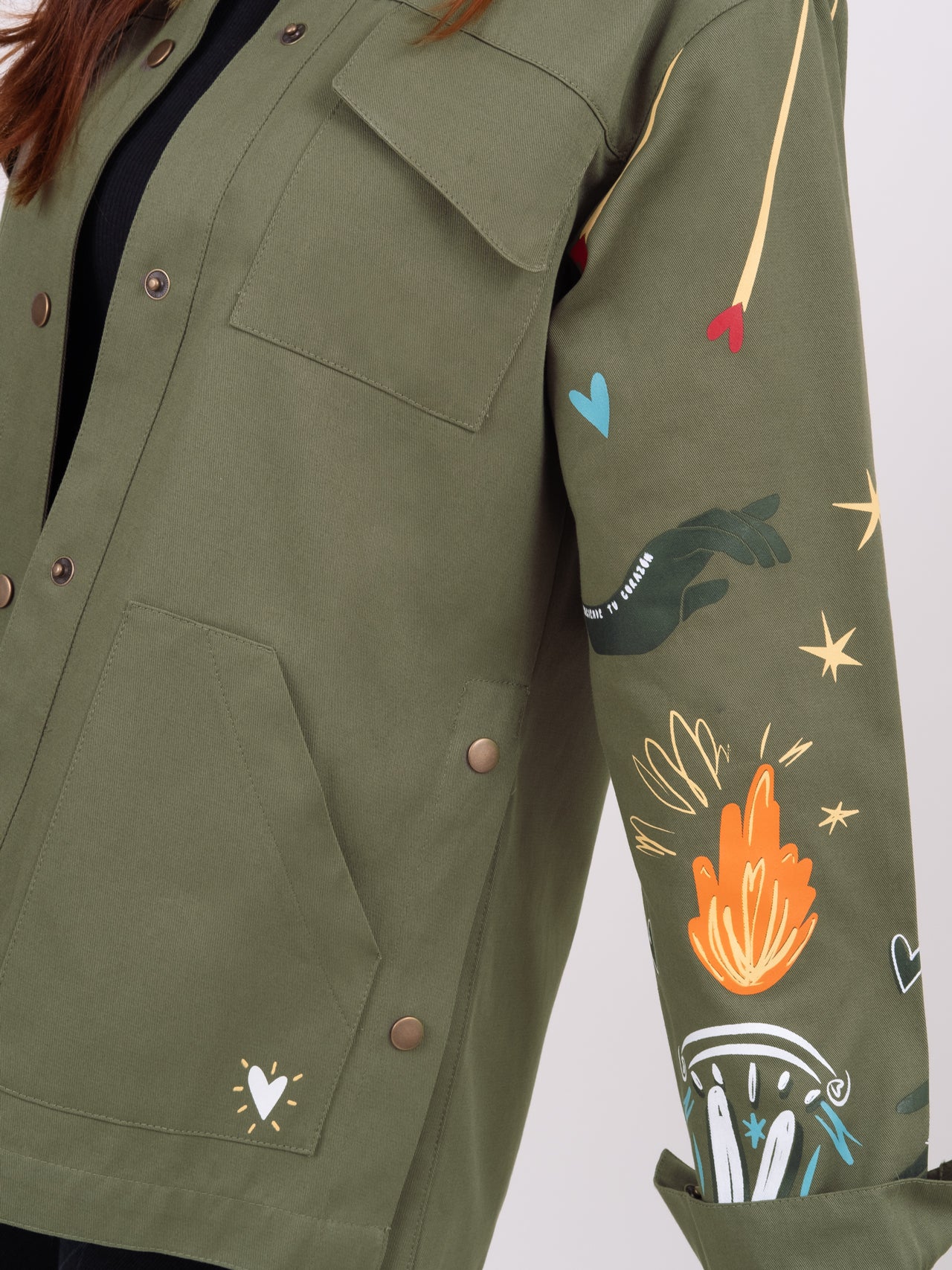 Military green drill jacket with chest and bottom pockets, round neck and long sleeves. Screen printed on sleeves, bottom pockets and back.