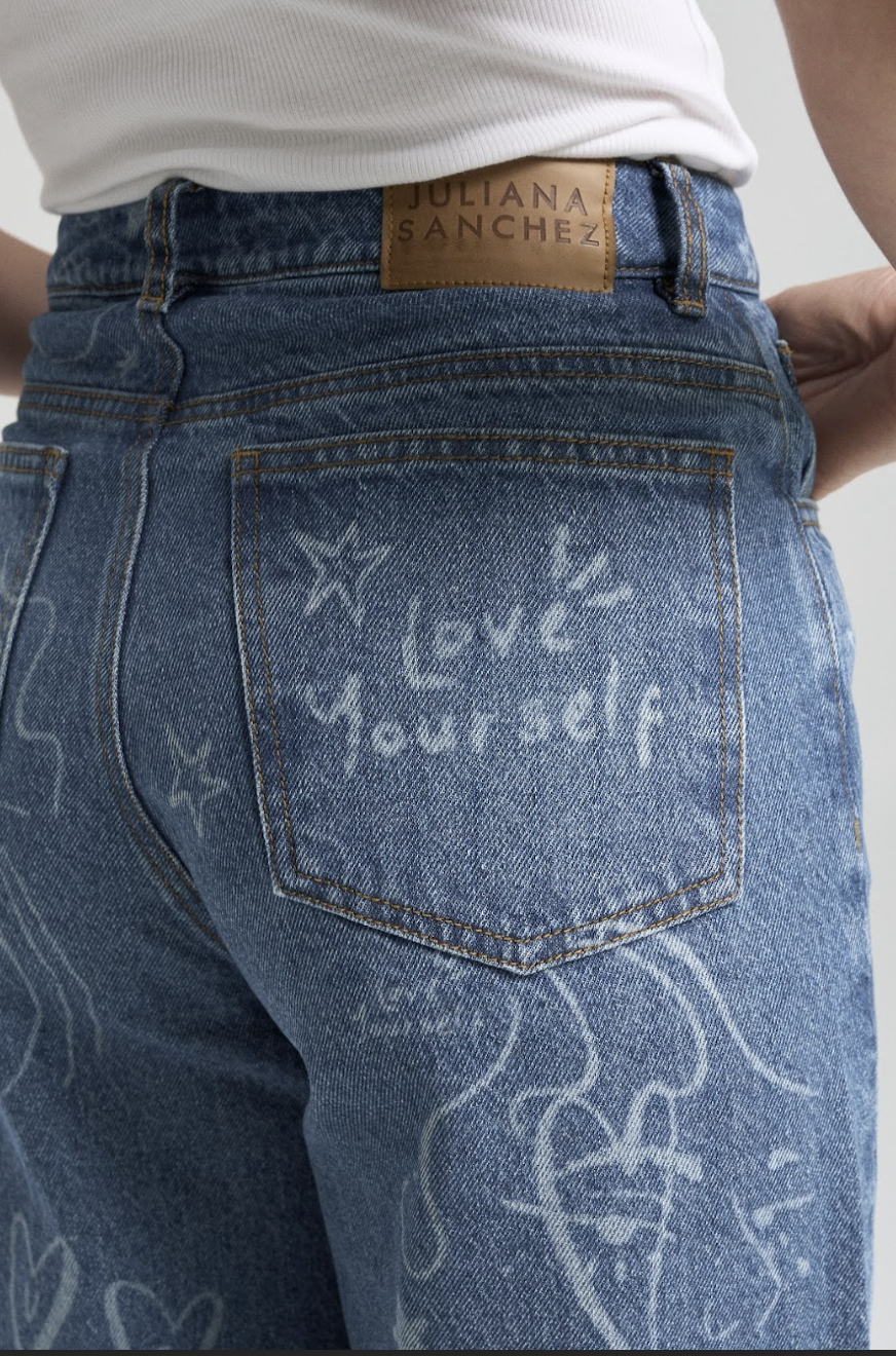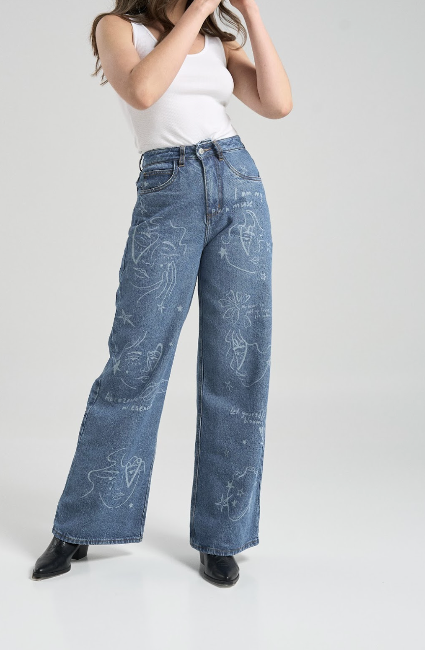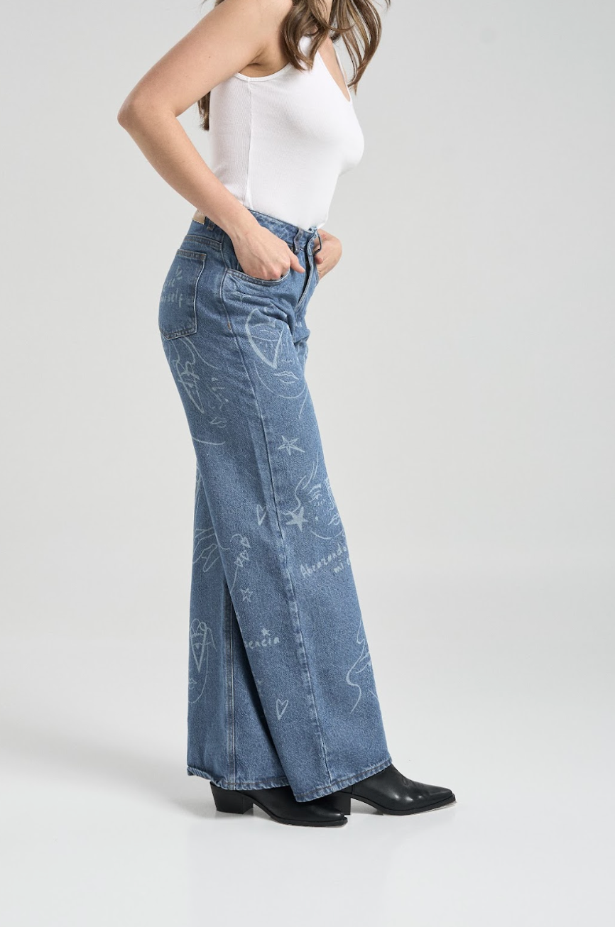 Medium blue jean, wide leg fit with high rise and pockets. The waist and hips fit naturally to the body, with a straight leg.