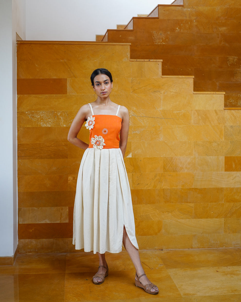 The Shuili Embroidered Midi Dress is like an summer sunset made into a dress. Handmade with khadi cotton and unbleached muslin and dyed with natural plant colours, this dress infuses three heritage art forms together. Handspun and handwoven Kotpad Weave in marsala buti, is hand dyed with aul bark extracts. An authentic, handspun muslin makes the flared, front-slit midi, with hand embellishment of 3D flowers, just like its name. A breezy dress for a day outing or a statement evening, it's a curated addition to your wardrobe. Handmade in 240 hours. 100% Plant-based. Zero-Waste. Ethical.