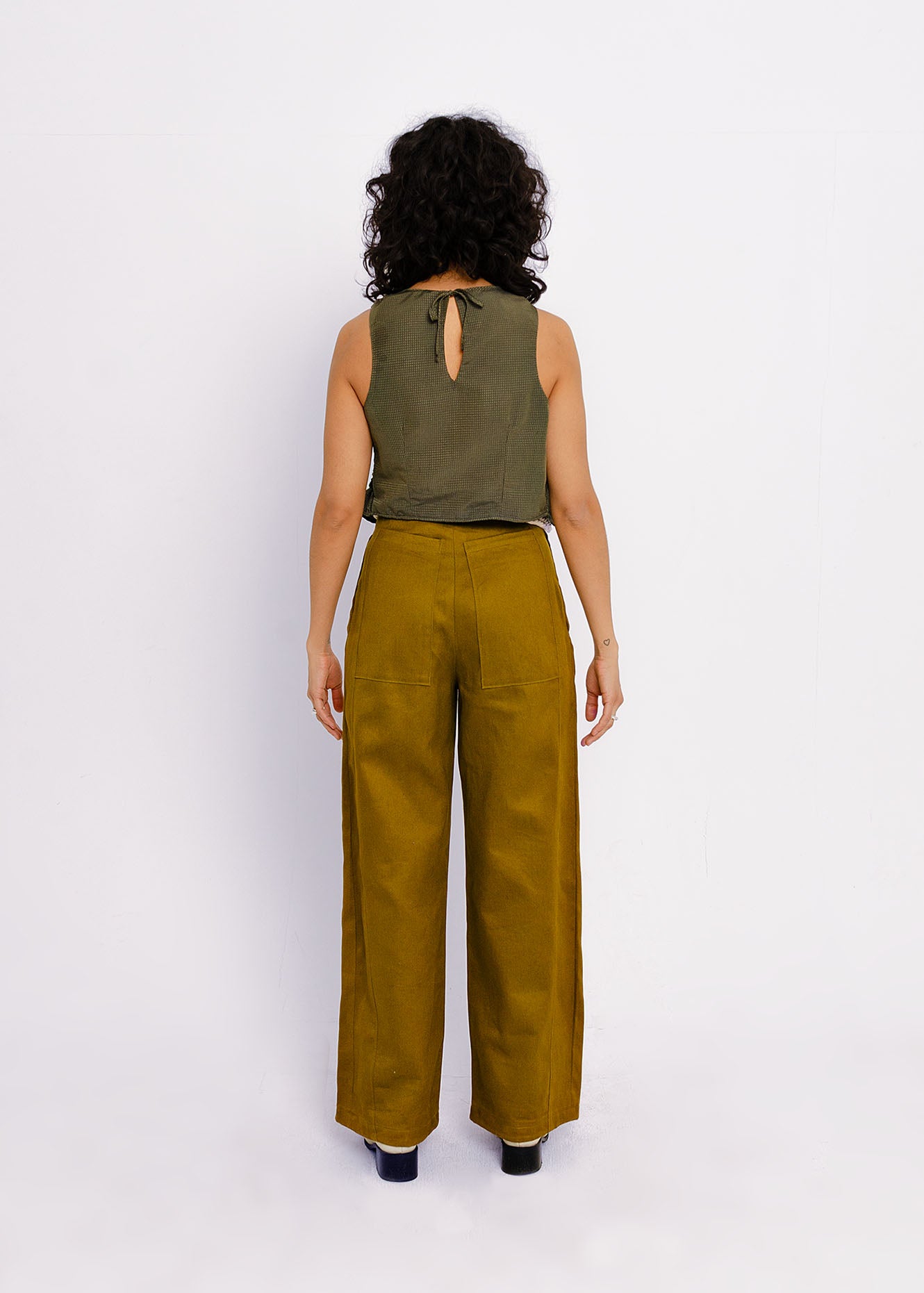 High waisted, wide leg twill pants with exposed centre front zip, hidden side seam pockets and large back patch pockets.