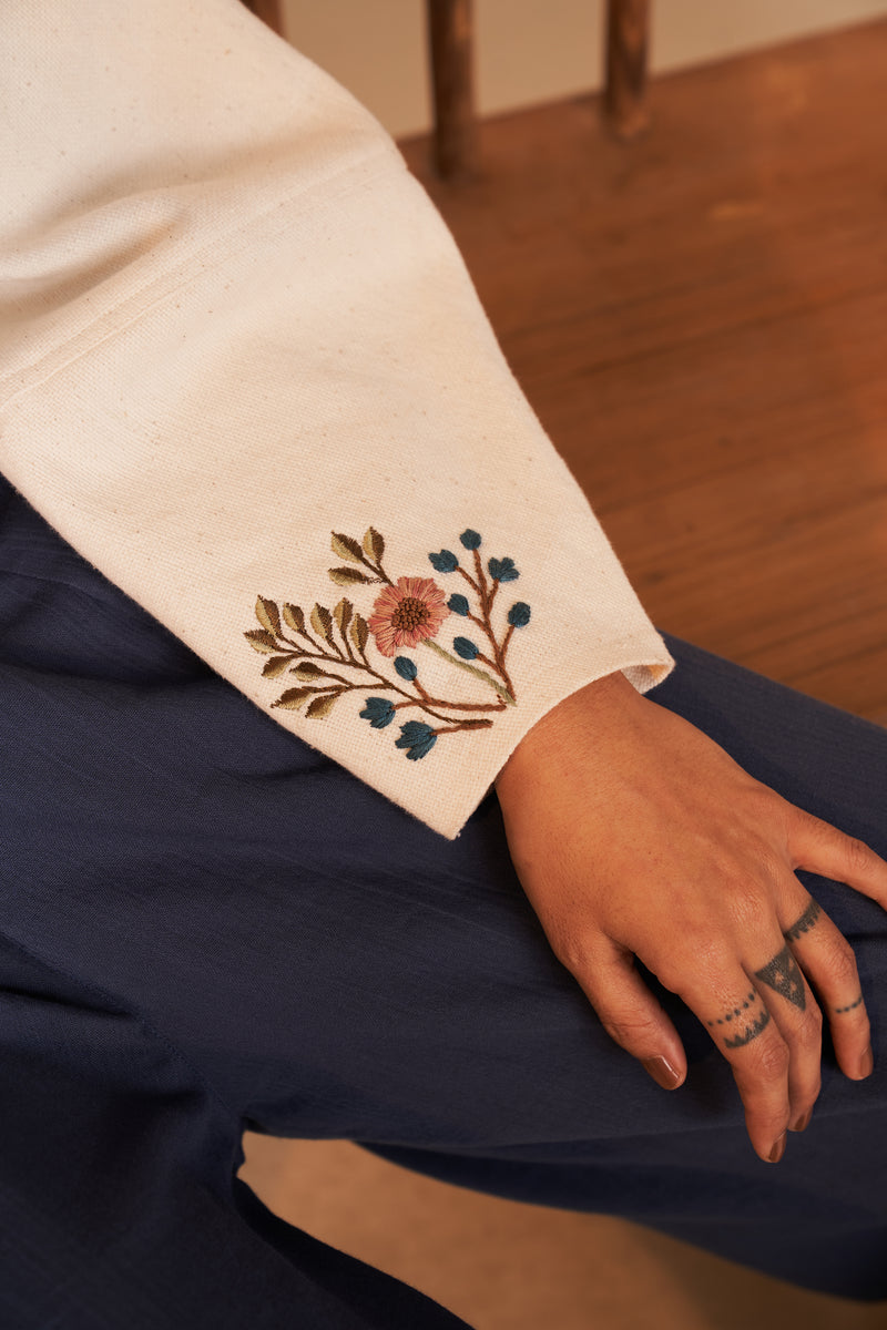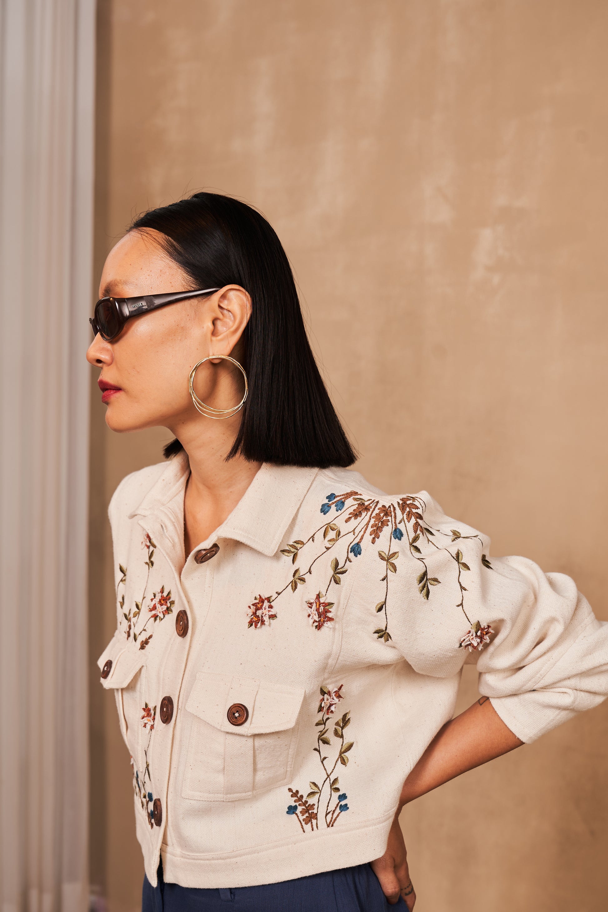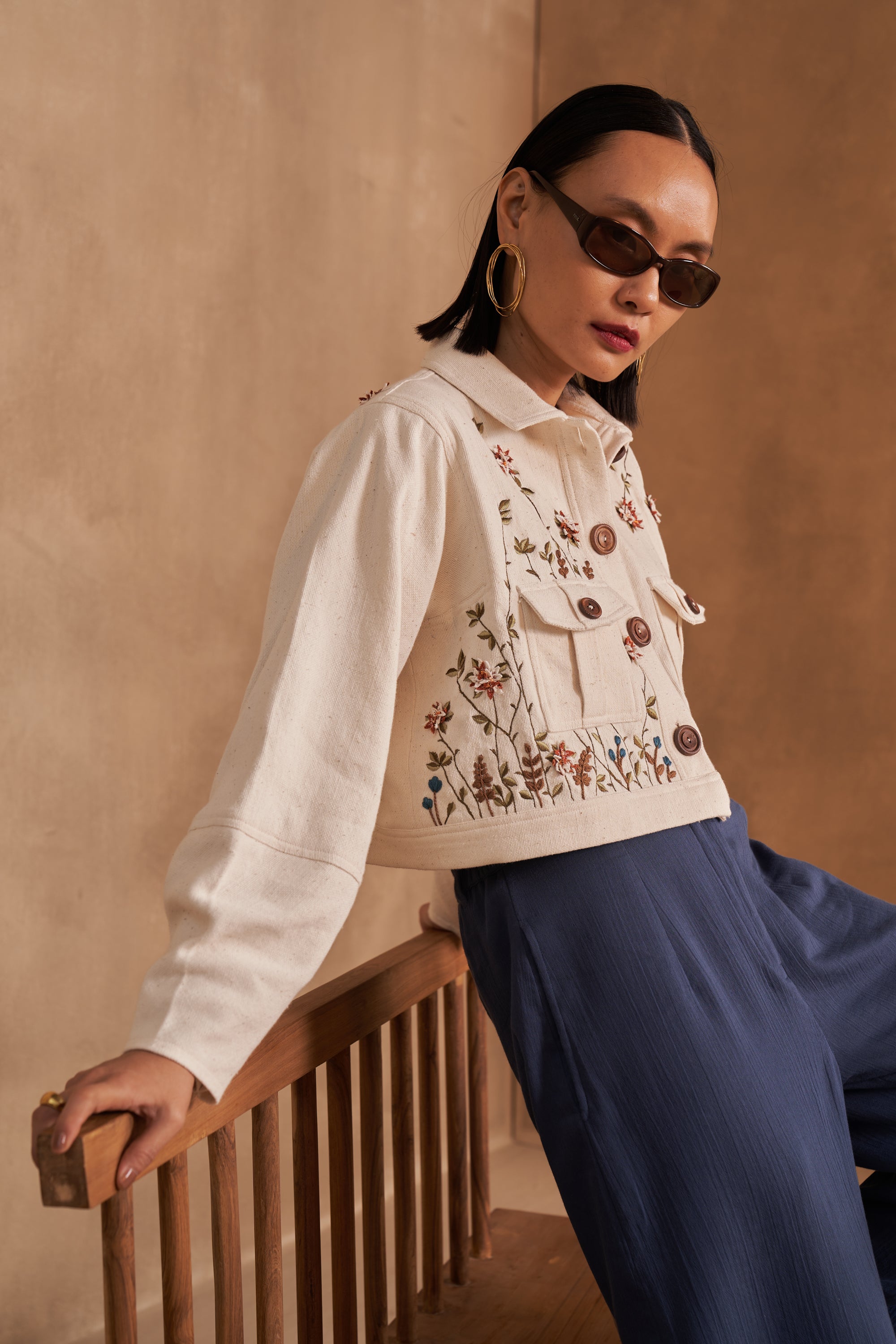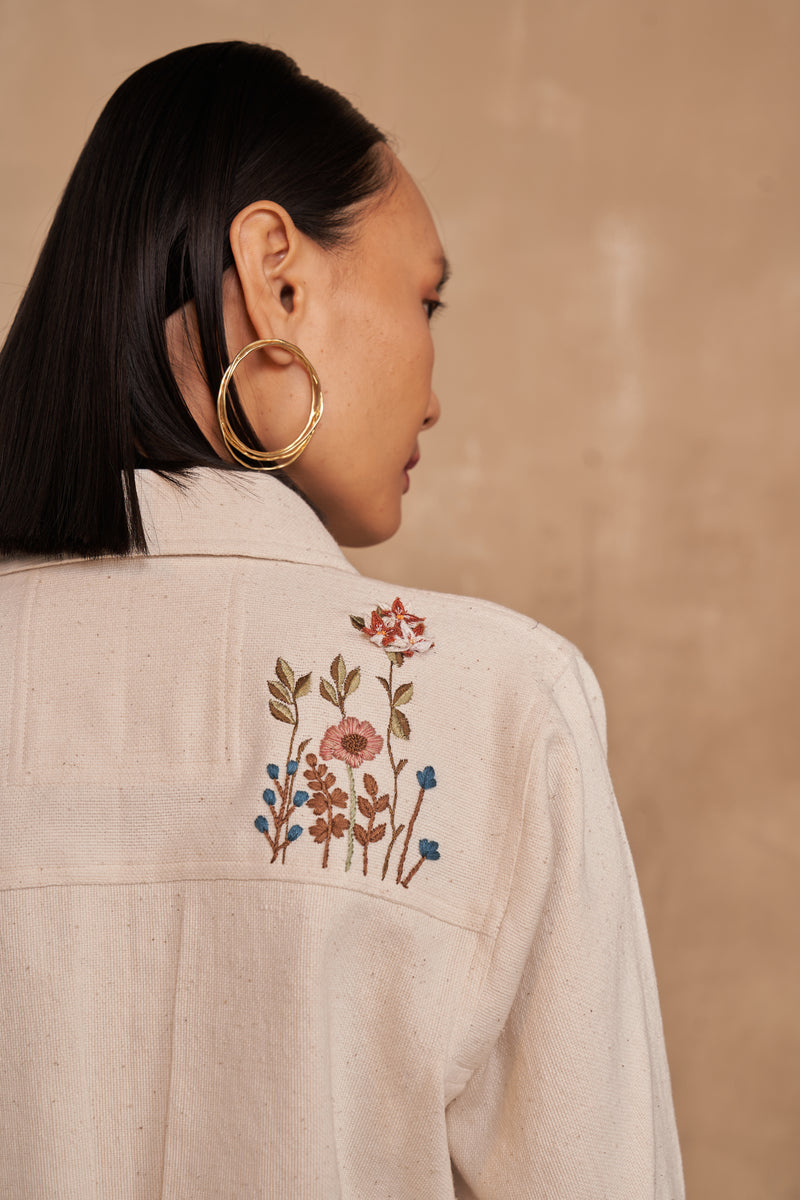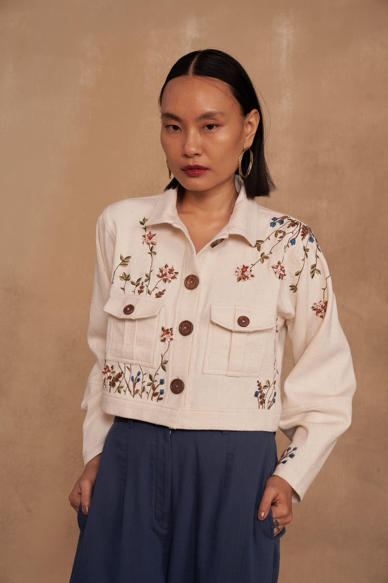 Regular fit, long-sleeve crop jacket that buttons at the front, crafted in handpsun and handwoven organic cotton fabric, machine and hand embroidered with wildflower motifs.