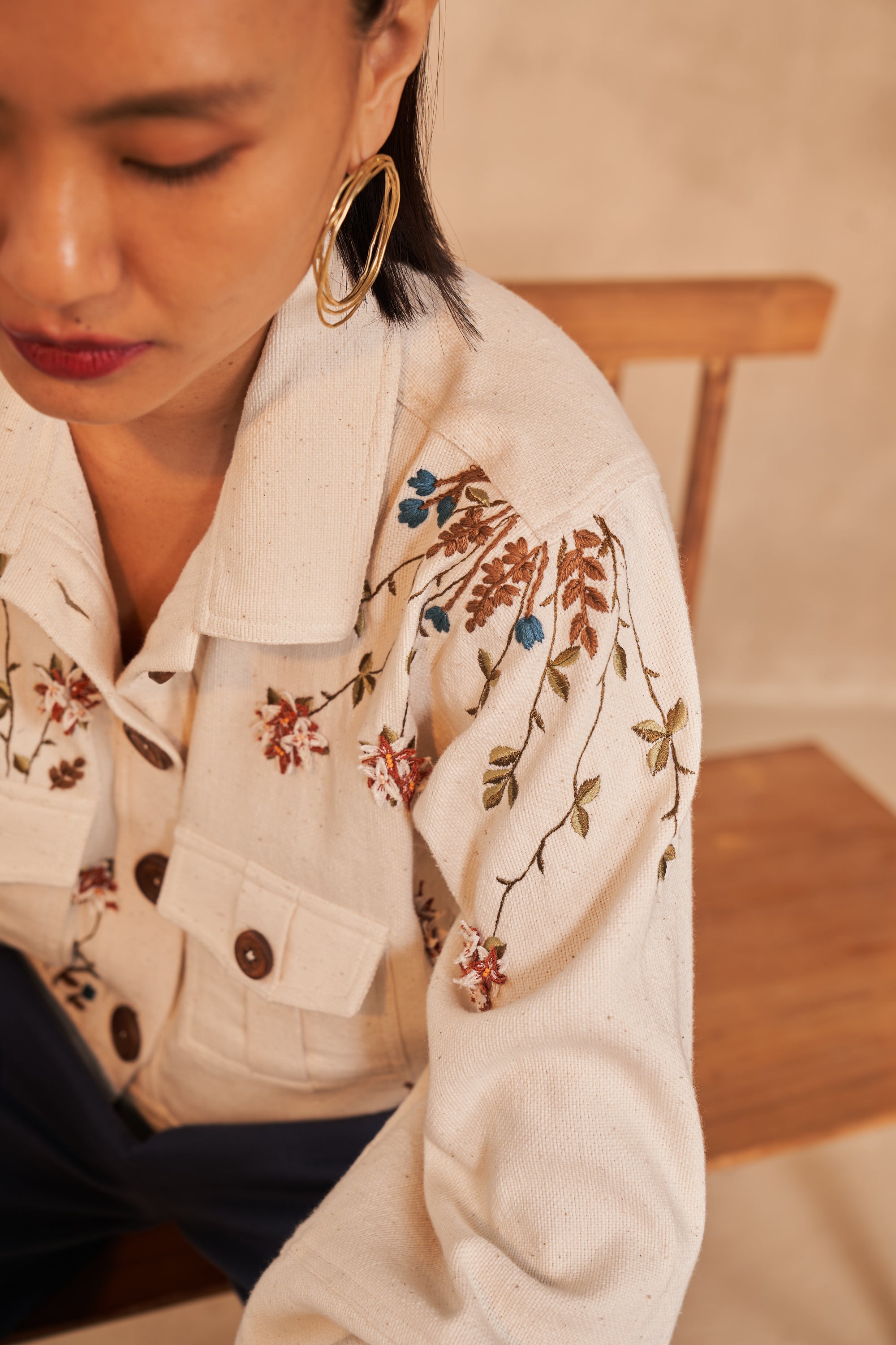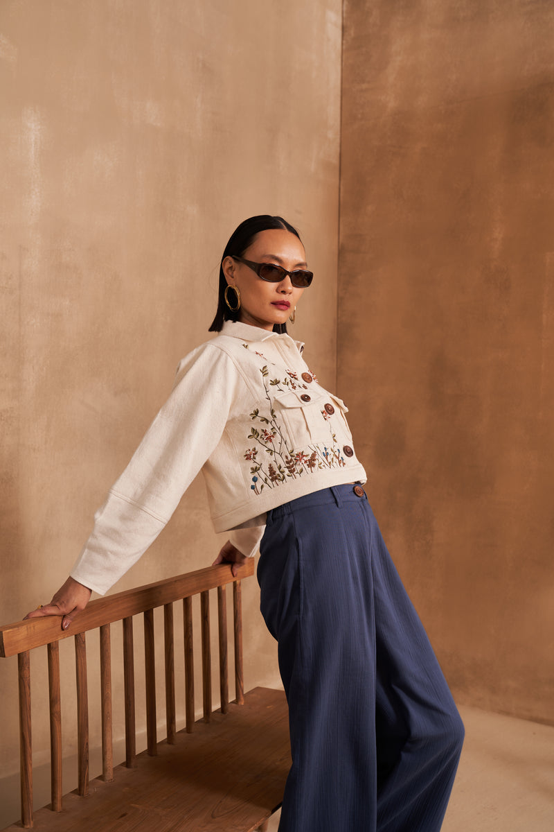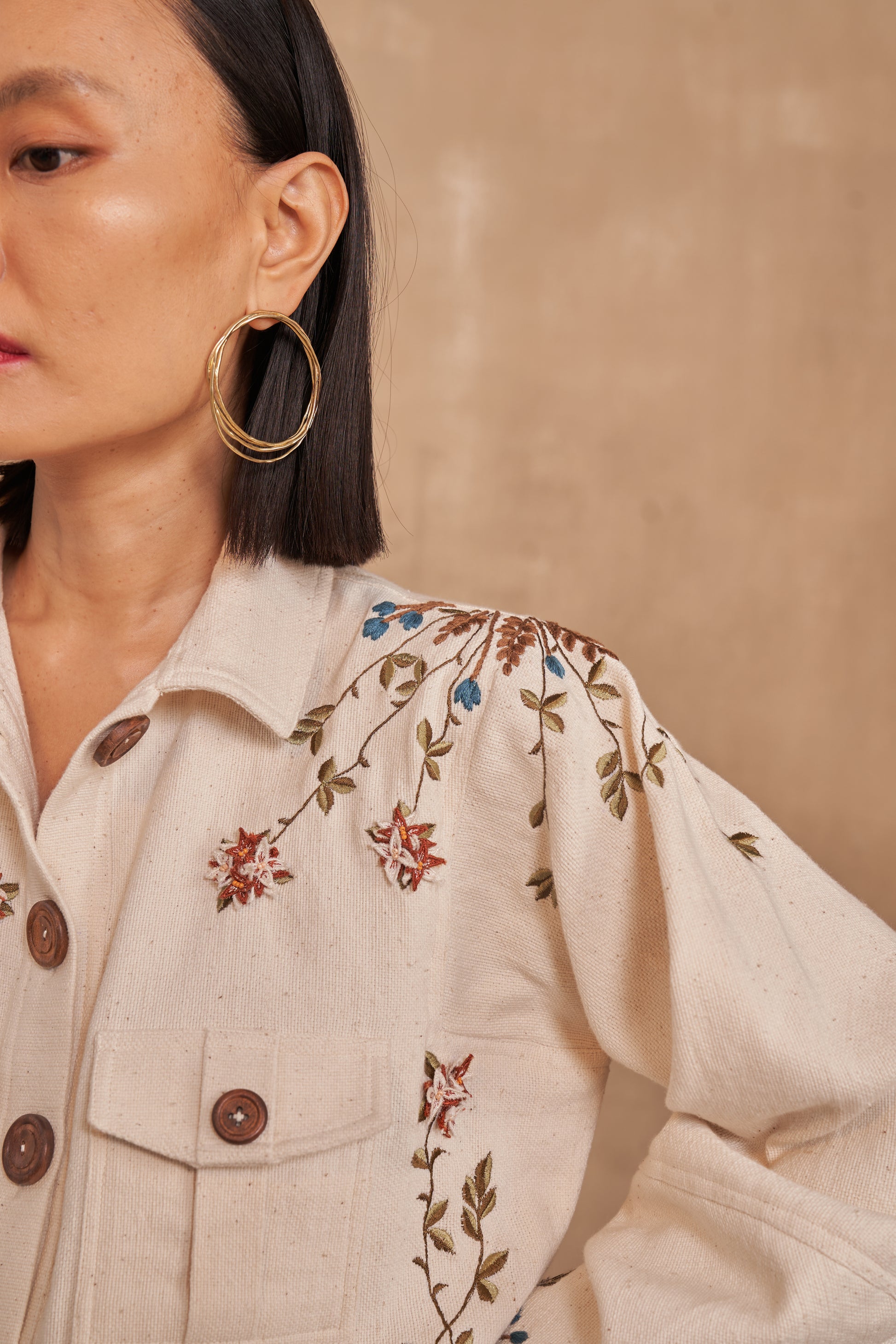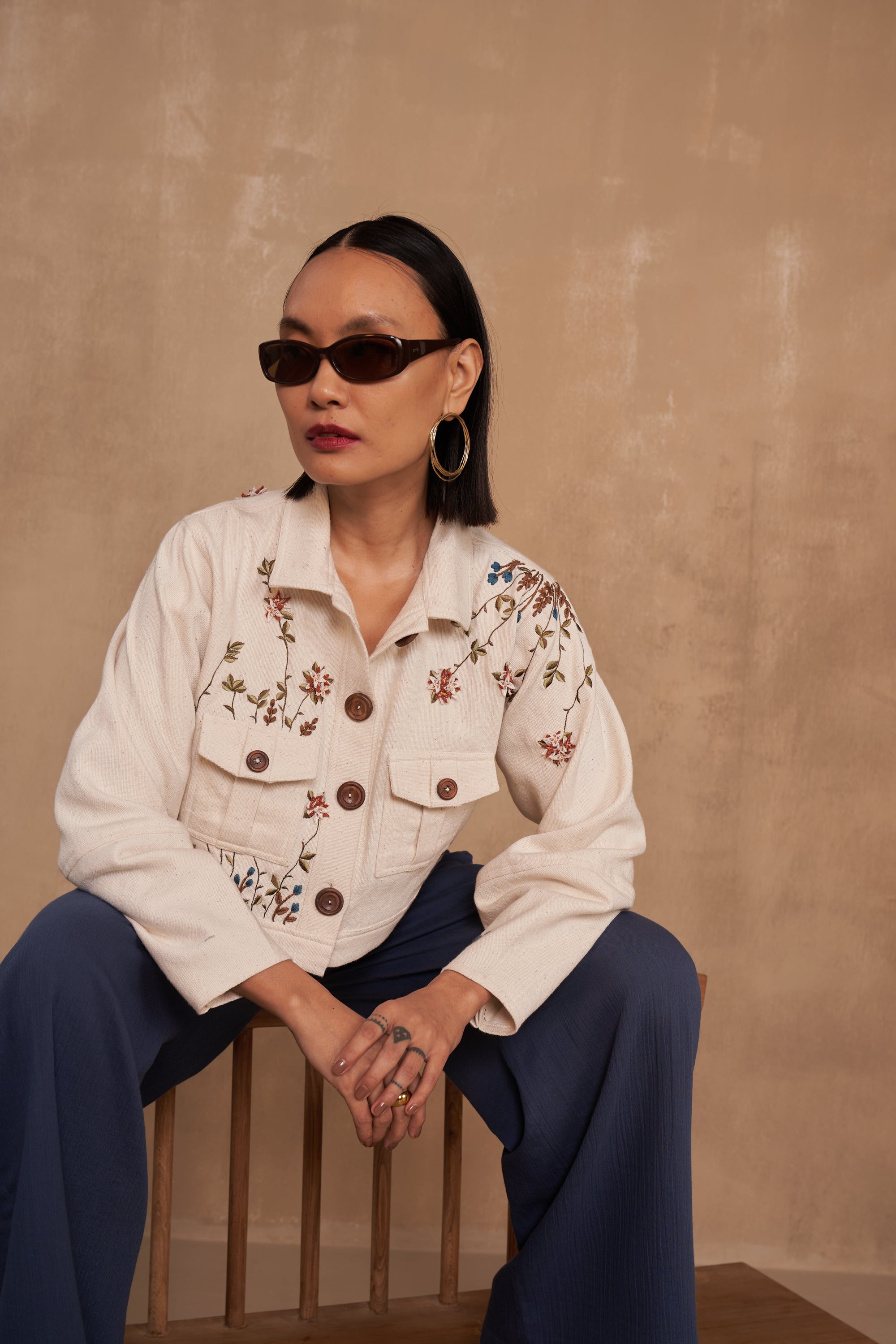 Regular fit, long-sleeve crop jacket that buttons at the front, crafted in handpsun and handwoven organic cotton fabric, machine and hand embroidered with wildflower motifs.