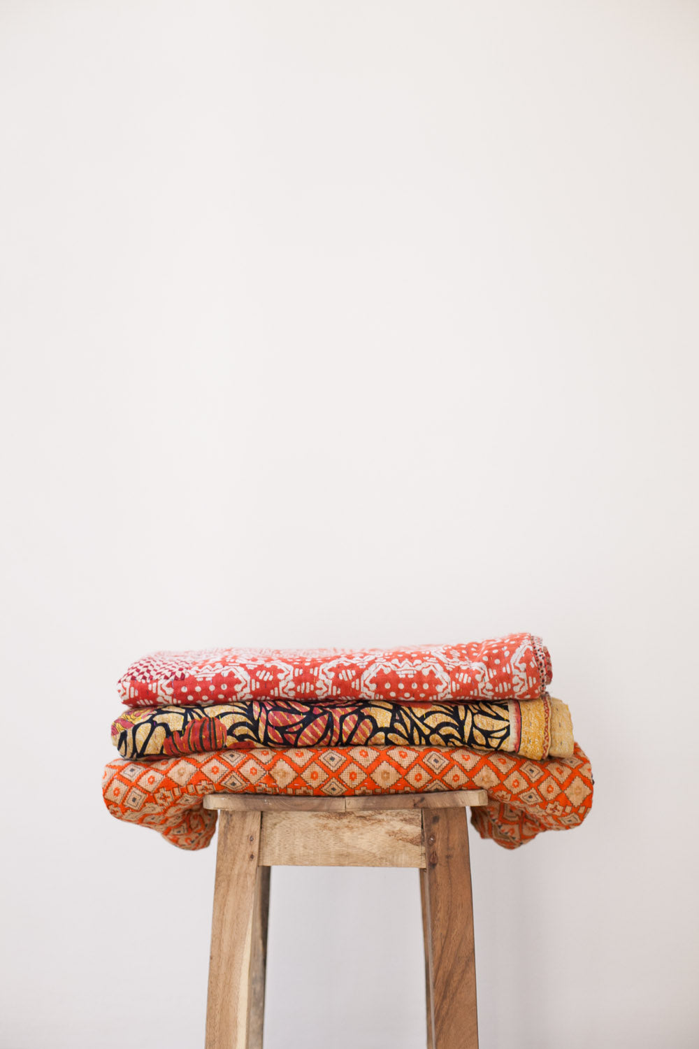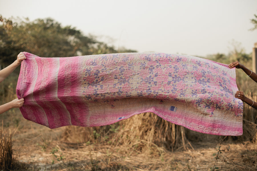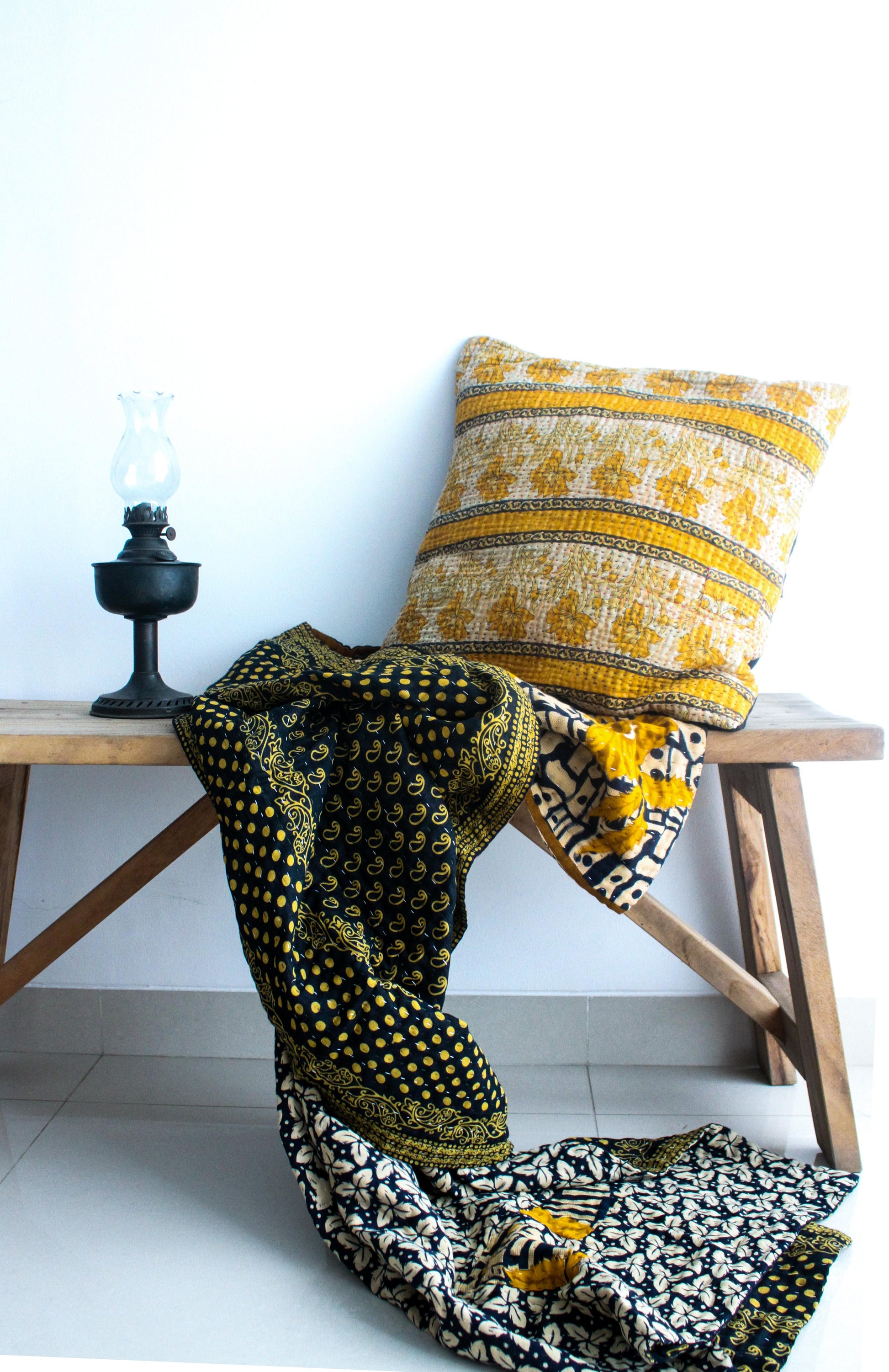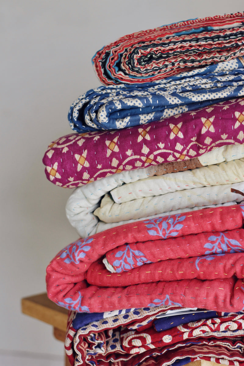 Layers of vintage sari cloth are stitched in straight even rows. Soft, cozy and the perfect size to curl up with on a chilly morning. Each blanket is unique and one of a kind