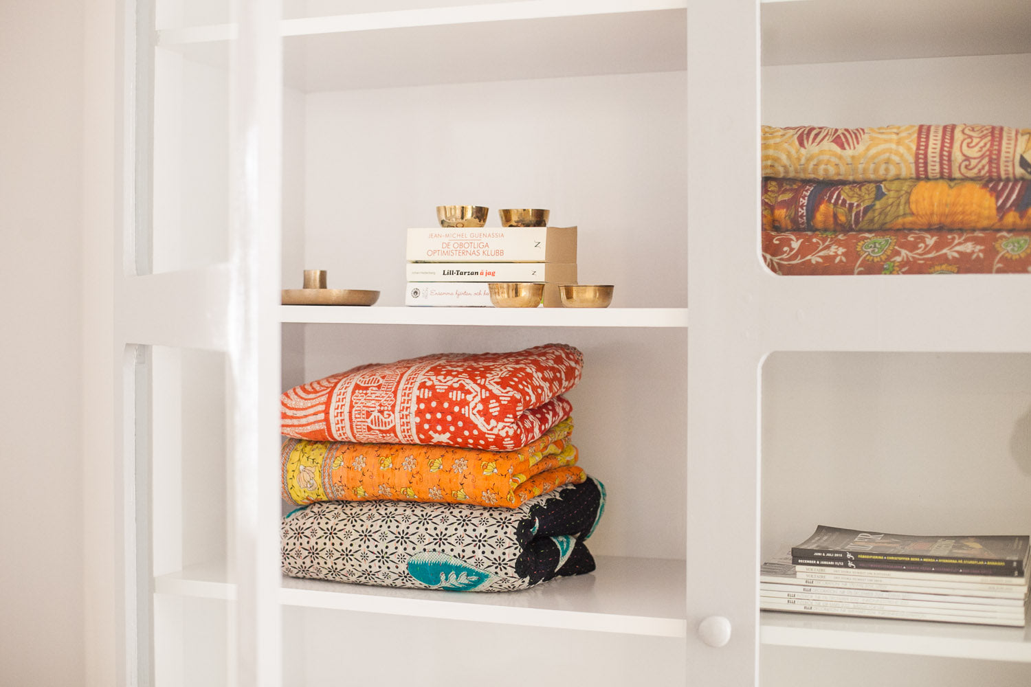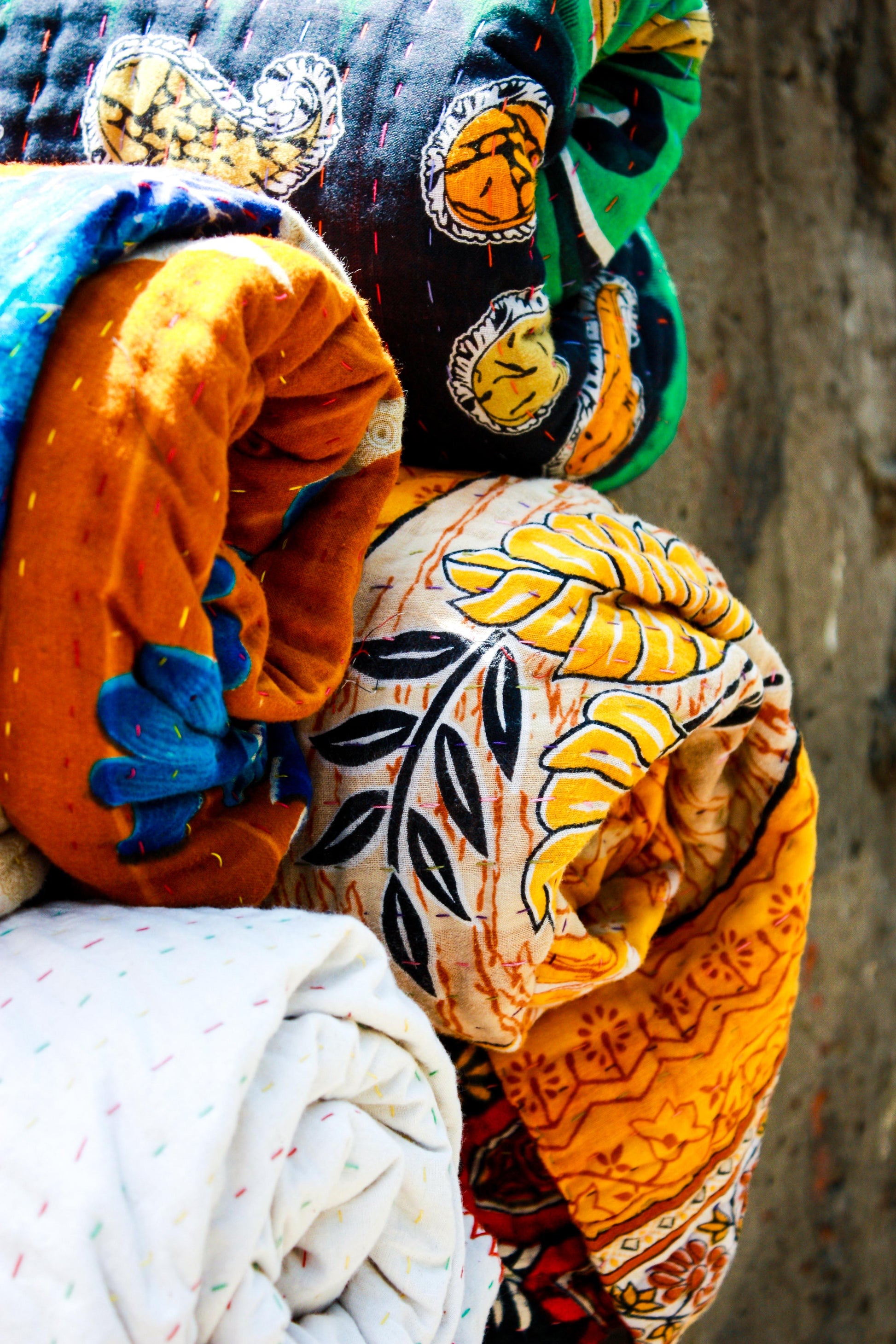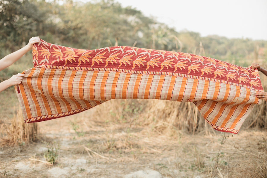 Layers of vintage sari cloth are stitched in straight even rows. Soft, cozy and the perfect size to curl up with on a chilly morning. Each blanket is unique and one of a kind