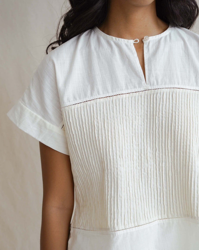 Our classic Crop Tee is also known as everyone-loves-it-top. One try and you'll know why. She effortlessly flatters and makes everyday dressing fun. Features handmade pleats and hemstitched details that makes each one of a kind.