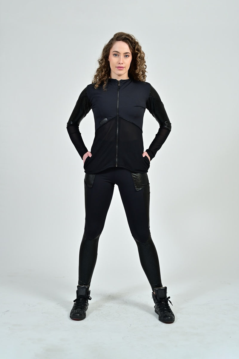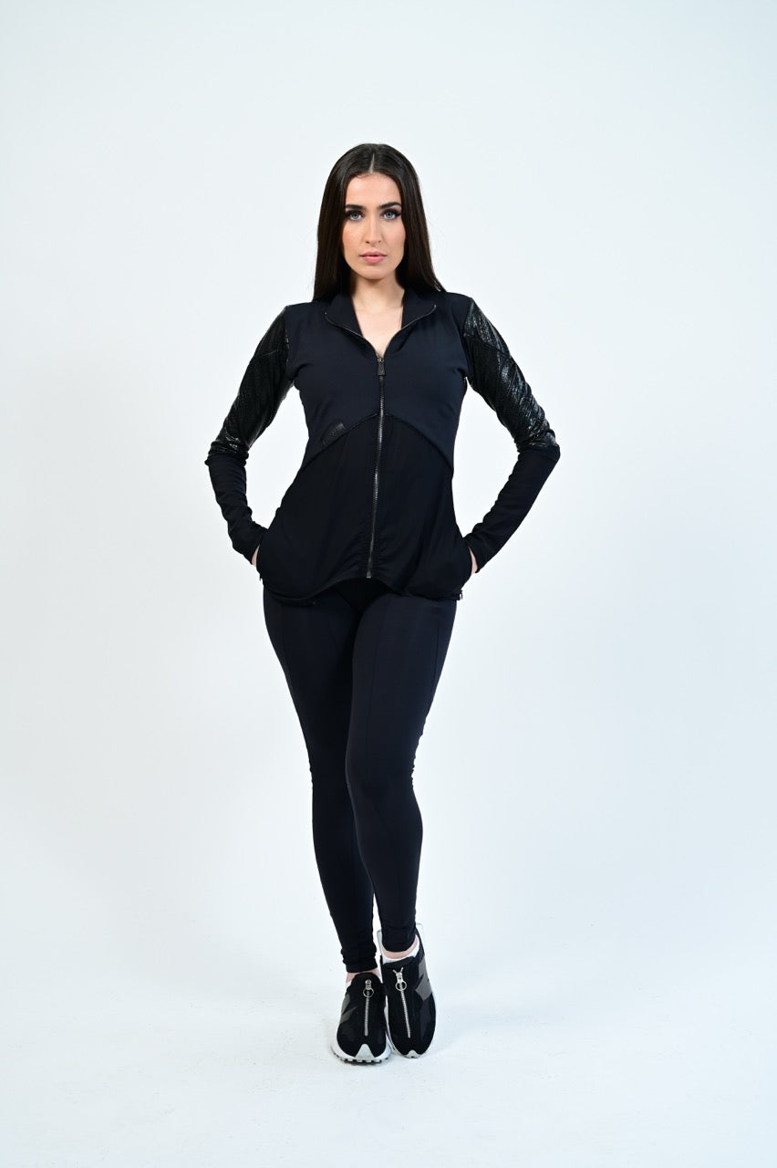 Our Best seller classic sports Jacket . Fitted contoured elegant chic front zip jacket. Cut with unique paneled and shiny snake with piping trim throughout, this jacket is higher front and lower in back cinches in waist. The back of jacket is longer with order elegance & sophistication. Dual lower front invisible pockets.