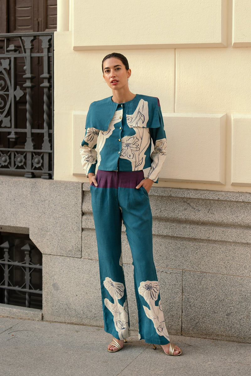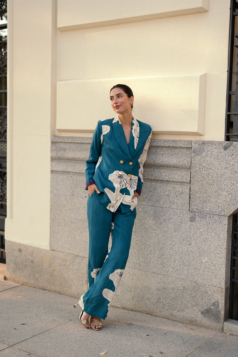 A blazer jacket made of blue and beige fabric. It features a standard blazer collar, shoulder pads, and a closure with gold buttons. Straight long sleeves