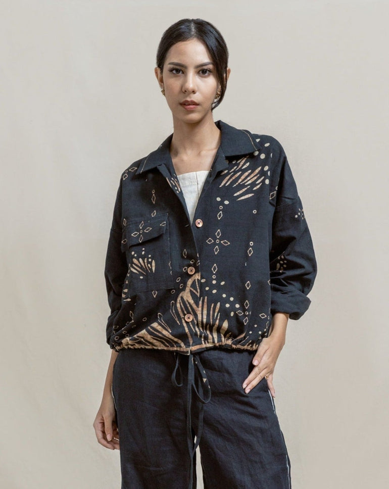 - Traditional yet modern. When normally you'd think of zippers on a bomber jacket, this piece has the mother-of-pearl button openings instead, and yet she blends well with the batik patterns. Her silhouette is an ode to the more contemporary bomber style. Plus, she has that drawstring detail that flatters.