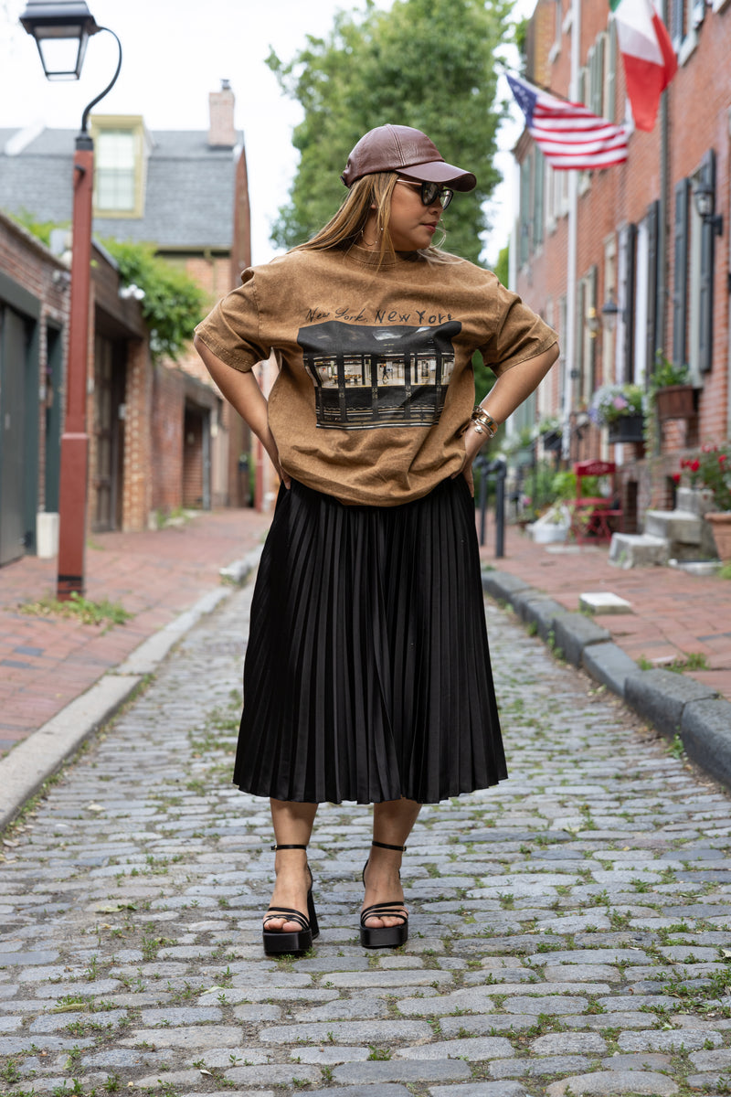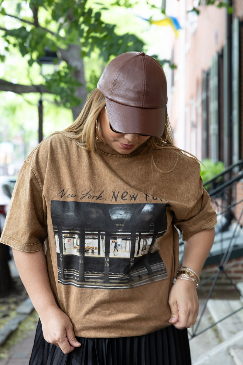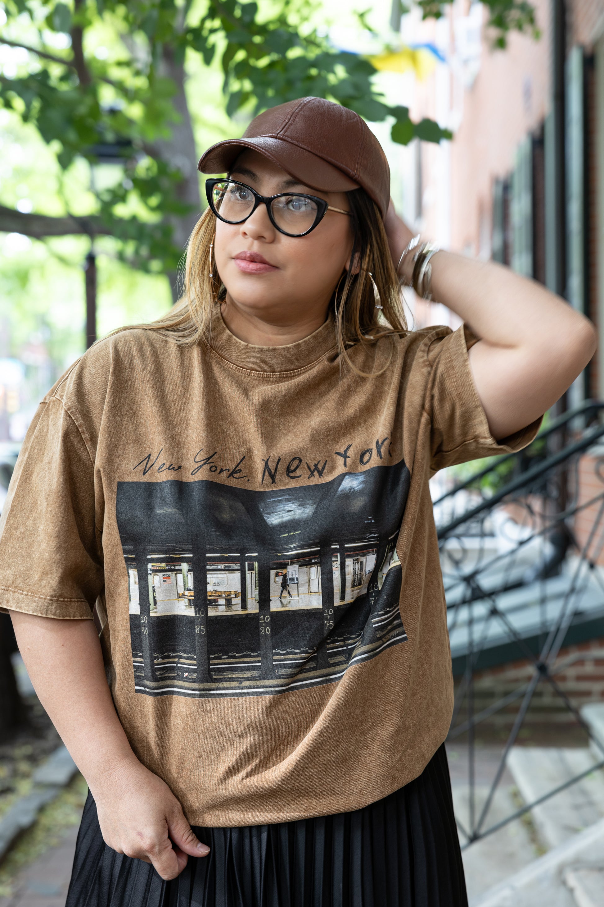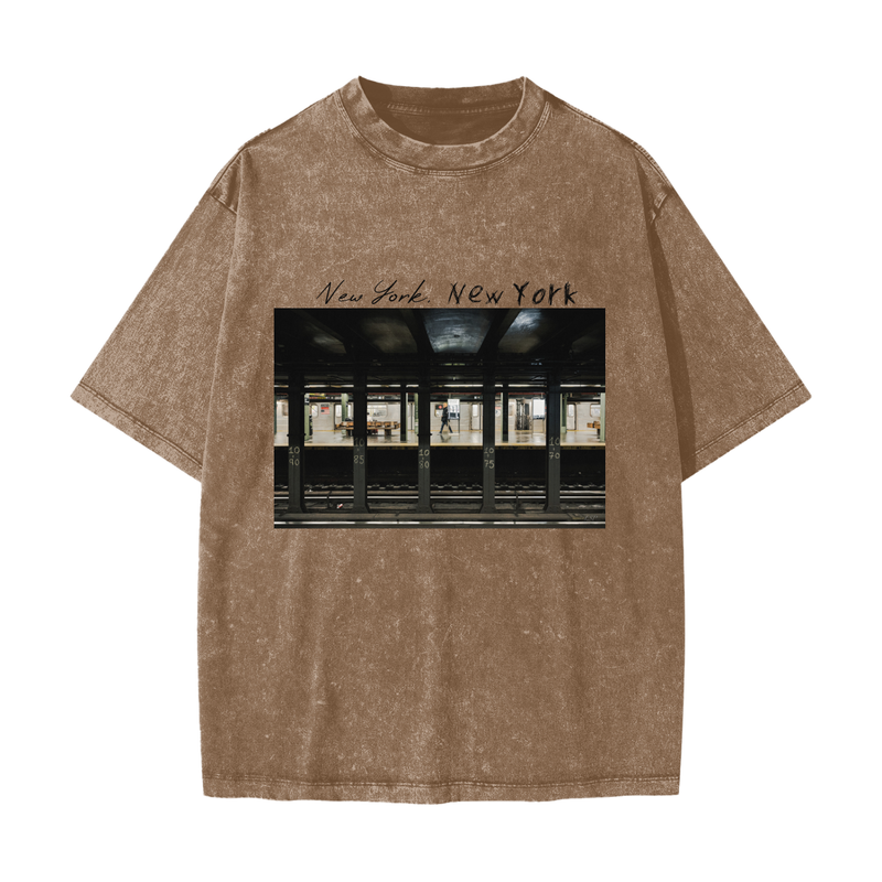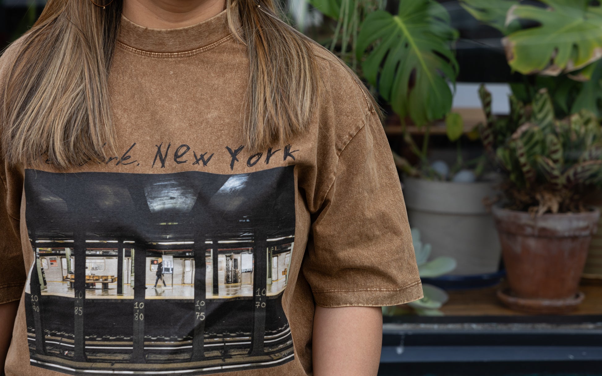 Heavyweight snow-washed fabric printed with a subway photo taken by Kyrie's Tutu, using DTG printing for a more sustainable and durable shirt and print.