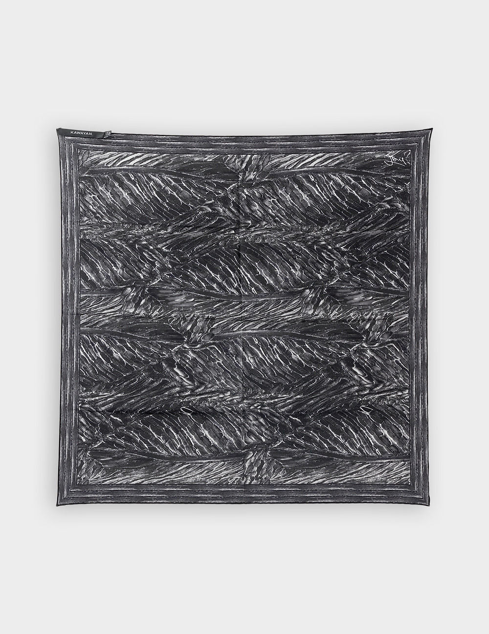 Crafted from exceptionally soft and lightweight silk, this square scarf is printed with exclusive KAWAYAN motifs—each design inspired by nature and fine art, expressed through fluid forms and thoughtful composition. Offered in two sizes: 60×60 and 90×90 cm. Finished by hand with delicately rolled and stitched edges, and presented with a silver scarf ring in a hand-carved black lacquer box made in Myanmar—an object of refined wear or gifting.