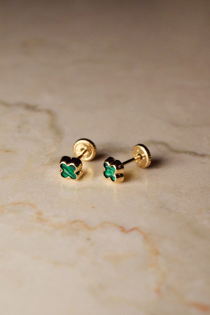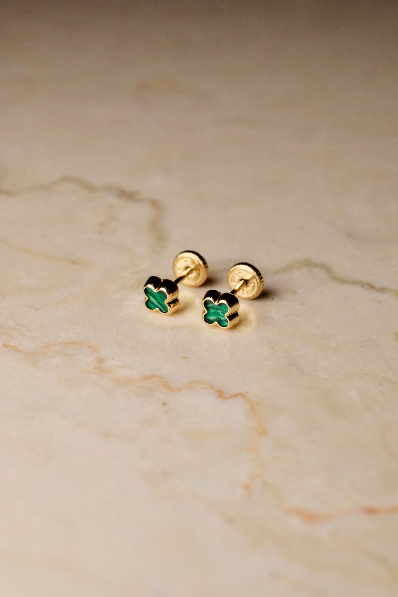 The Leonie earrings are a luminous take on a classic silhouette, each crafted in 14k gold and inlaid with a unique Malachite four-leaf clover. As symbols of luck, the Leonie earrings are designed to be worn daily, featuring a comfortable screw back closure. The perfect earring to celebrate a lucky moment in time or as a meaningful gift for a loved one.