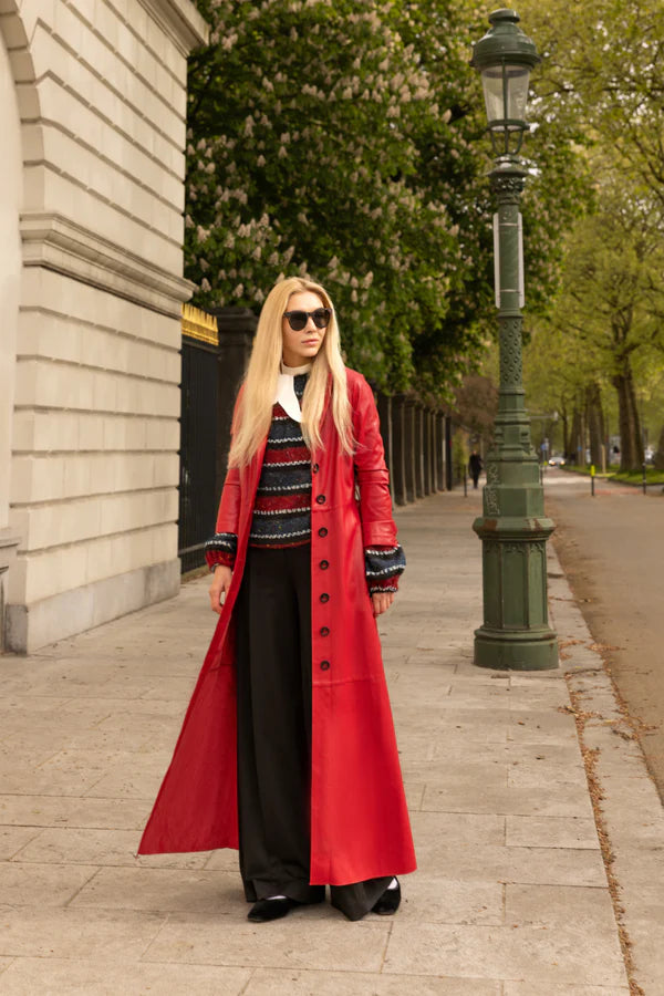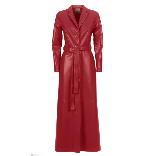 Discover elegance and sustainability combined in our latest fashion innovation: the Red Long Button-Up Eco-Leather Trench. This exquisite piece not only elevates your wardrobe but also supports environmentally conscious living. Crafted from premium eco-leather, our trench coat offers a luxurious feel without compromising the planet's wellbeing. Perfect for those who value style and sustainability in equal measure.