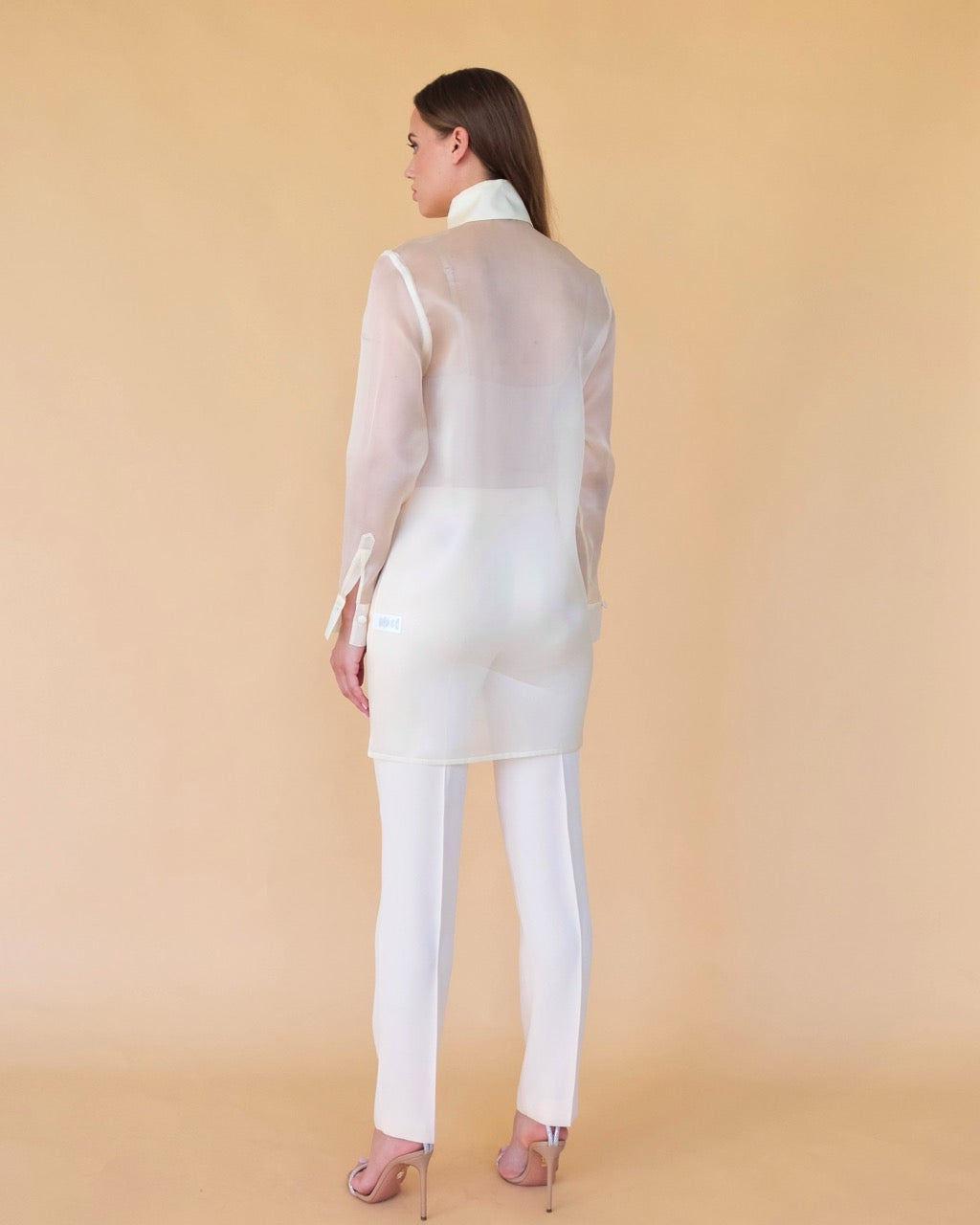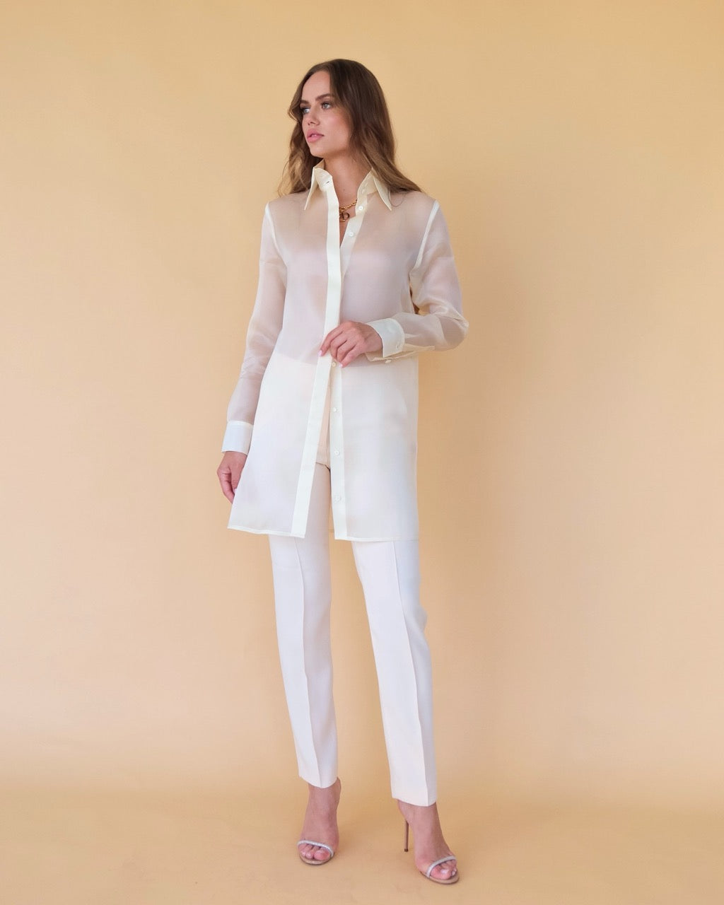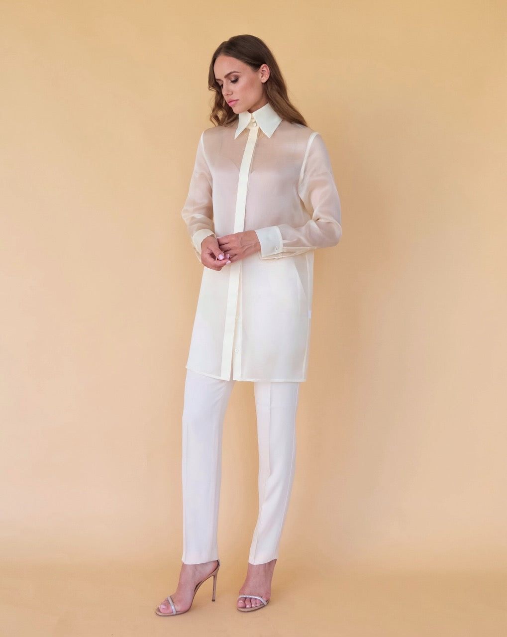 Long silk organza blouse champagne, beautifully crafted from premium transparent silk-organza, features a straight fit, a high collar with three buttons, a covered button-front closure and long sleeves with buttoned cuffs. Mother of pearl buttons.