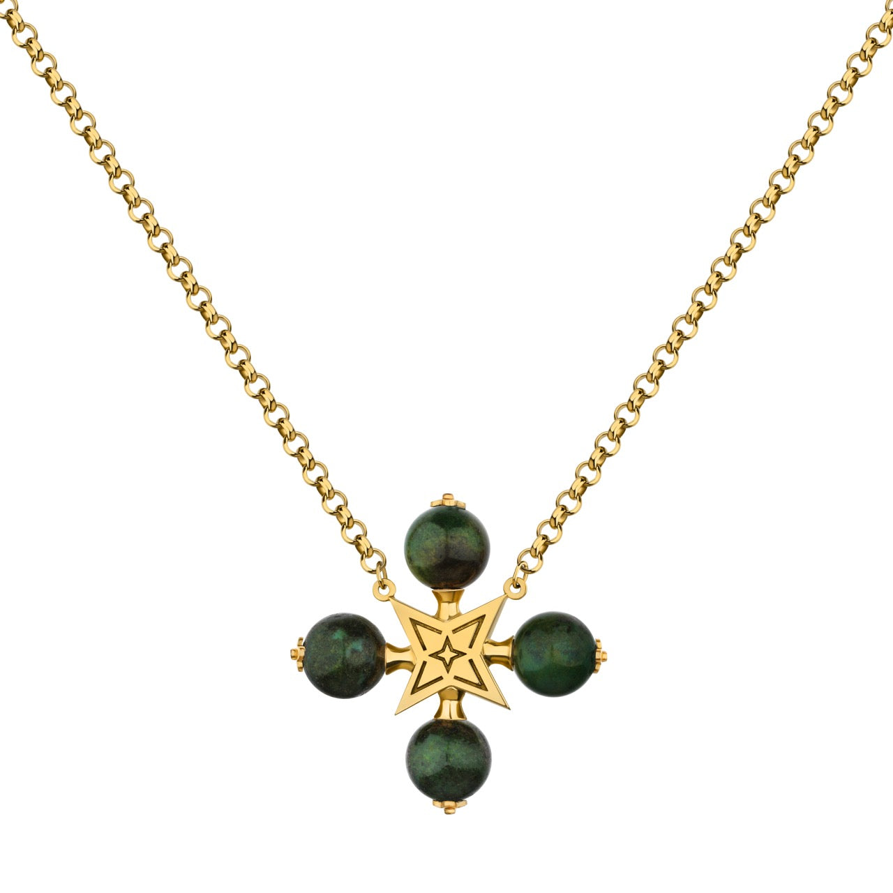 Made of 24-karat gold-plated brass and green lapis lazuli stones, stainless steel chain. Length: 80 cm. Nickel-free.