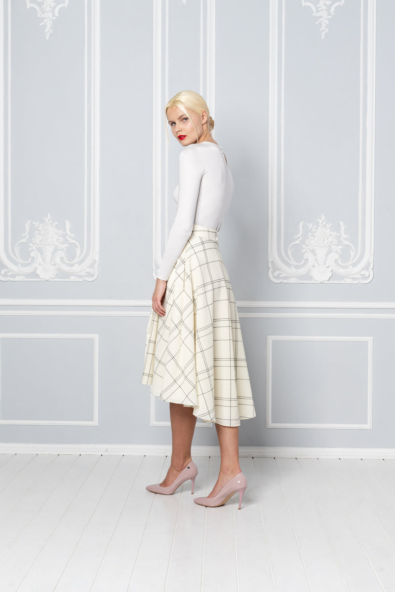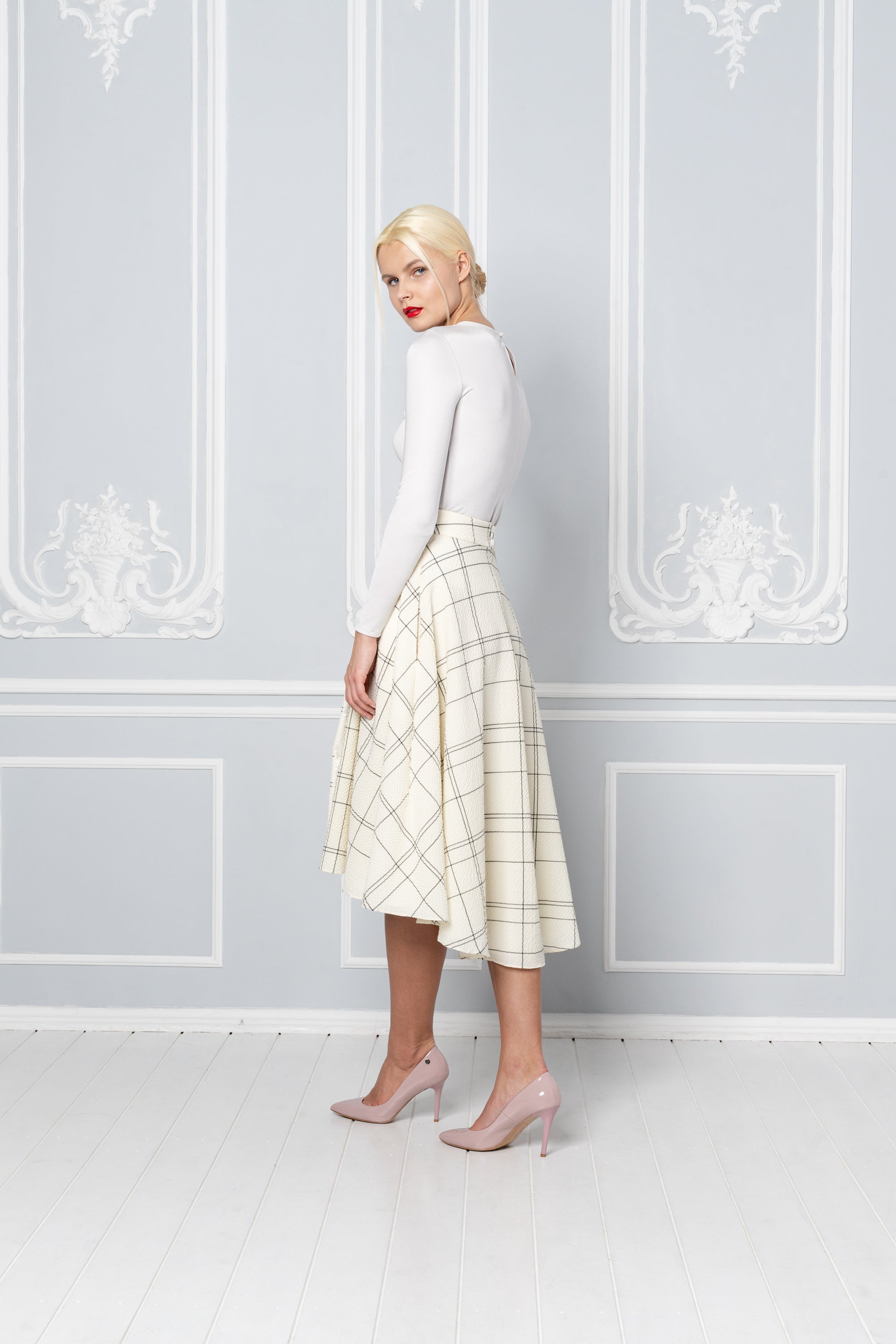This elegant A-line skirt made of premium light wool seersucker fabric is easy to wear and comfortable to move in. A classy high-low hem with a fitted waist enhances your feminine silhouette and is easily paired with a black or white top. Wear it with a silk blouse, or one of our bodysuits, and heels to a party, or a seasonal sweater, or jacket for a casual look.