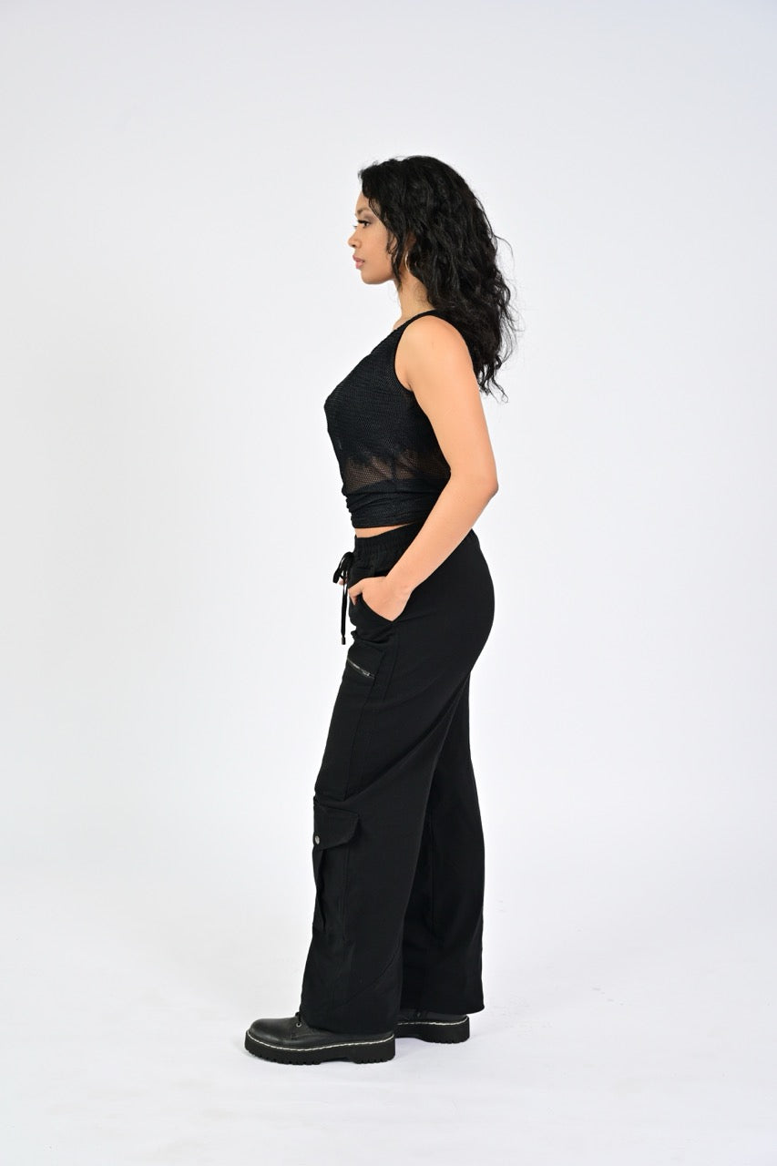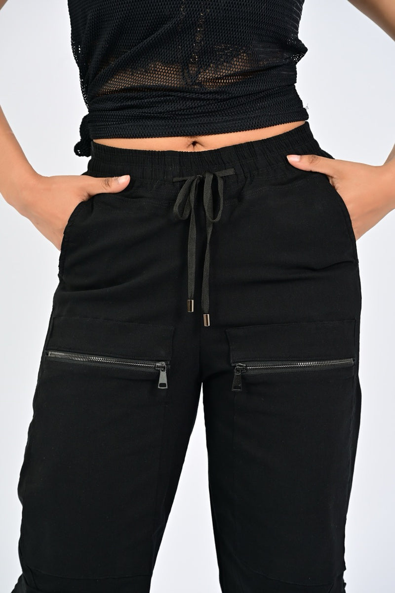 Unisex Straight leg pants with large zipper pockets, side pockets, and front lower snap pockets made from Eco Vera Organic cotton & tencel Lycra. Elasticized adjustable waistband. Stretchable and comfortable. Made in New York City