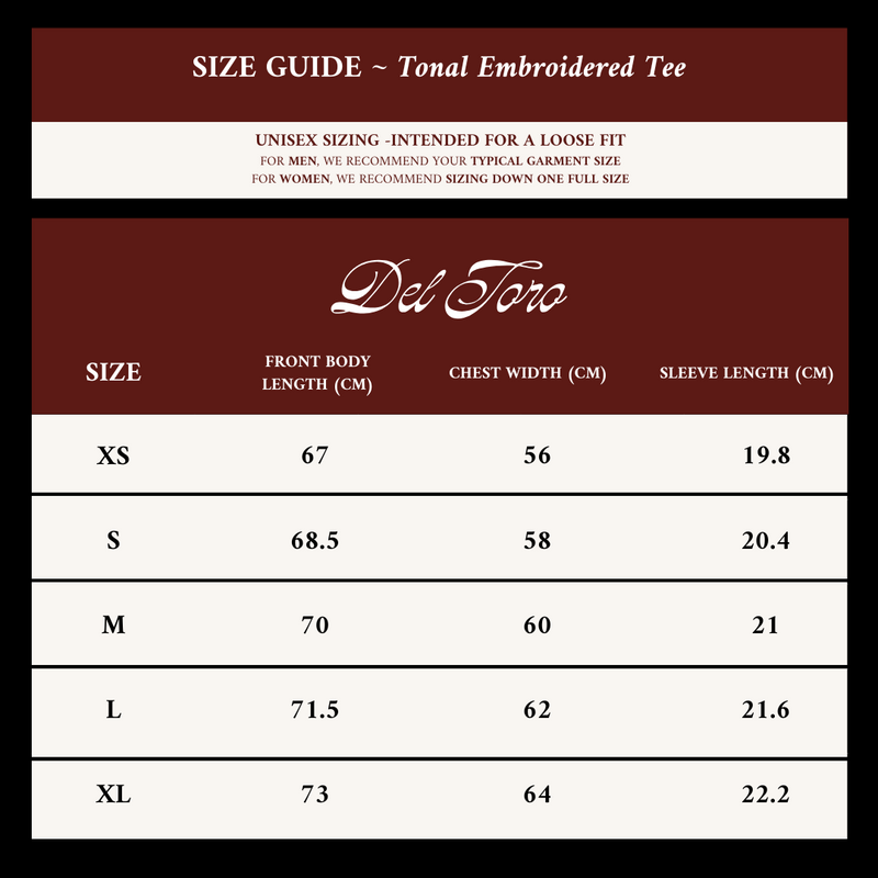 Inspired by the tastefully simple vintage design, the Tonal Embroidered is all about pattern and fit. Designed for a loose-fit feel, the garment is also crafted from lightweight cotton fabric for all-season wear. The sleeves are mid-length for a more casual and laid-back aesthetic. This garment features subtle tonal block letter Del Toro embroidery on the left chest.