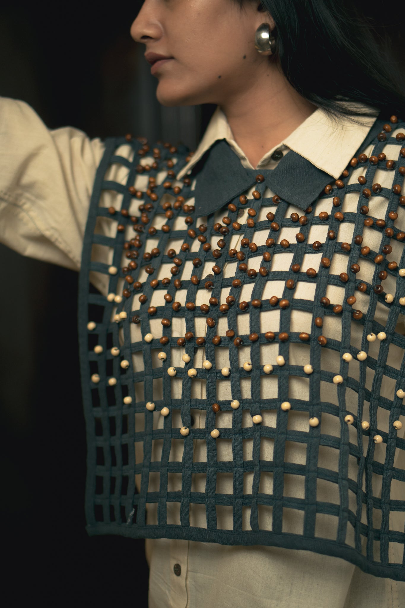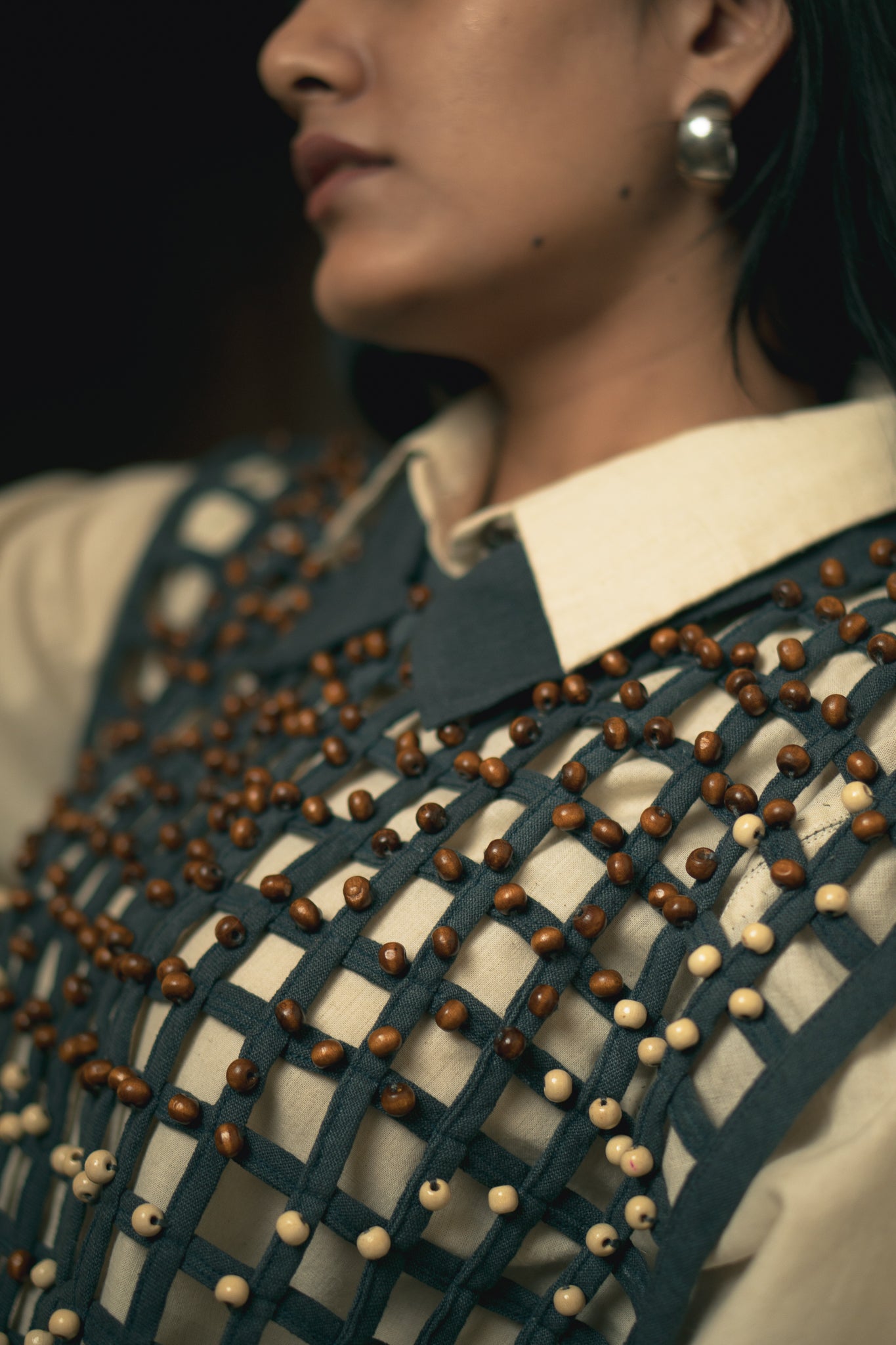 Wooden beads embellish the bib around the collar, adding a touch of rustic charm and colour.