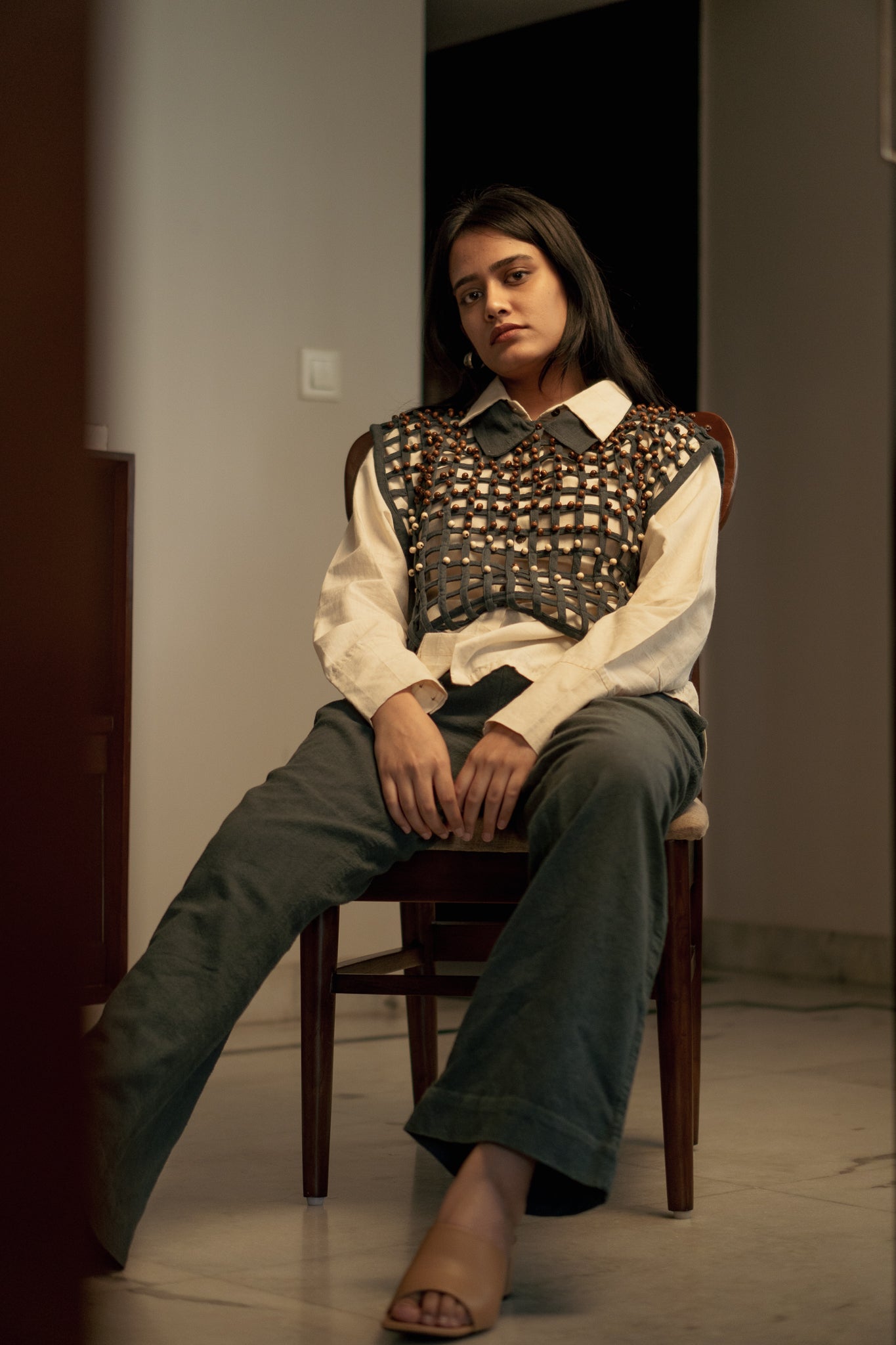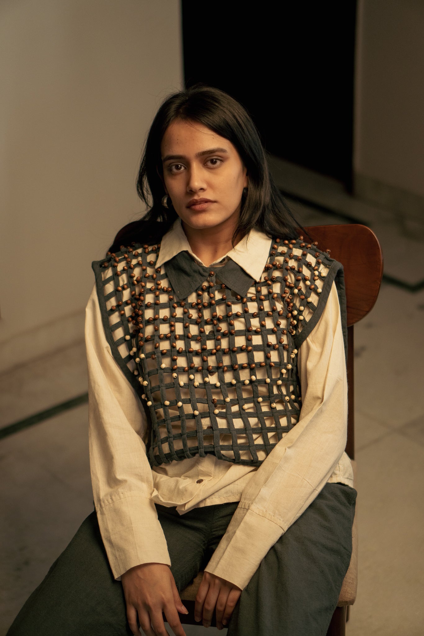 Tailored from a mosaic of upcycled fabrics, this bib is a testament to our commitment to reducing waste and repurposing materials. Each strip of the bib is a distinct piece of fabric with its own history, beautifully woven together to form a captivating mesh of textures and pattern.