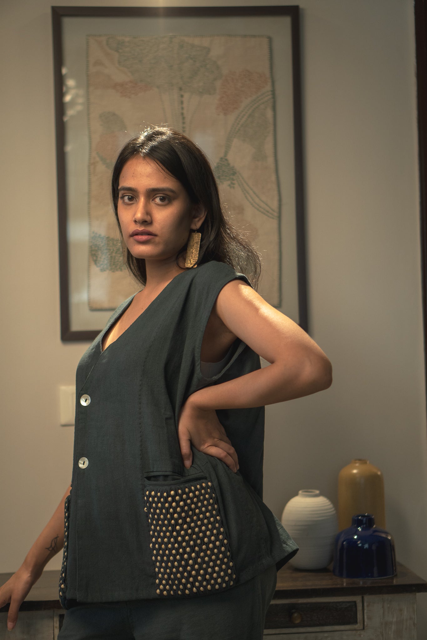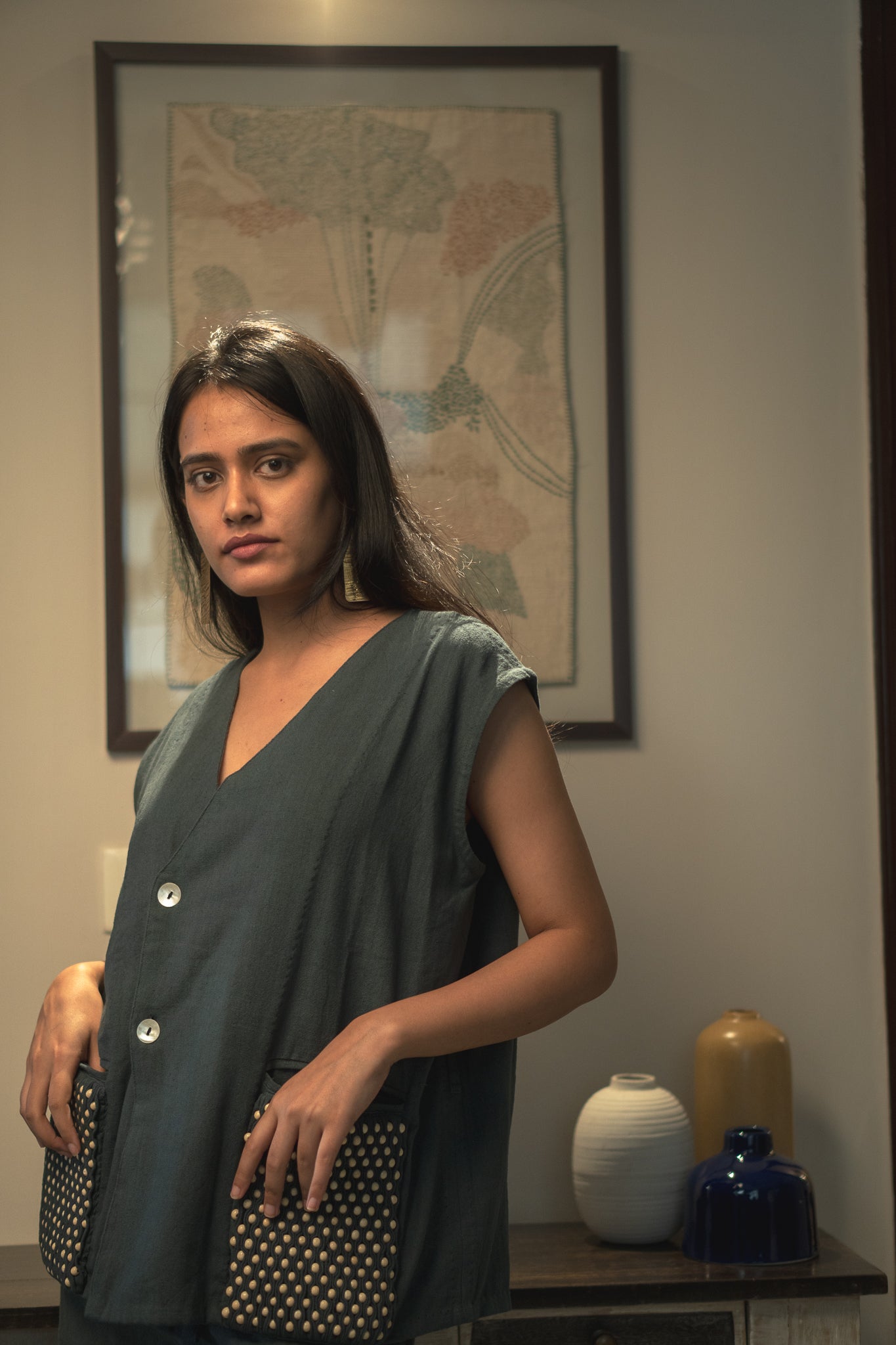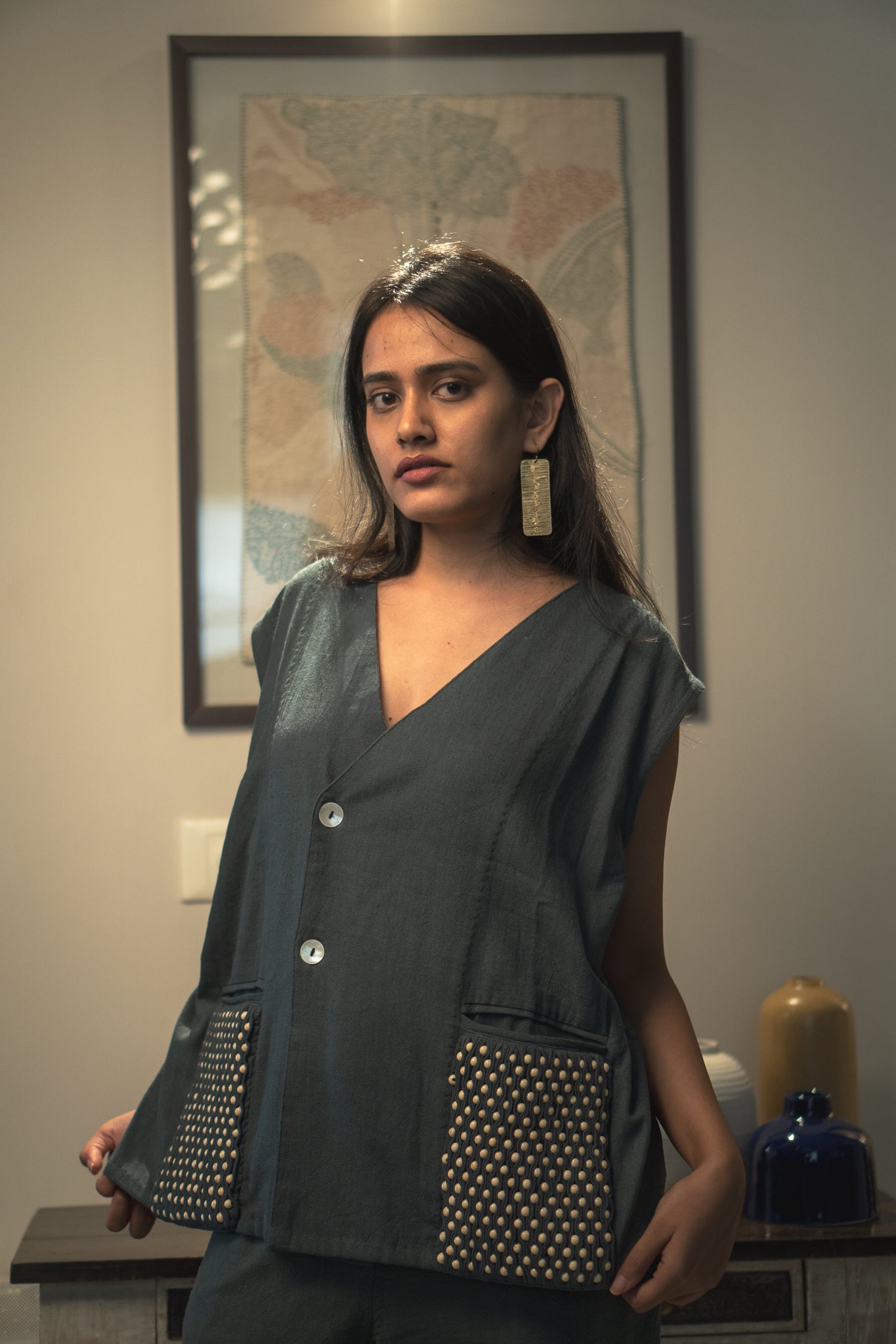 The heart of this vest is the captivating detailing that adorns it. This vest features smocking on the pockets. Wooden beads have been artfully layered in between the pleats of fabric, adding a touch of rustic charm and a sense of nuanced craftsmanship.