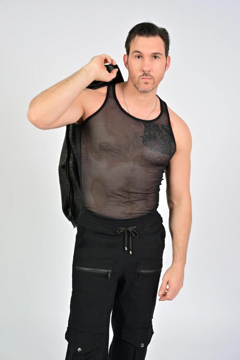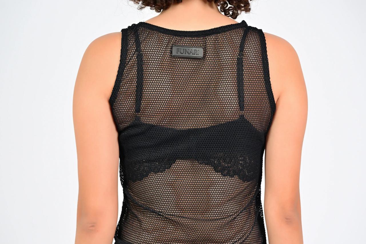 Sheer Mesh Transparent Scoop tank top Unisex style. Great to wear to work out in gym or to the club! Made from Polyester recycled from bottles. Made in New York City.