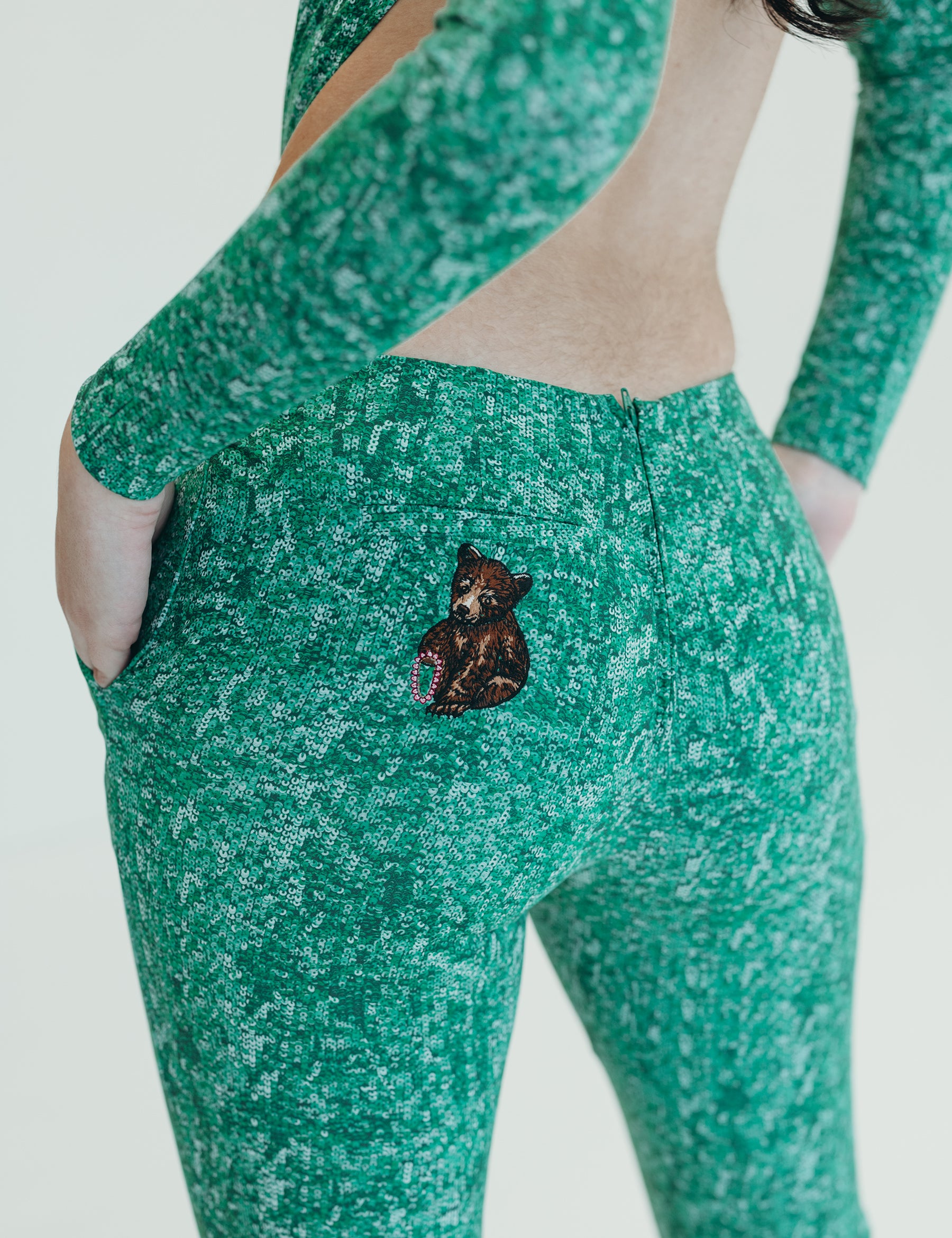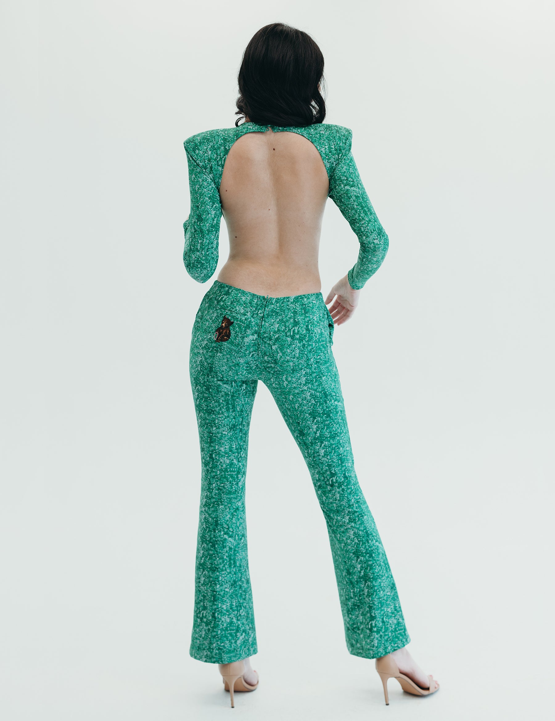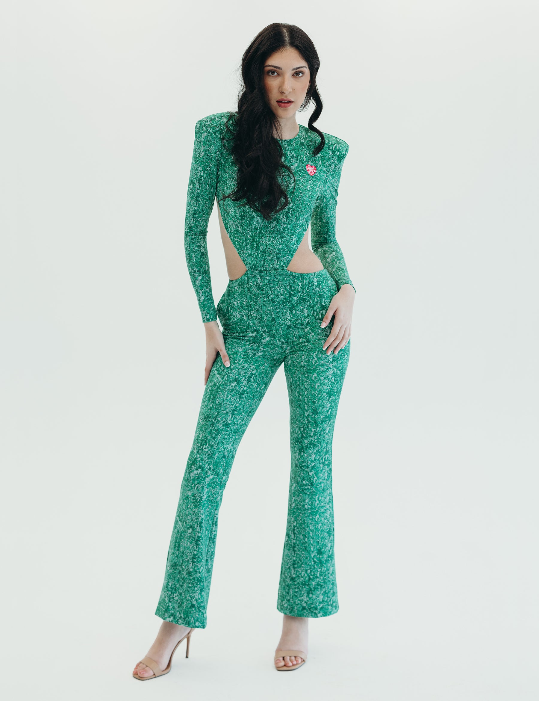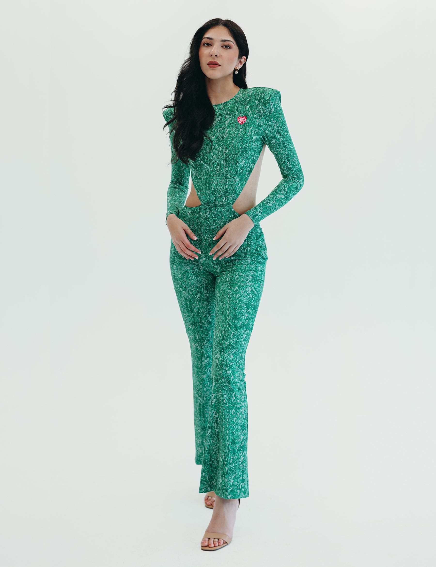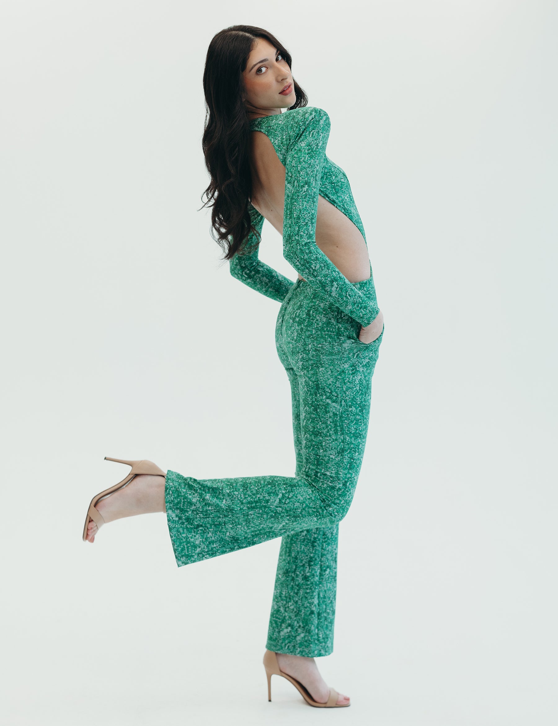 Verde mi Amor draws inspiration from the designers’ favorite open-backed holiday garments and her all-time favorite color, green. Printed sequins create the illusion of a draped green sequined gown, featuring an open back, shoulder pads, and wide legs. While sipping your coffee or running errands, one might wonder why you’re not strutting down the runway in this stunning piece.