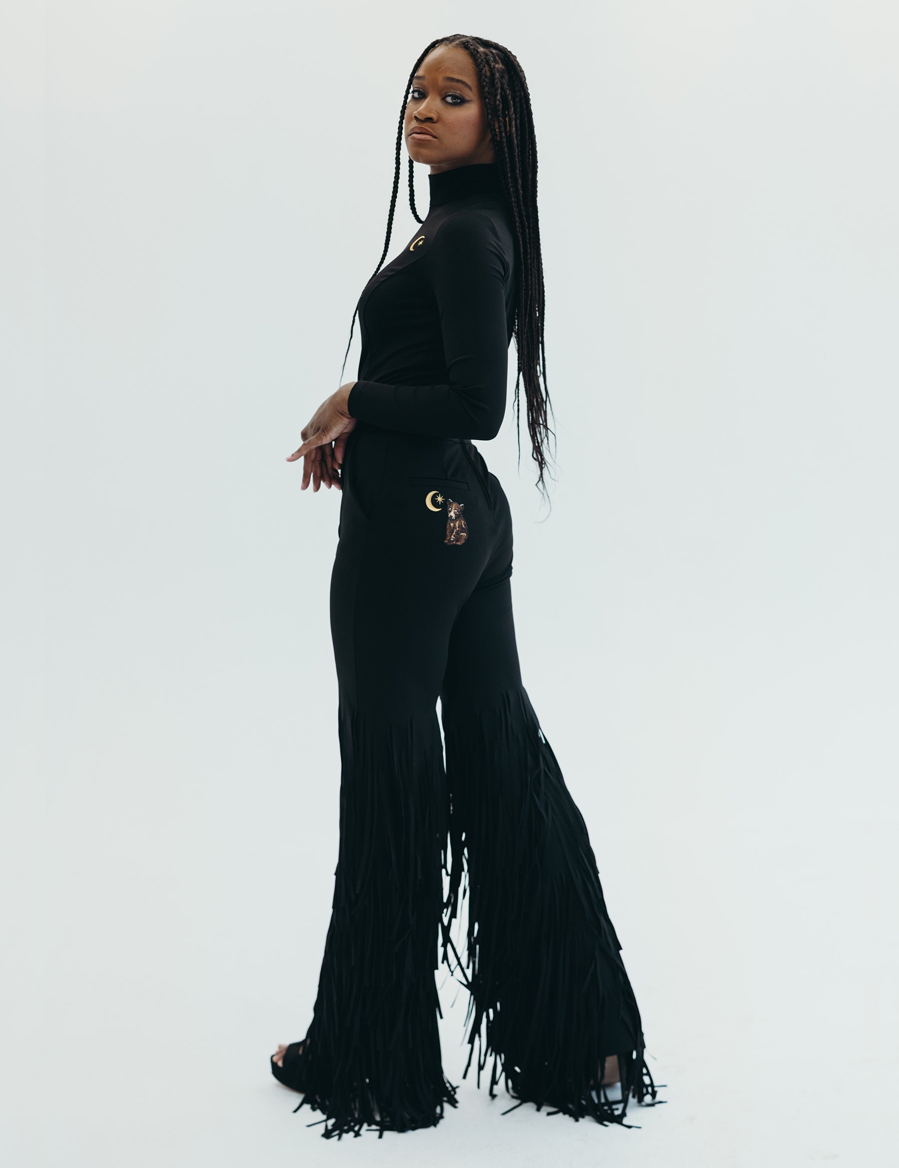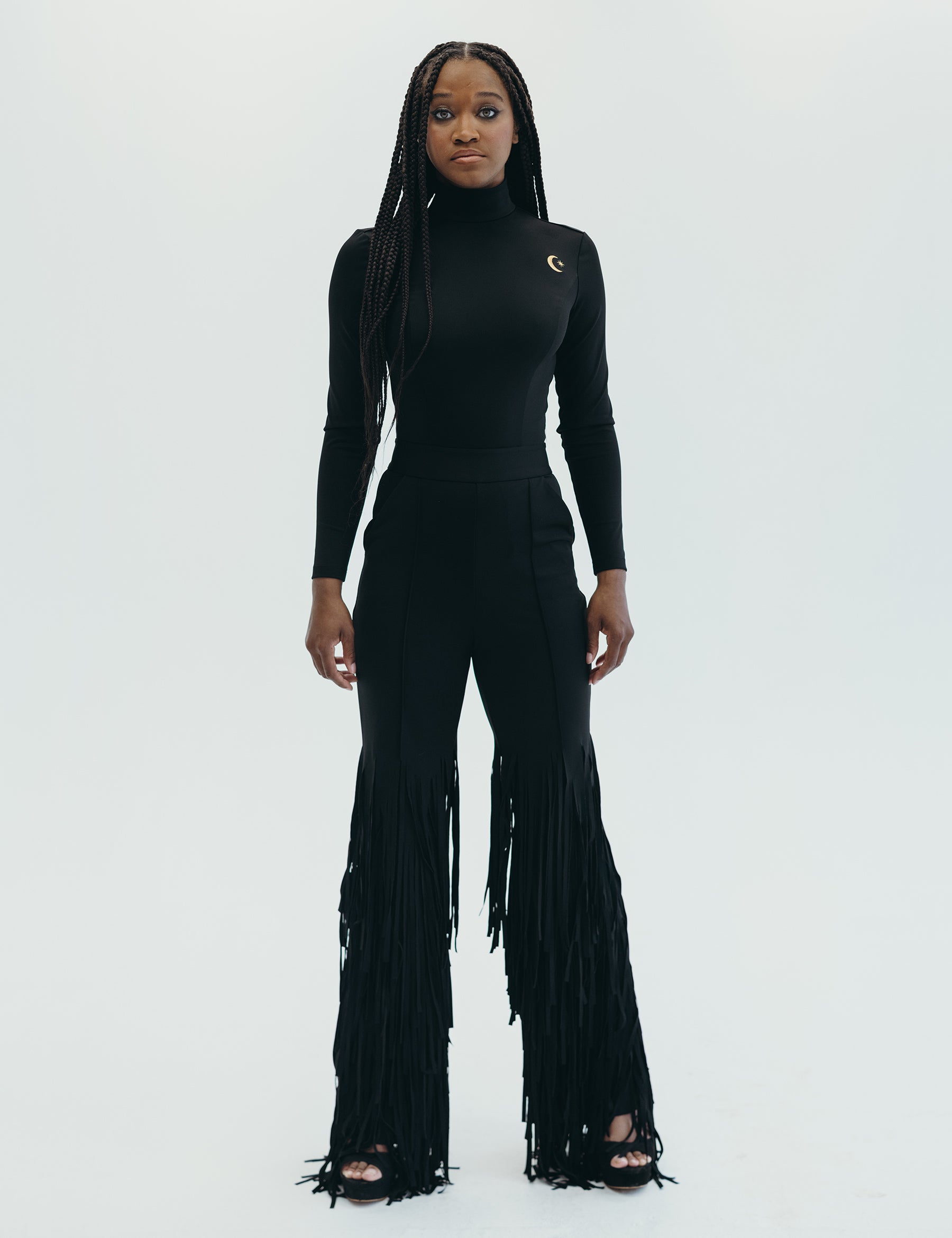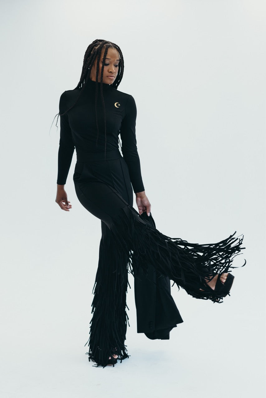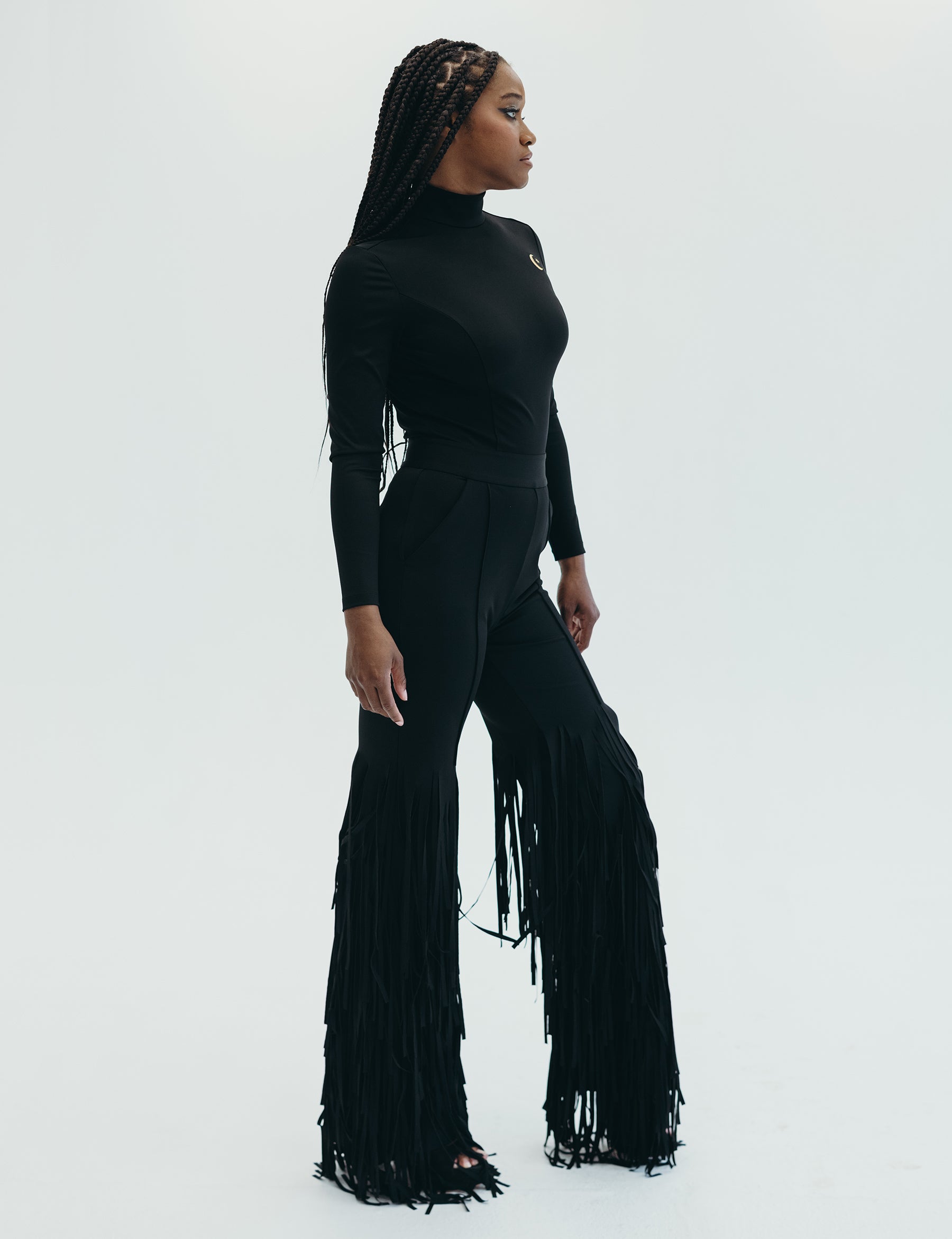 A fitted, mock neck, sleek jumpsuit with hand-cut black fringe.