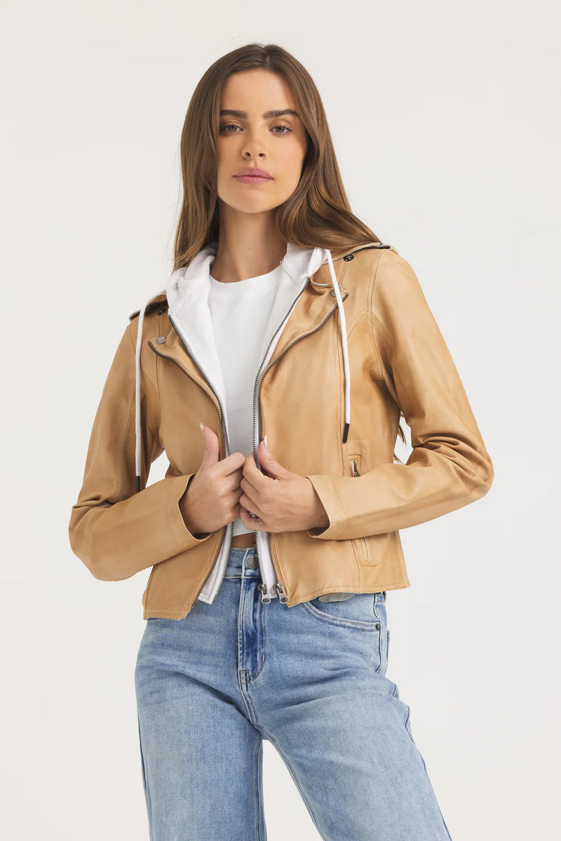 - MATERIAL: 100% Leather. Unlined for softness. French Terry hood and zip front.
