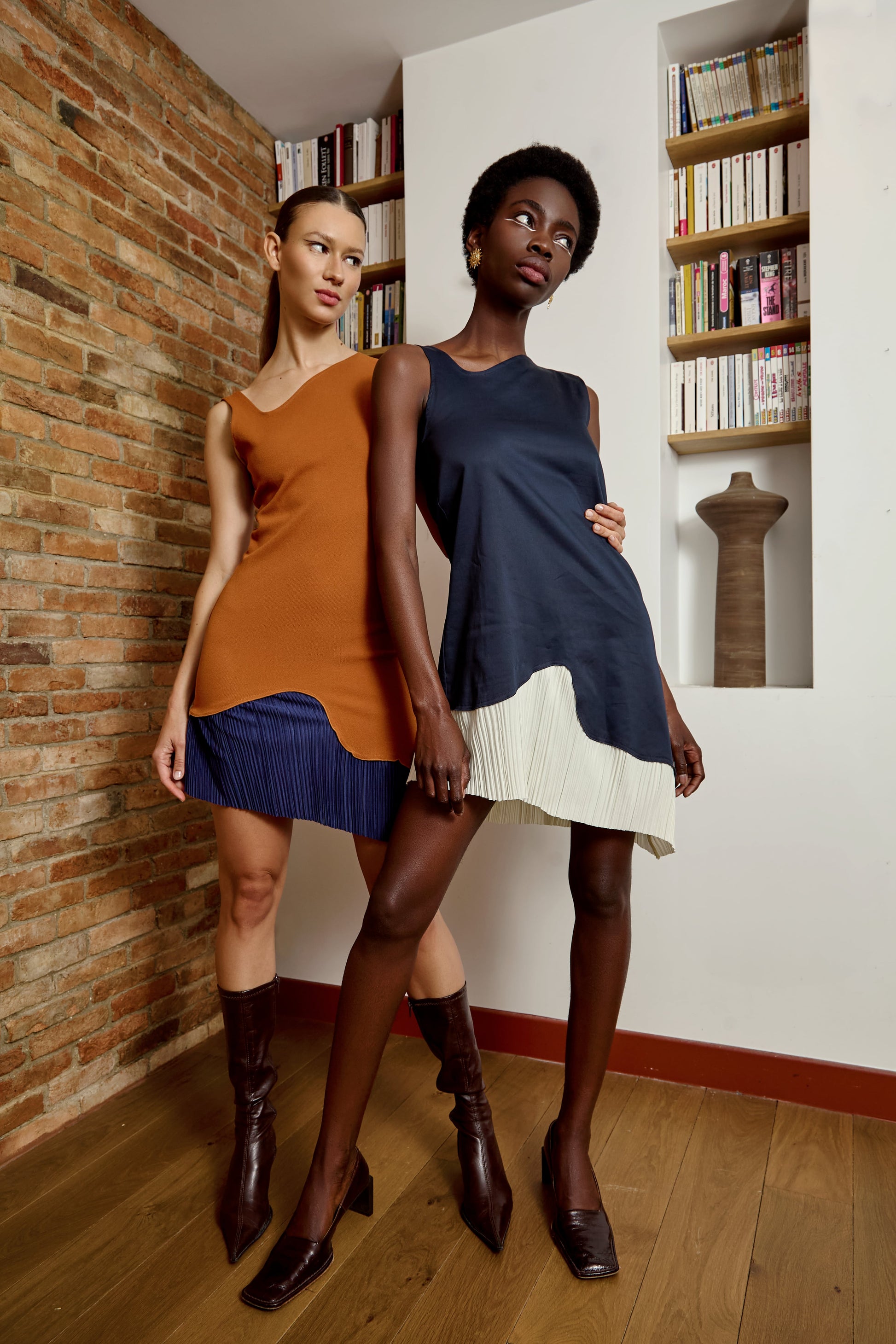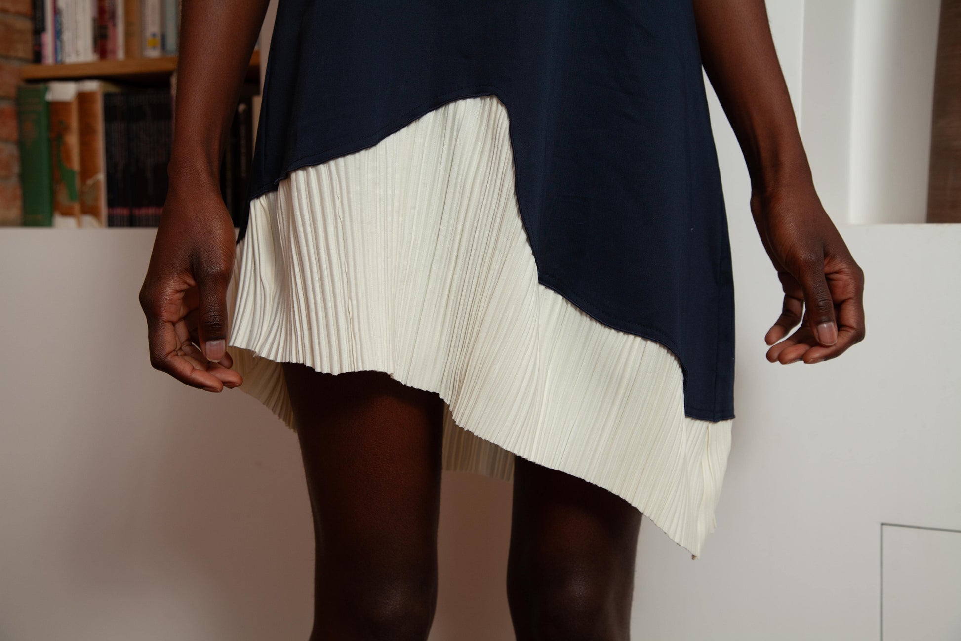 Asymmetrical dress, mixed materials: cotton and pleated fabric. Three-tone, available in 2 color options.