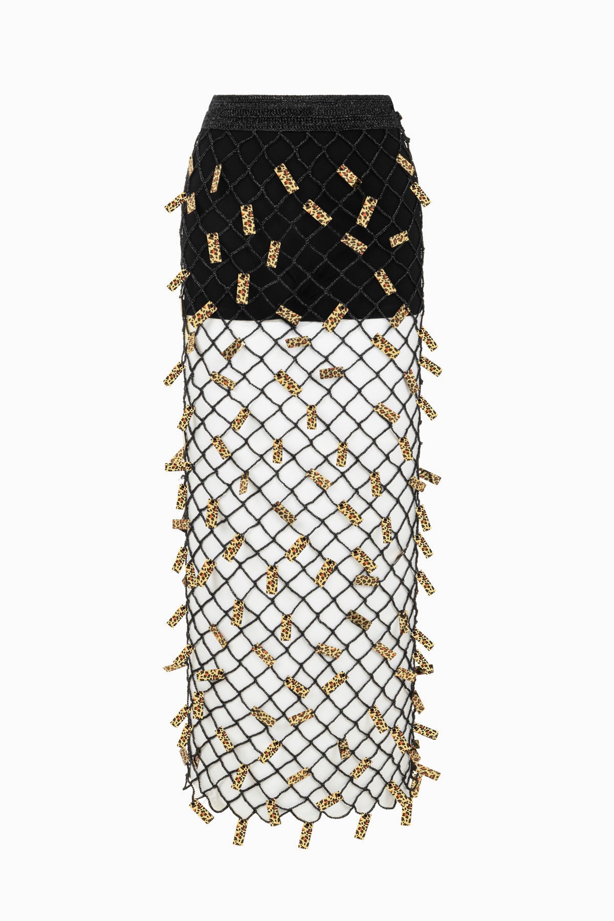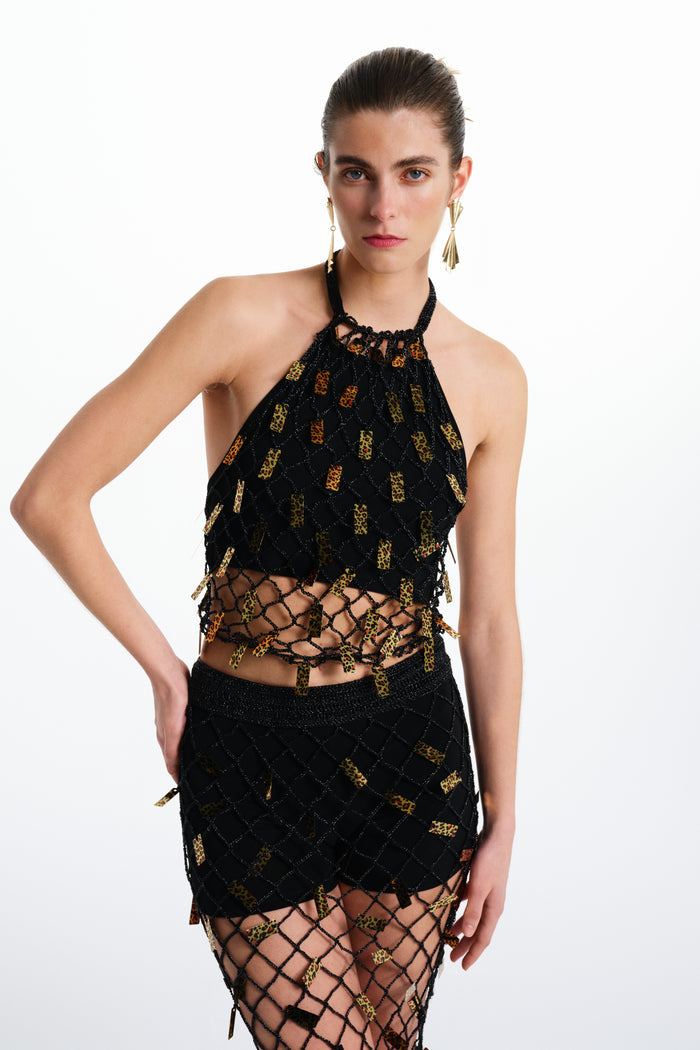 Dark, layered, and deeply intricate, the Nebula set is entirely hand-embroidered by local women, featuring a mesh halter top and skirt covered in sequins that evoke a leopard-inspired, cosmic print. This look is both fierce and mesmerizing, a testament to craftsmanship and cosmic intrigue that brings a sense of depth and movement with every step.