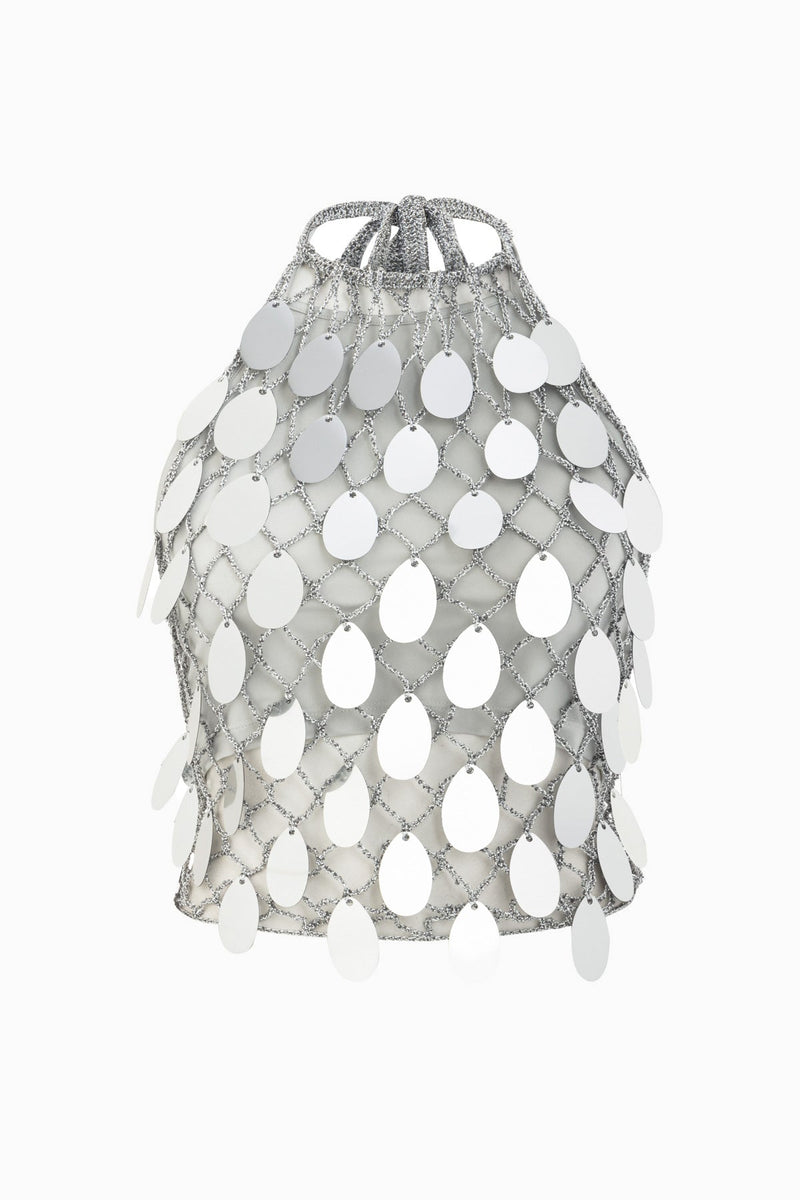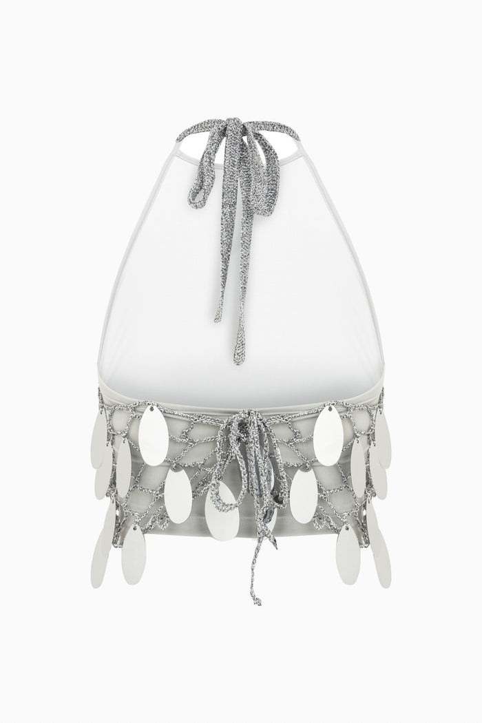 The Nexus look, entirely hand-embroidered by local artisan women, features a metallic, chain-inspired design that shimmers with every movement. This fitted silhouette bridges classic and modern elements, embodying a connection between past and future. Nexus combines structured lines with handmade details, celebrating the beauty of contrasts.