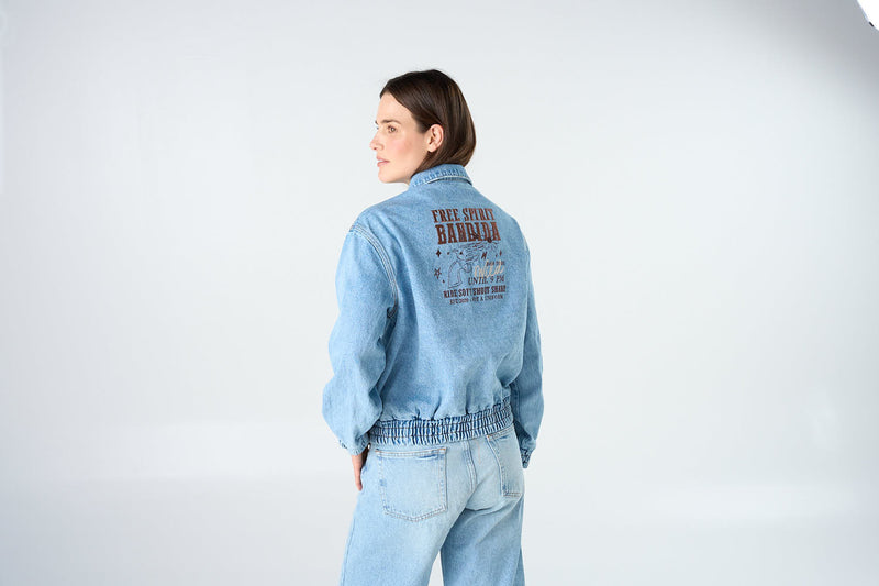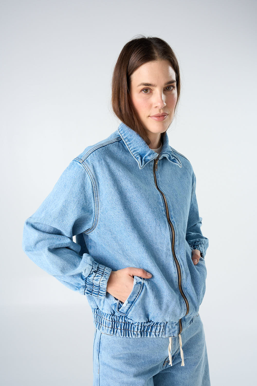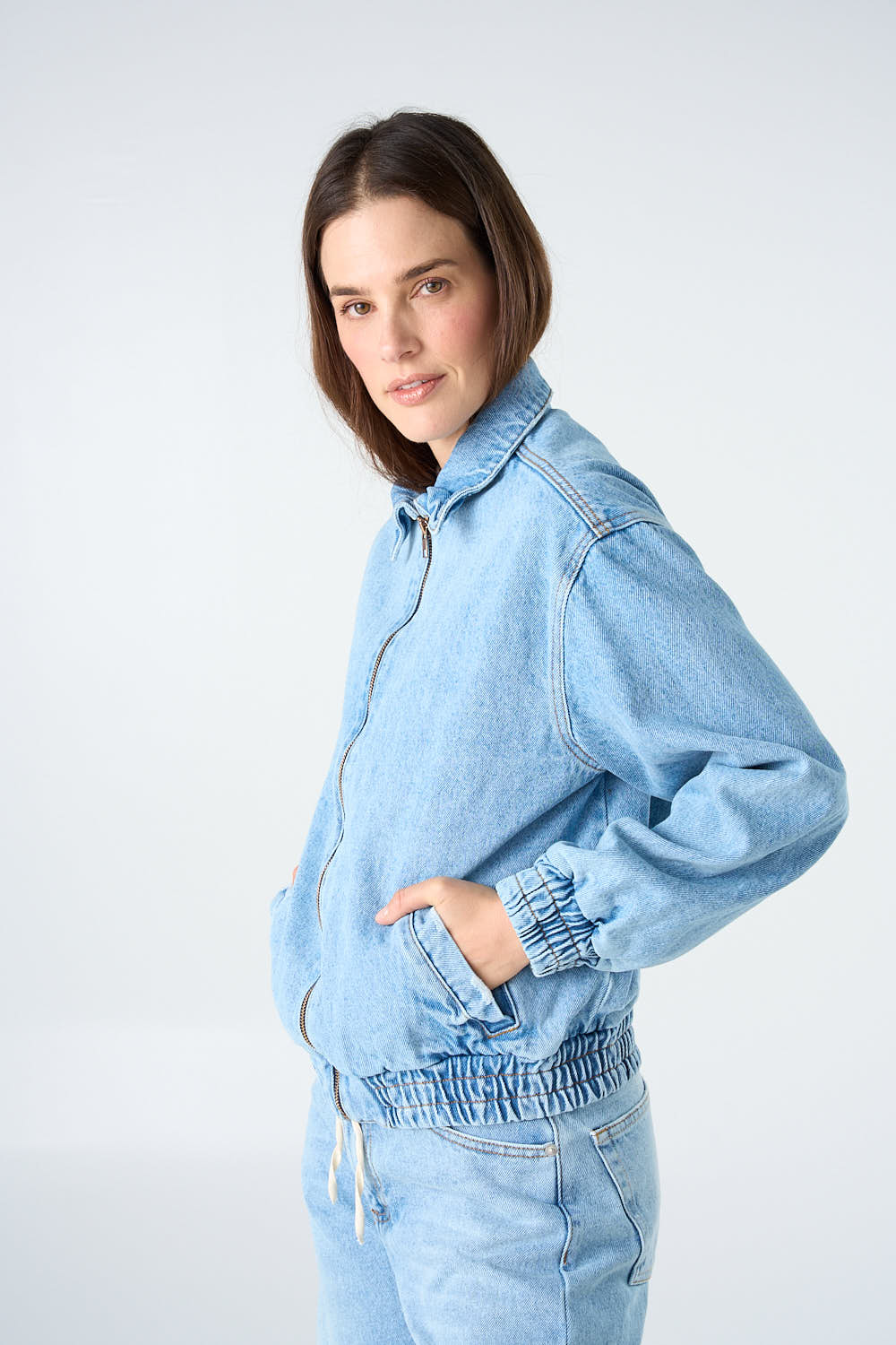 Oversized bomber jacket in light-wash denim. Zip closure. 100% cotton.