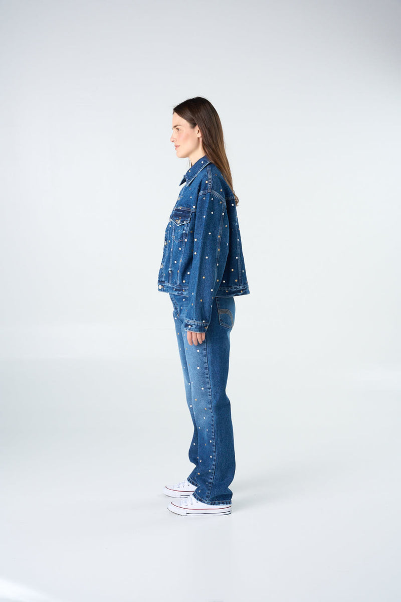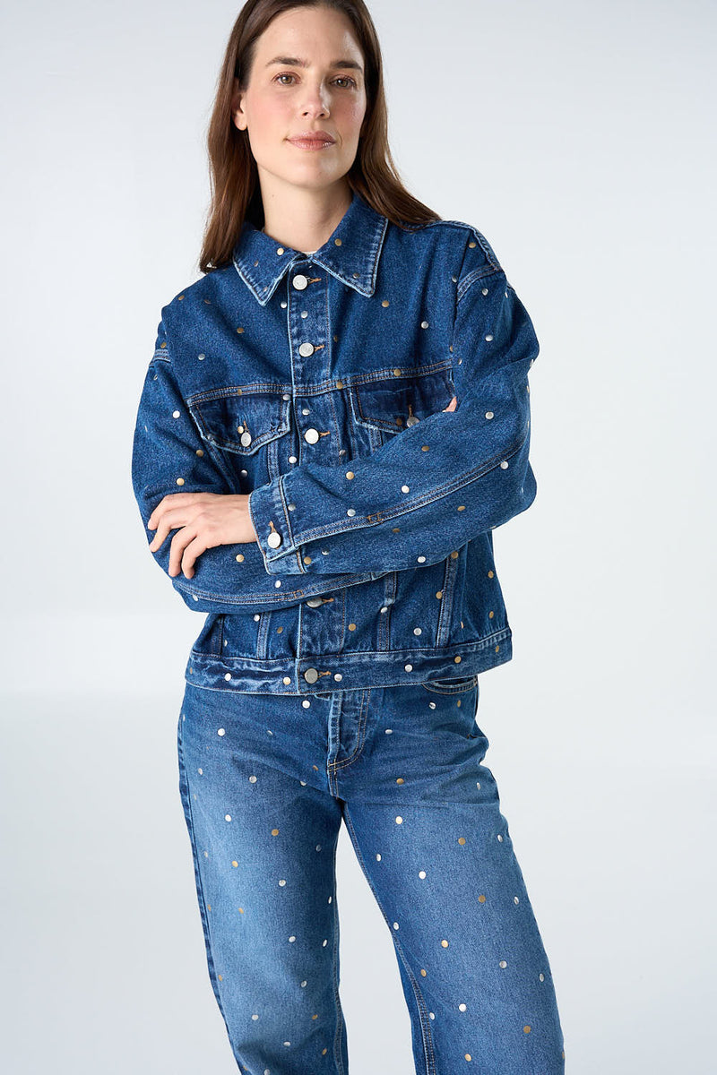 Dark denim jacket with flat silver and ochre studs. Button closure. 100% cotton.