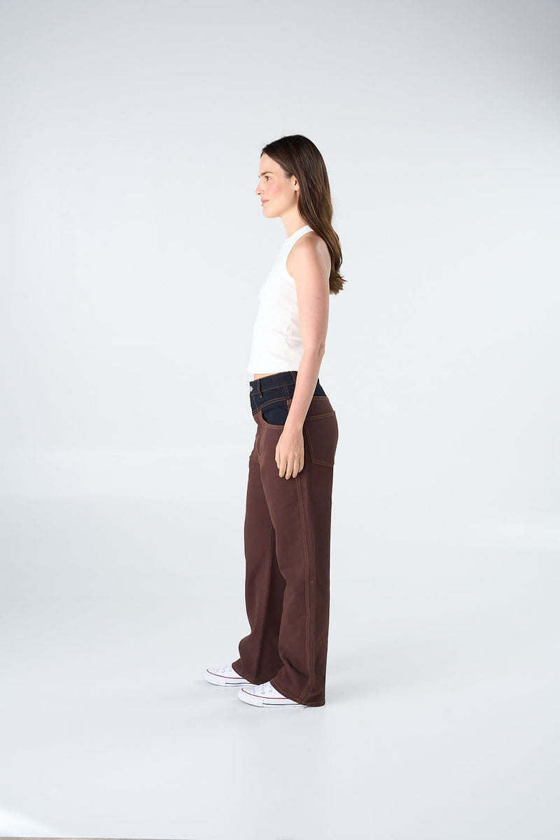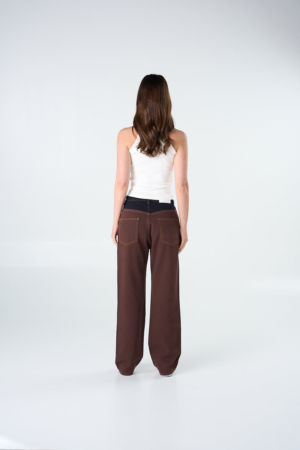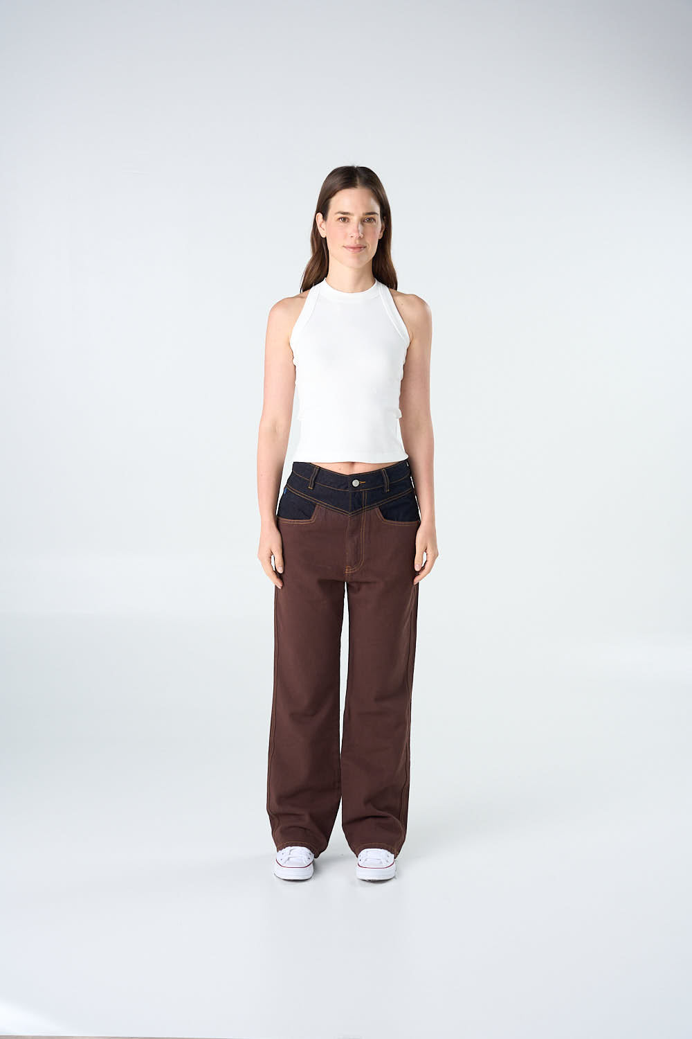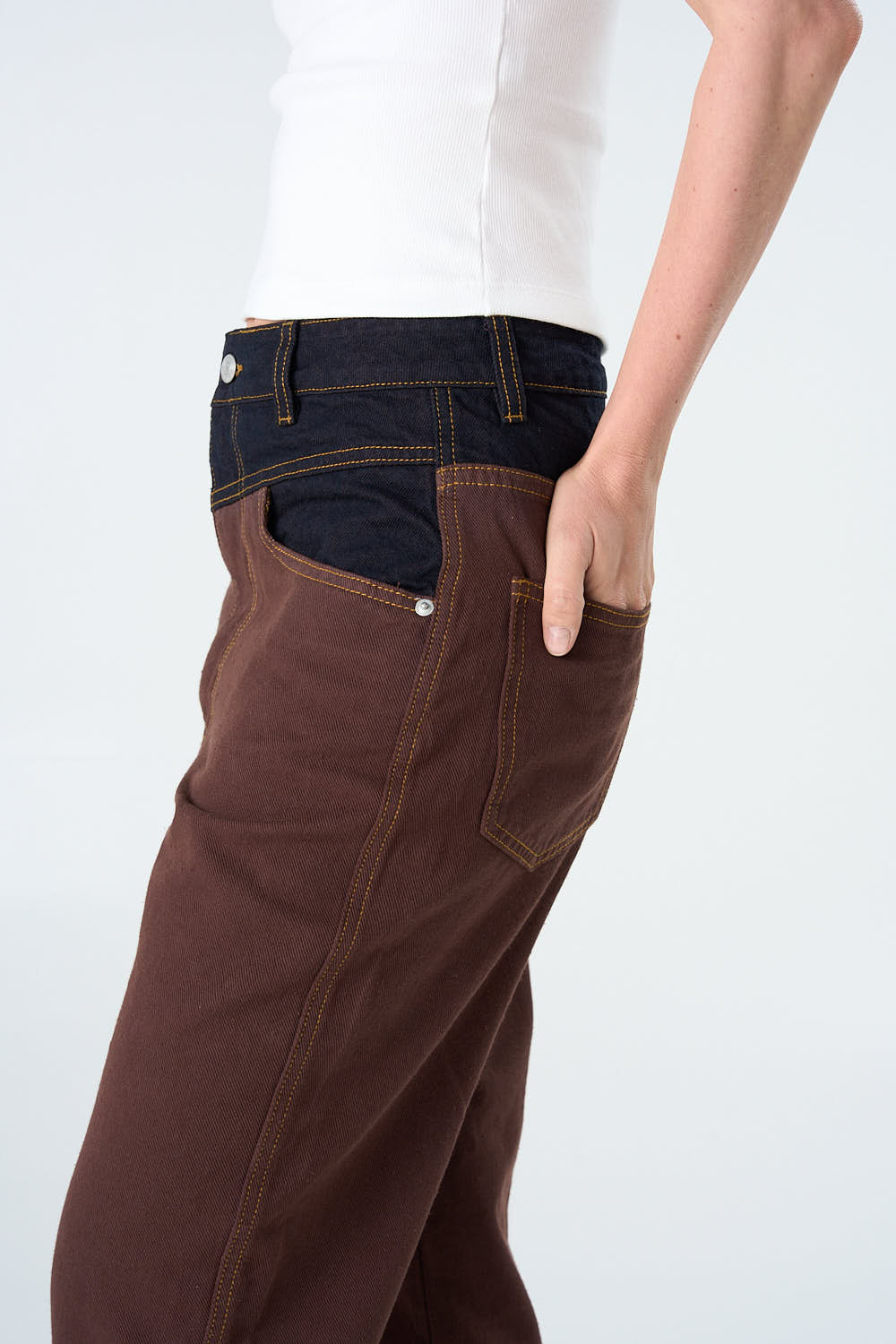 Straight jean in dark indigo with dark chocolate denim panels. Finished with a straight leg and zip closure. 100% cotton.