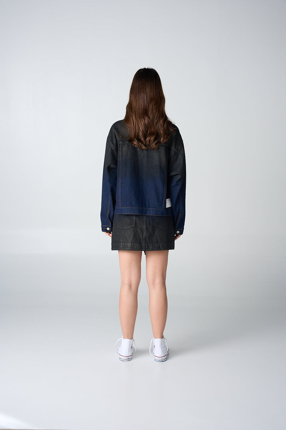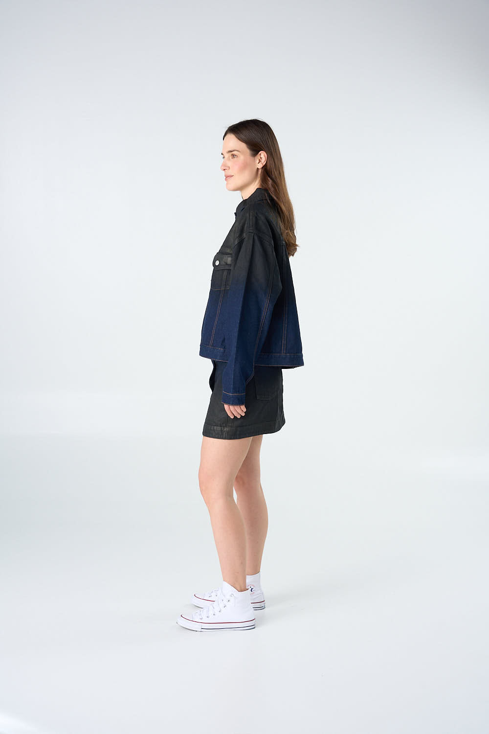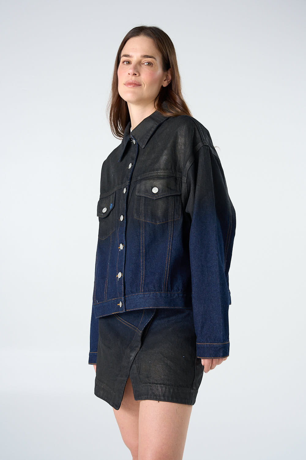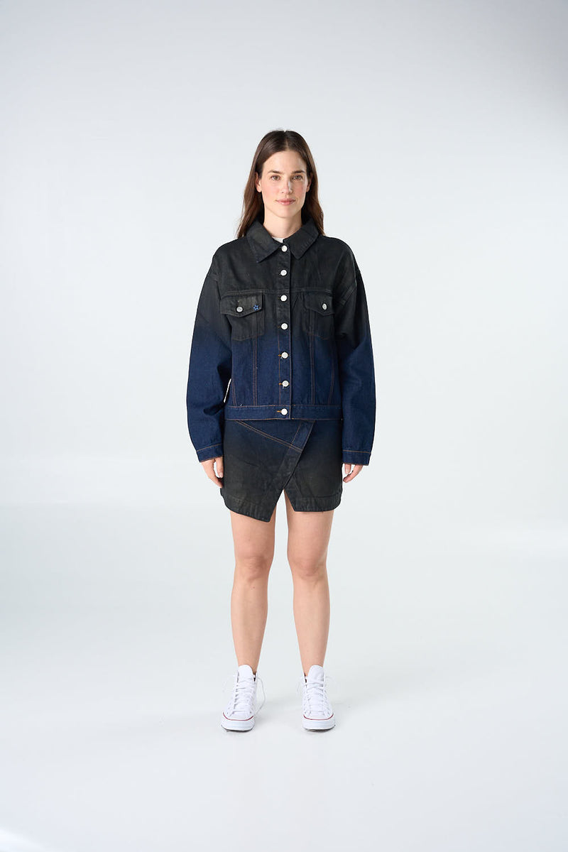 Dark blue denim jacket with a leather-effect gradient fading top to bottom. Button closure. 100% cotton.
