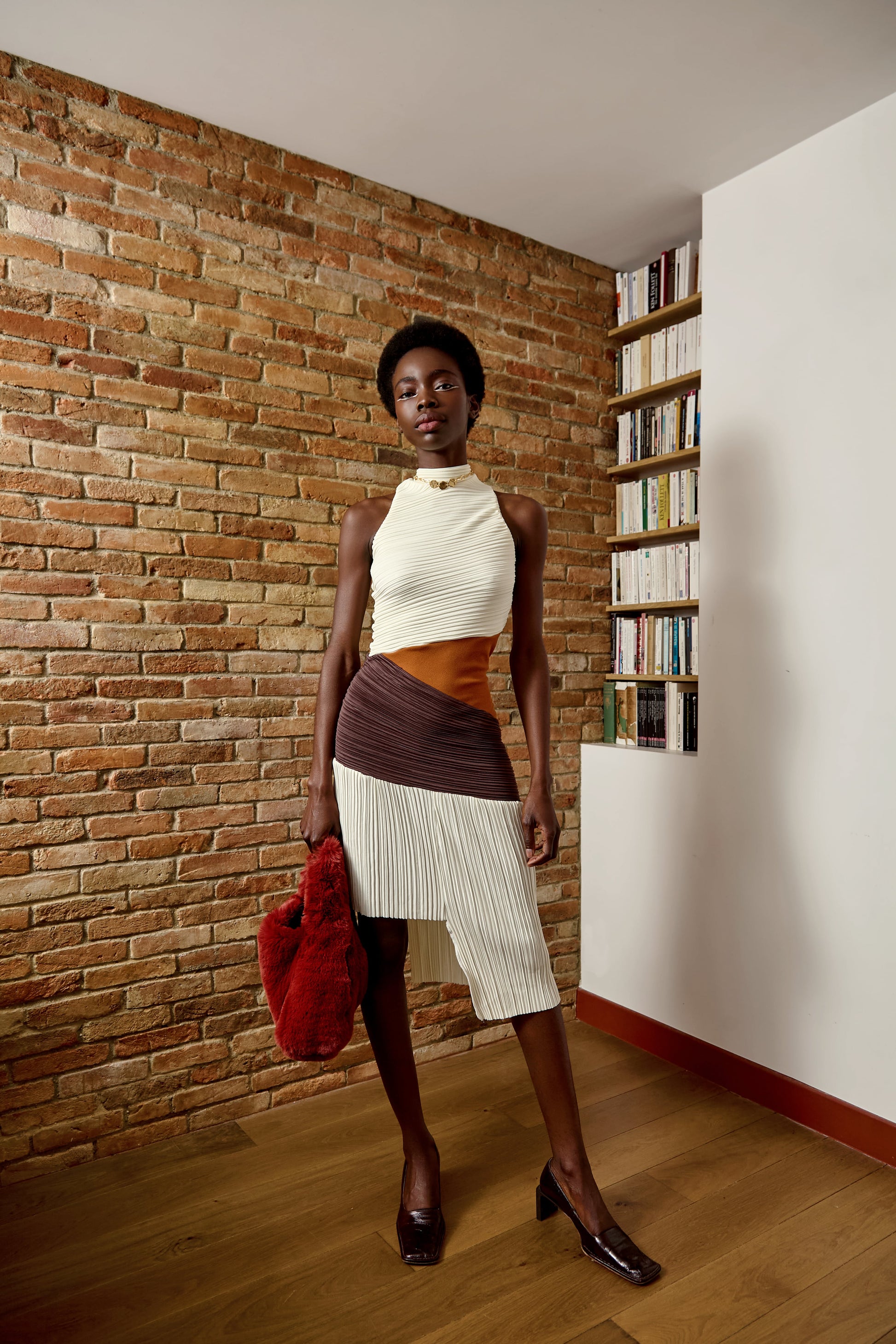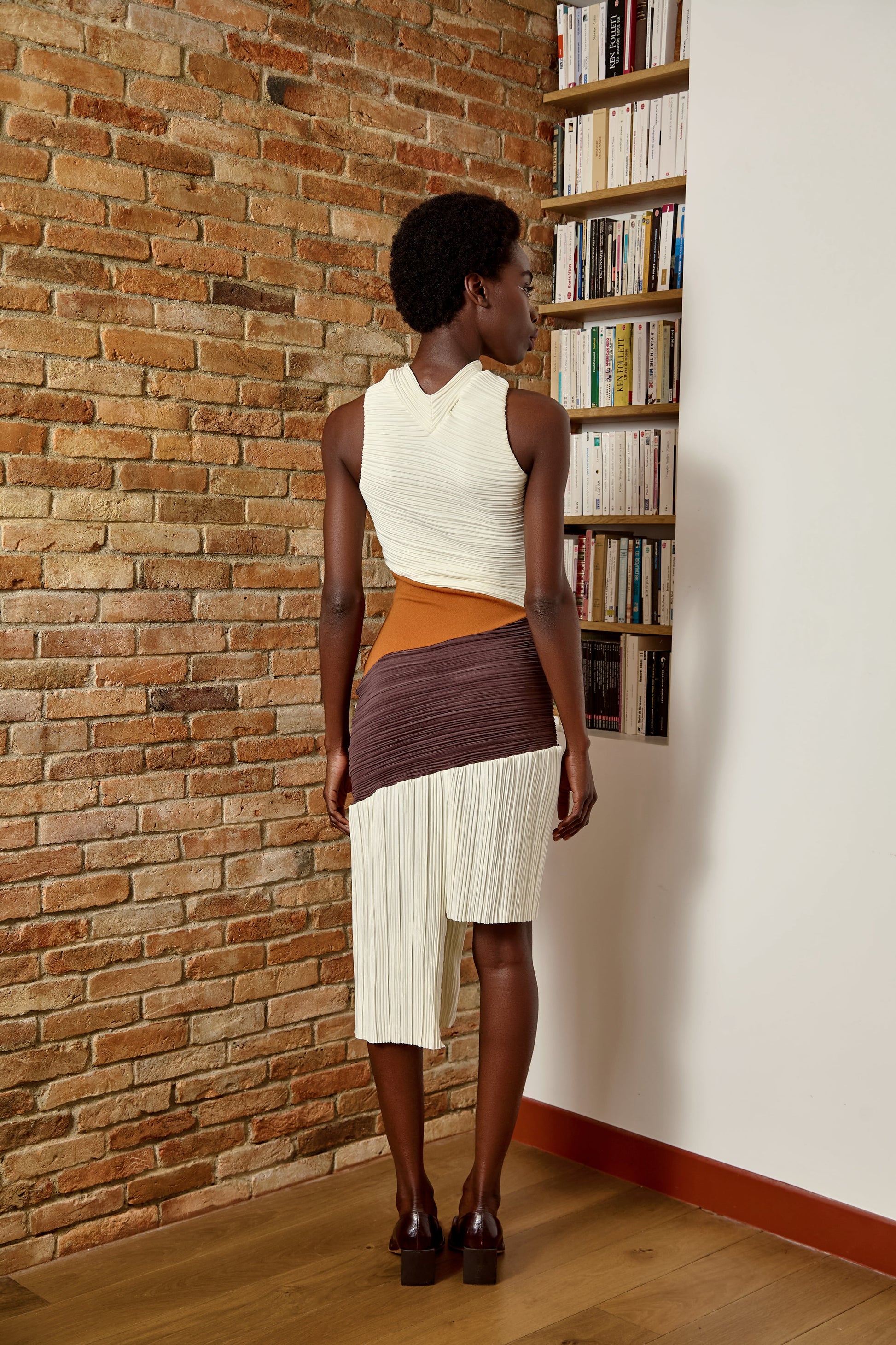 Asymmetrical dress, mixed materials: pleated and draped fabric. Three-tone, available in 2 color options.
