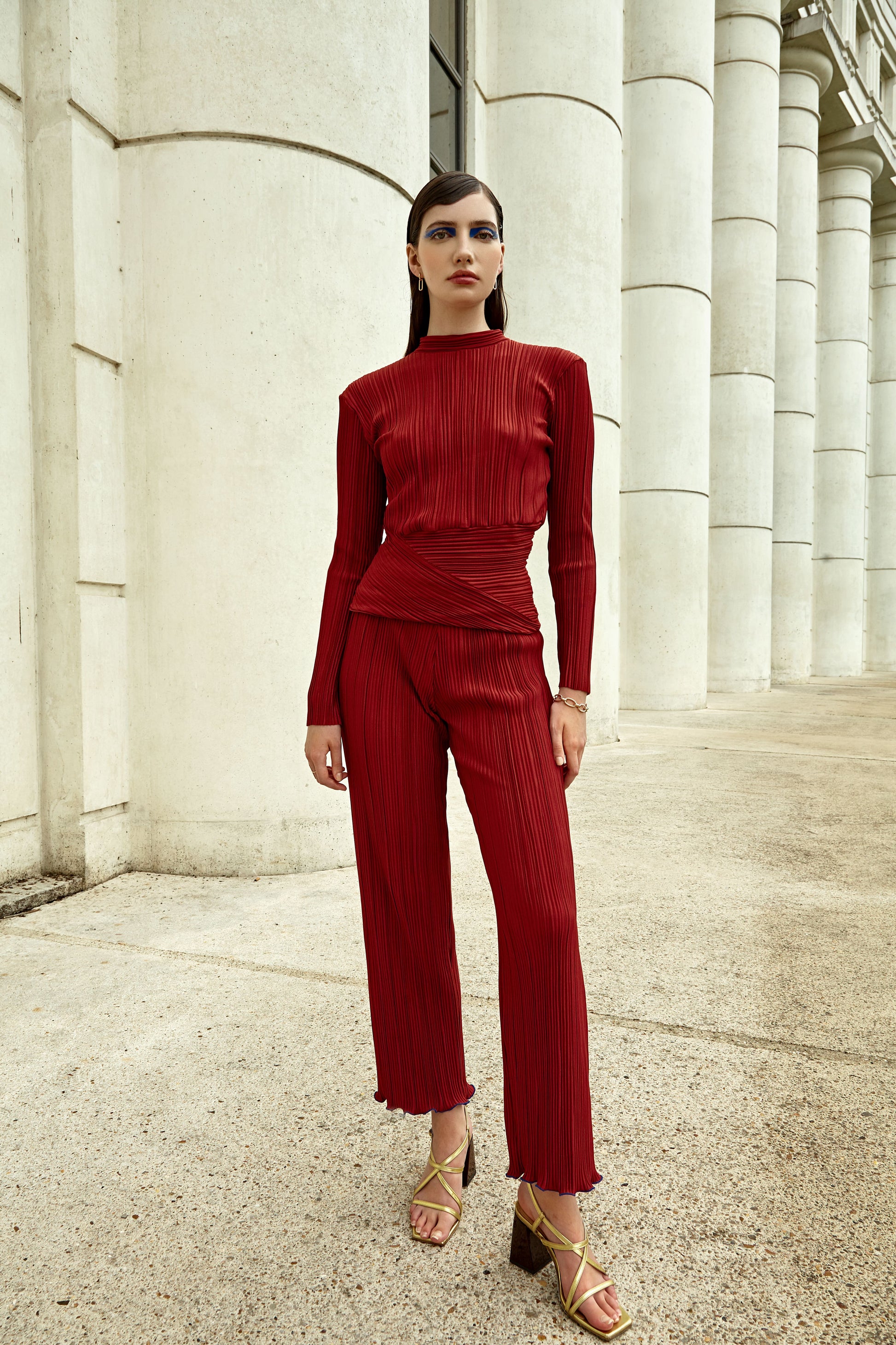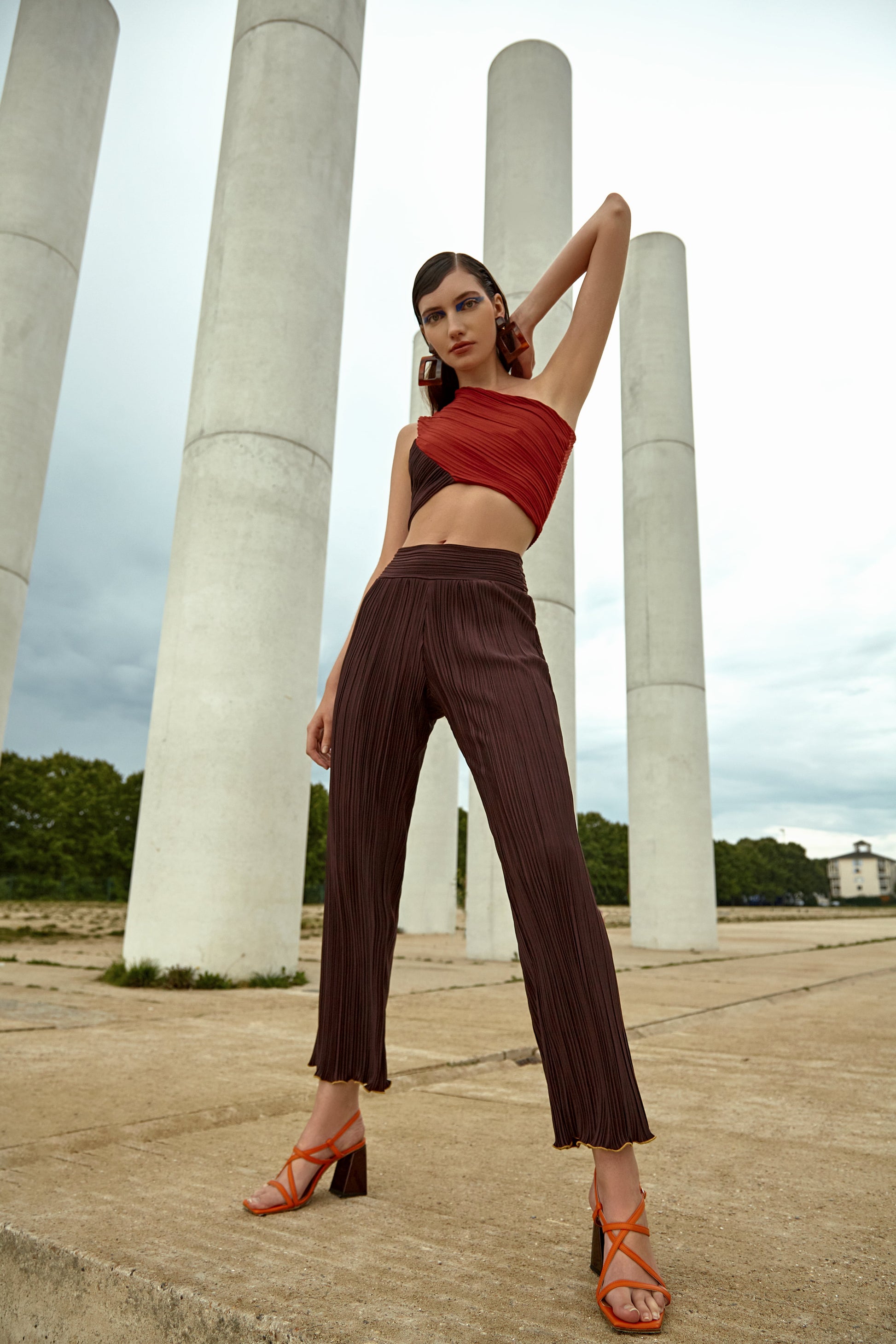 High-waisted pleated pants with elastic waistband and delicate finish in a contrasting hue. Available in a choice of 3 colors.