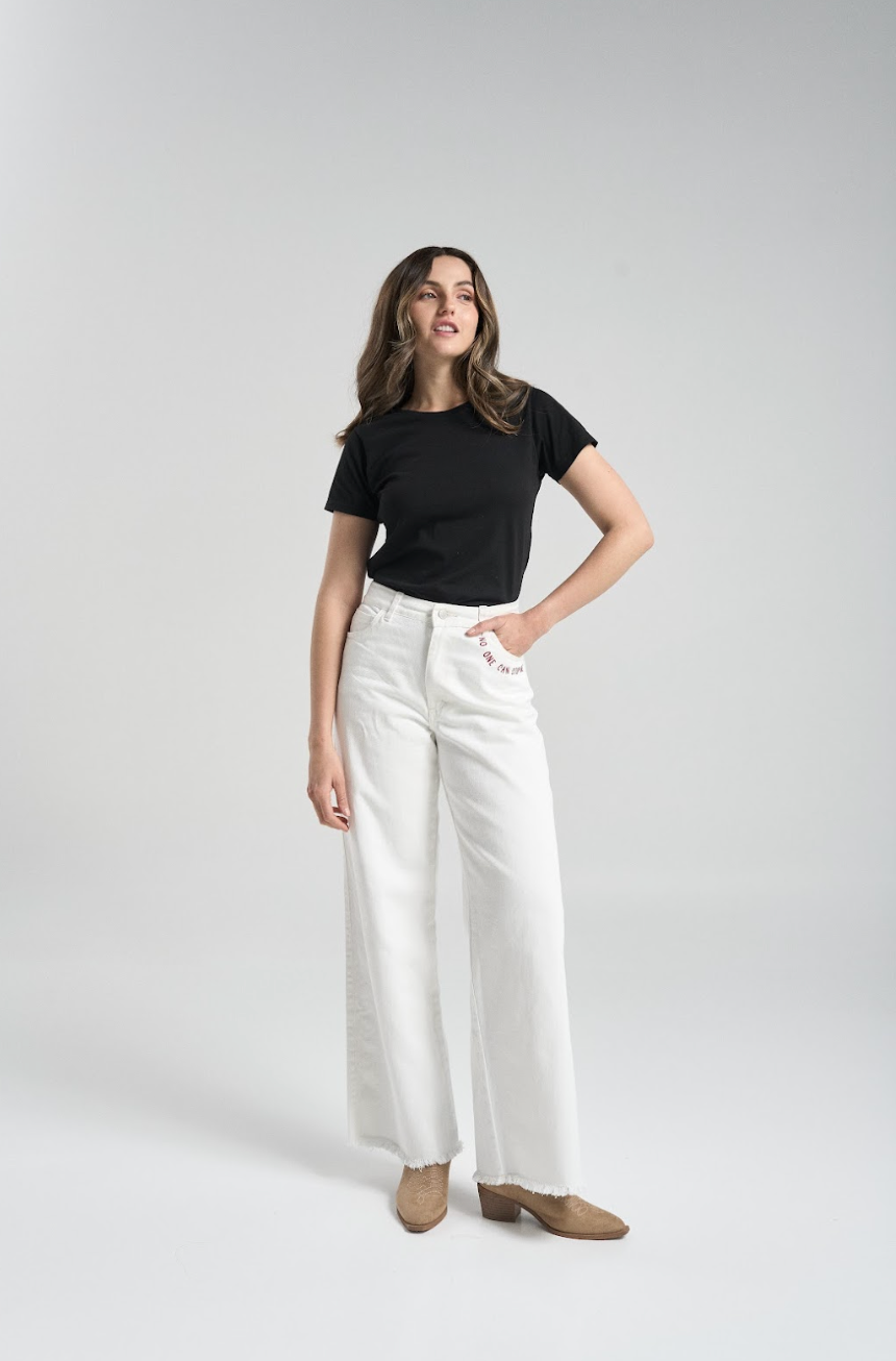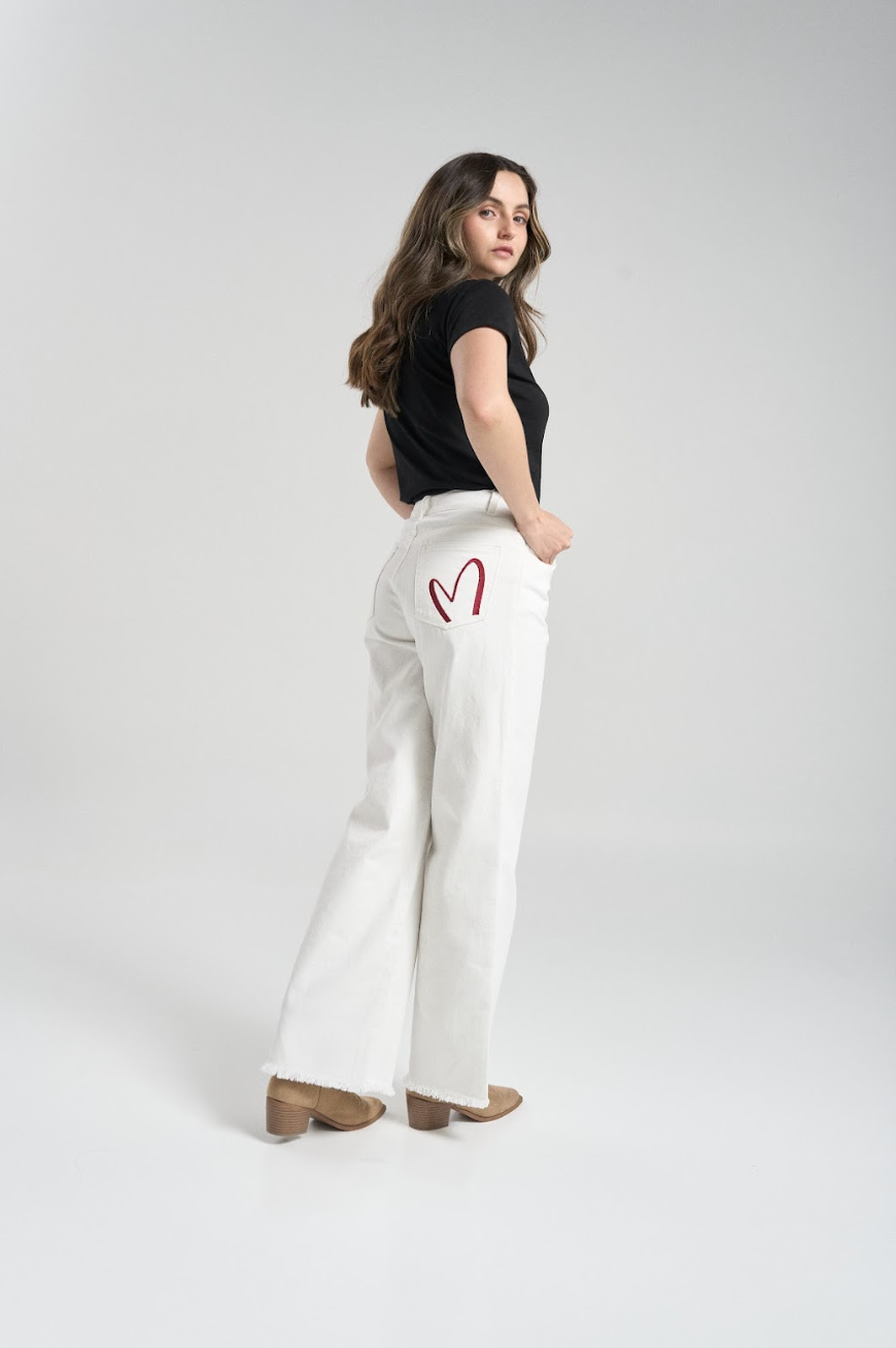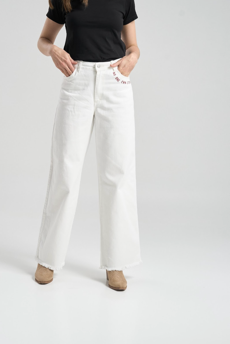 White high-waisted wide leg jean with five pockets. Straight leg with seamless finish. Front zipper and metal button closure. Embroidery on the front and back pocket.