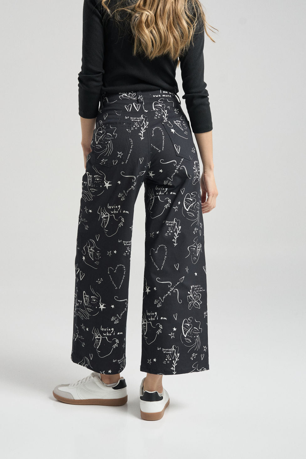 Black pants with a 'Love yourself' print. Culotte fit with high rise and pockets. The waist and hips fit naturally to the body.