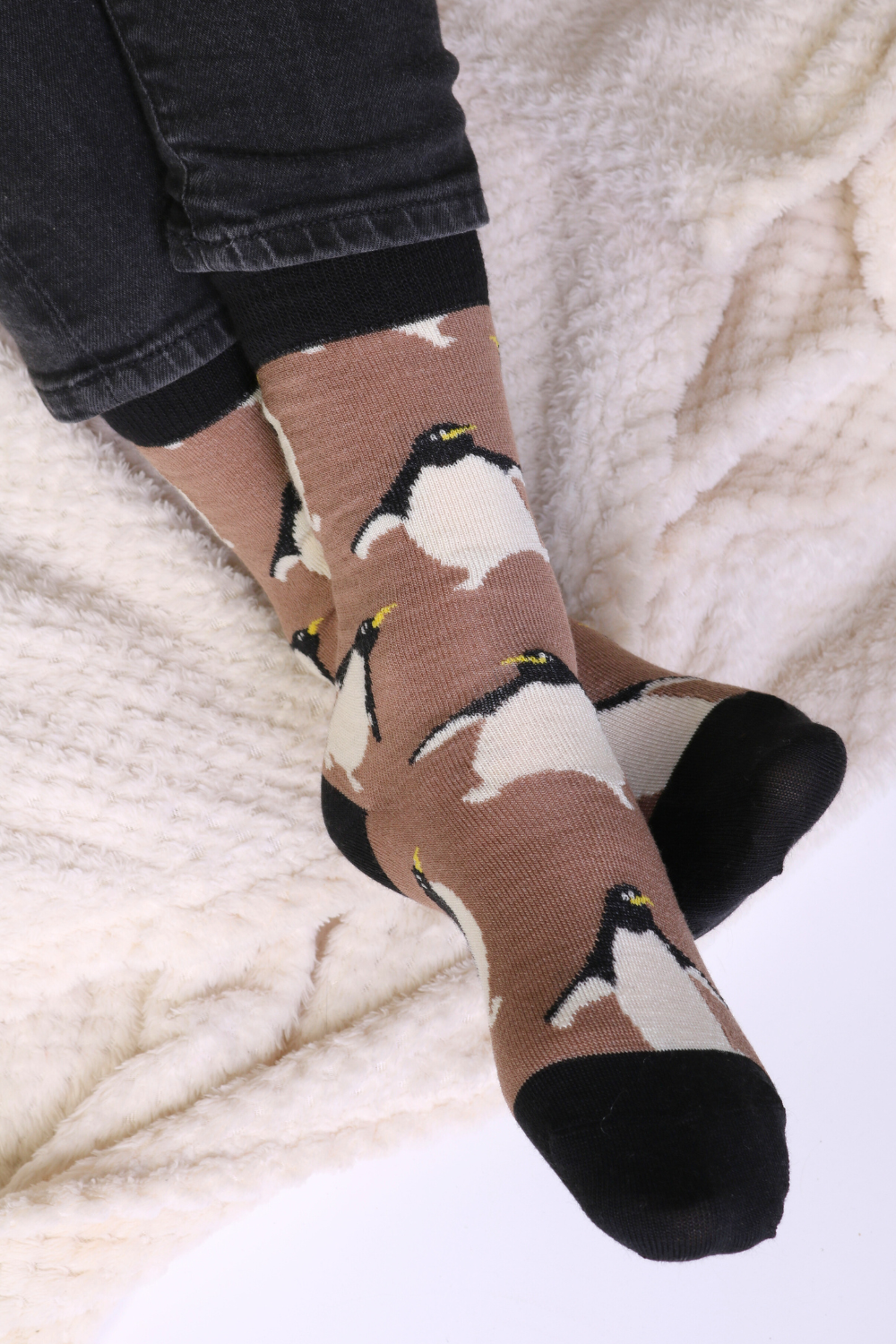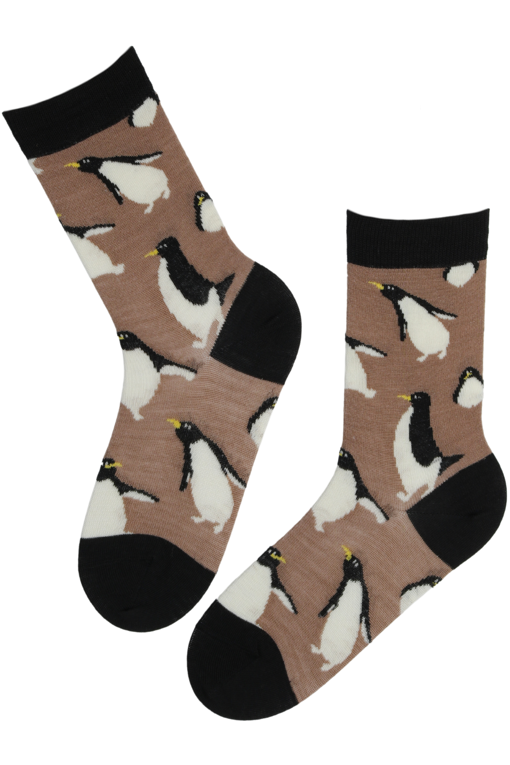 Brown socks with cute penguins. Keep your toes warm with merino wool socks!