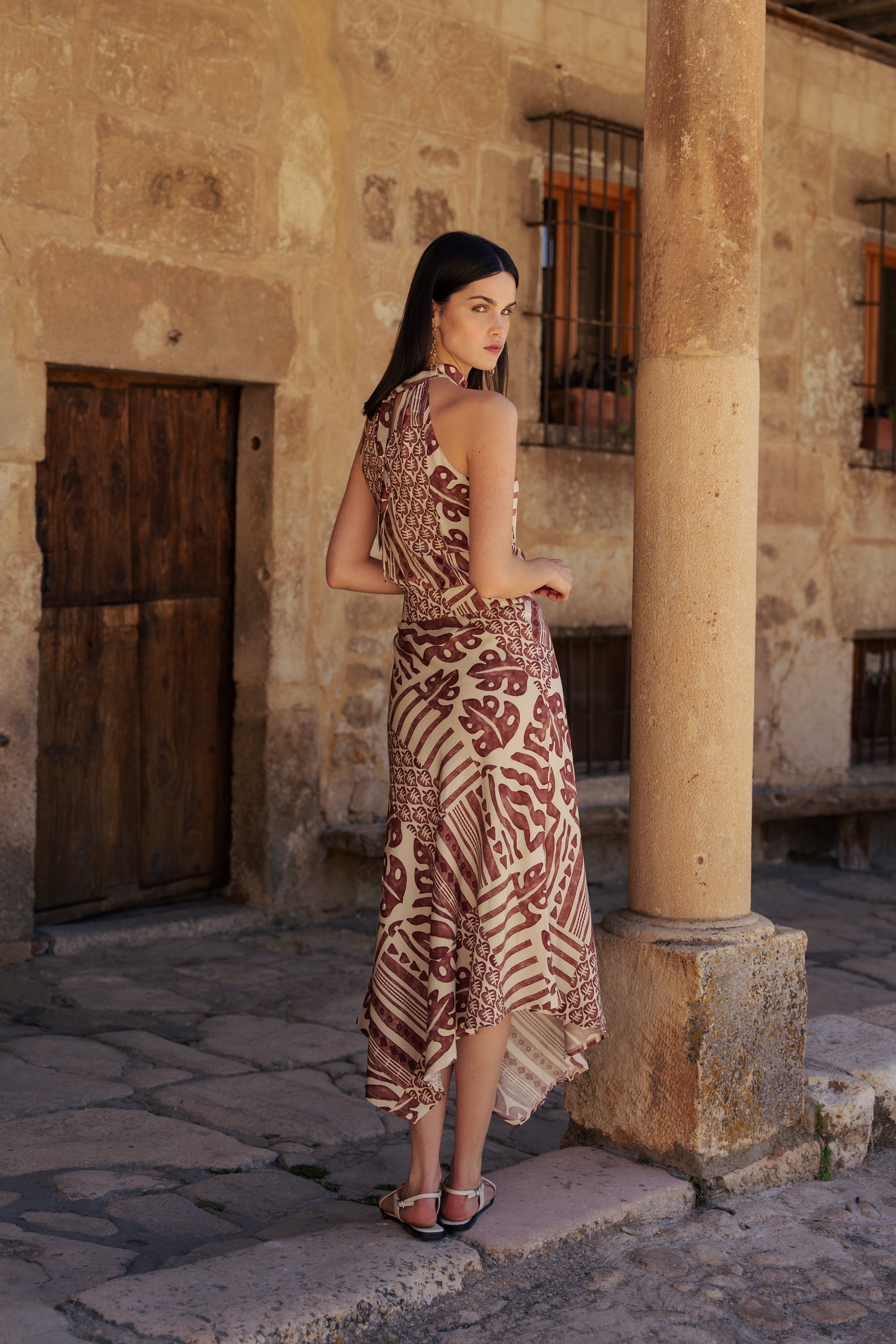Midi skirt with an asymmetrical hem, made from terracotta and beige printed fabric. Zipper closure