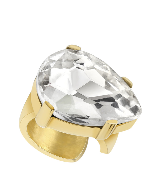 Made of rhodium-plated brass and topped with a large crystal in the center. Nickel free.