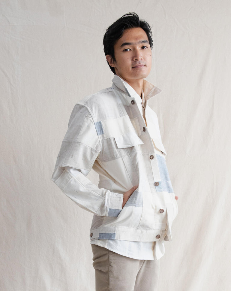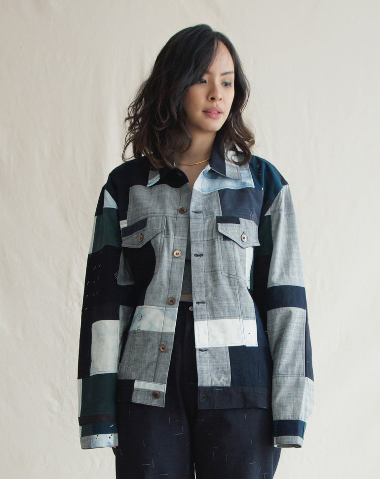 Our iconic denim jacket is design with freedom of expression. The unique Patchwork gives a second life to our offcuts. Each piece carefully cut and sewn together to make the most of our precious natural dye fabric.