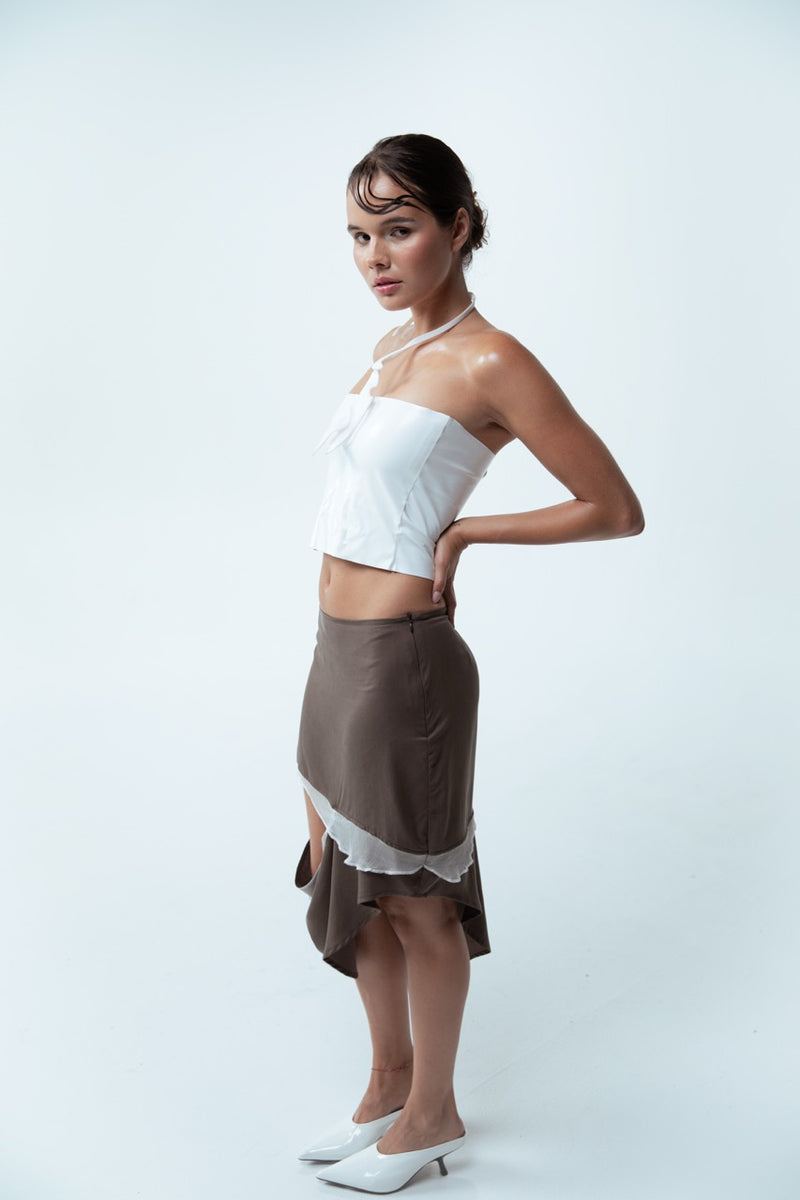 Made from deadstock lyocell and trimmed with deadstock crinkle silk chiffon, the Tidepool Skirt features an asymmetrical, split hem with openings at the front and back sides. A side tie allows you to adjust the gap, and a side invisible zipper provides a clean closure. Inspired by tidepools, this skirt reflects the shifting balance between water and rock through its layered construction.